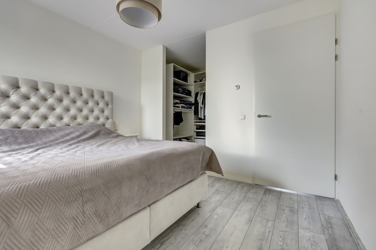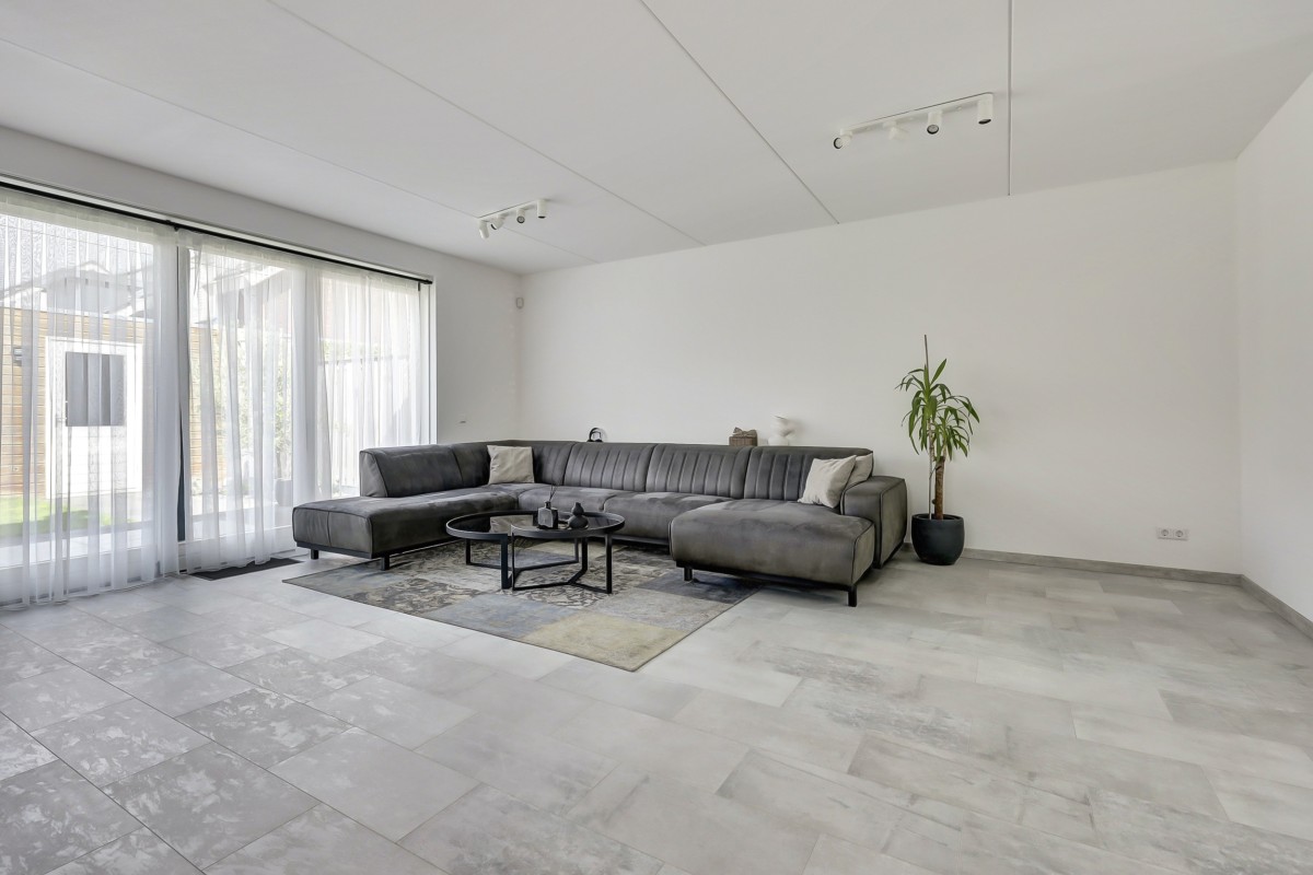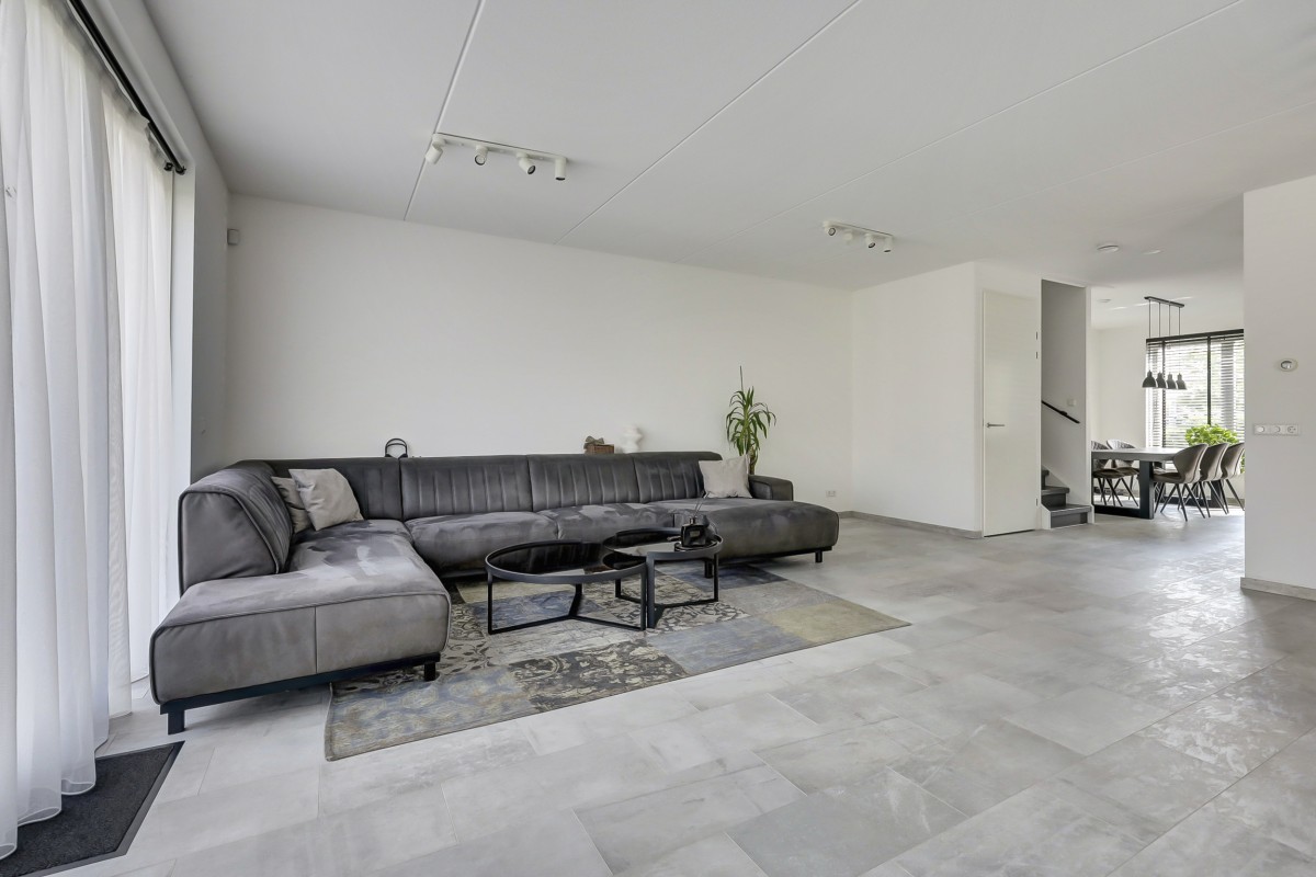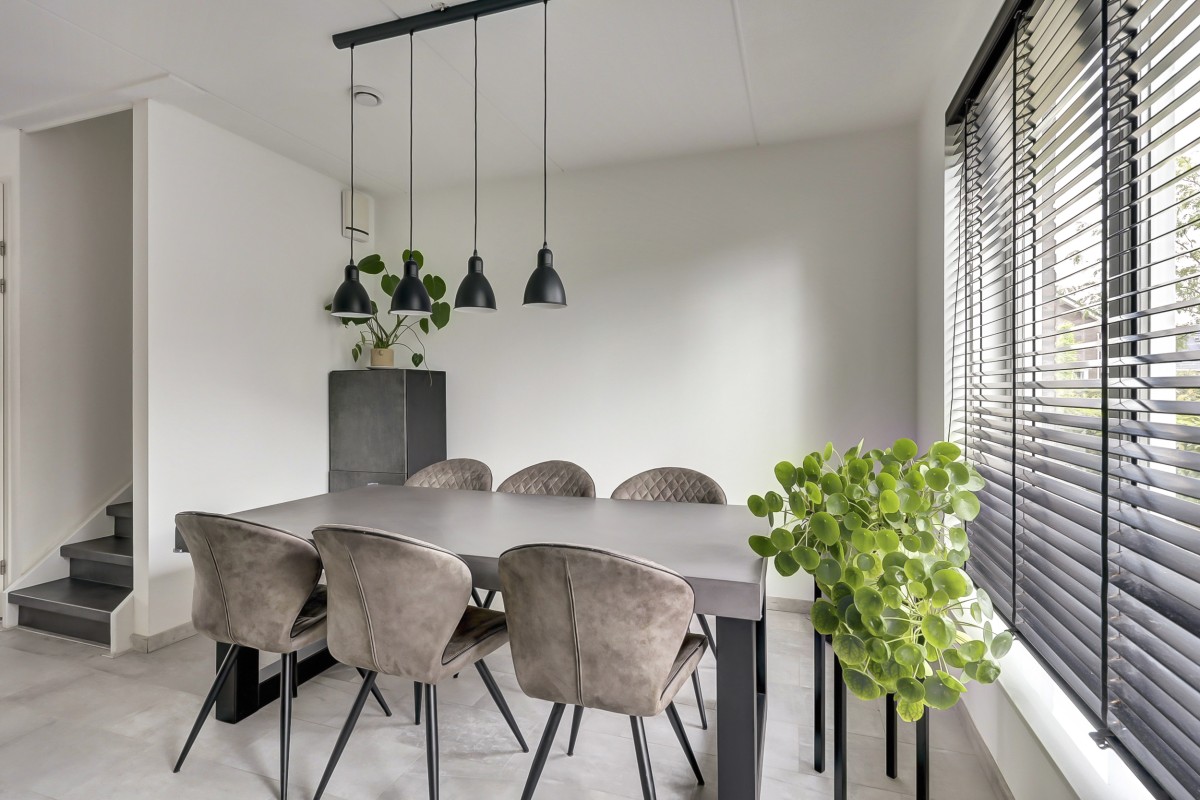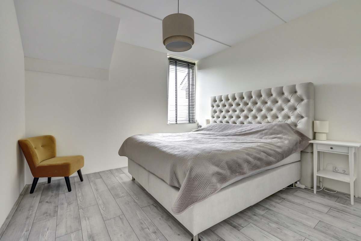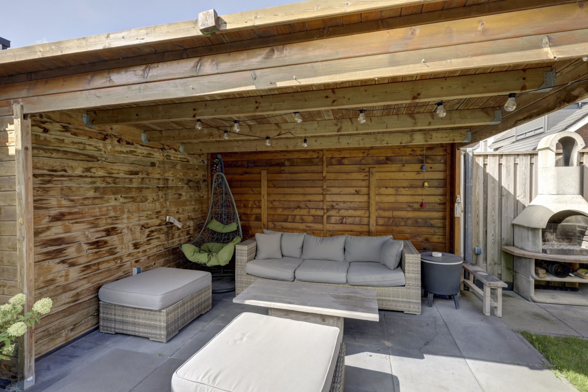 Ground floor: entrance with extensive meter cupboard, wardrobe, luxury toilet room with wall-mounted toilet and washbasin. The large garden-facing living room spans the entire width and features sliding doors and a beautiful fireplace. The large eat-in kitchen is situated at the front of the house, where the luxury built-in kitchen is equipped with a wall of cupboards and a kitchen island. The kitchen features a built-in dishwasher, 5-burner gas hob, refrigerator, freezer, microwave, and oven. Partly due to the width of the house, the dining area is very spacious and is illuminated by beautiful natural light from the street. A large staircase with storage space separates the living and dining areas. This provides the living room with more privacy at the rear. At the back of the house, a wide sliding door provides access to the garden. The garden is well-maintained and low-maintenance, and is also accessible along the side of the house. The garden faces west and features a detached wooden shed and a covered patio. The entire ground floor is equipped with underfloor heating and modern laminate flooring.