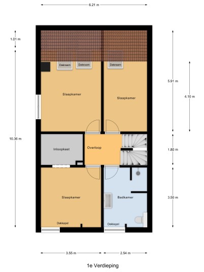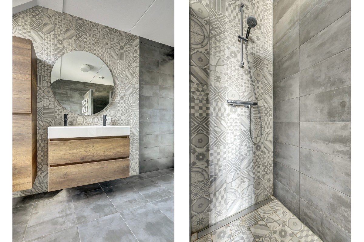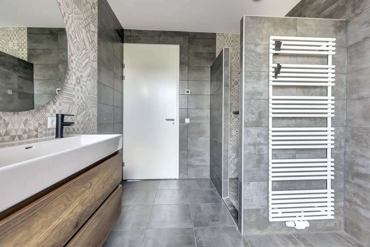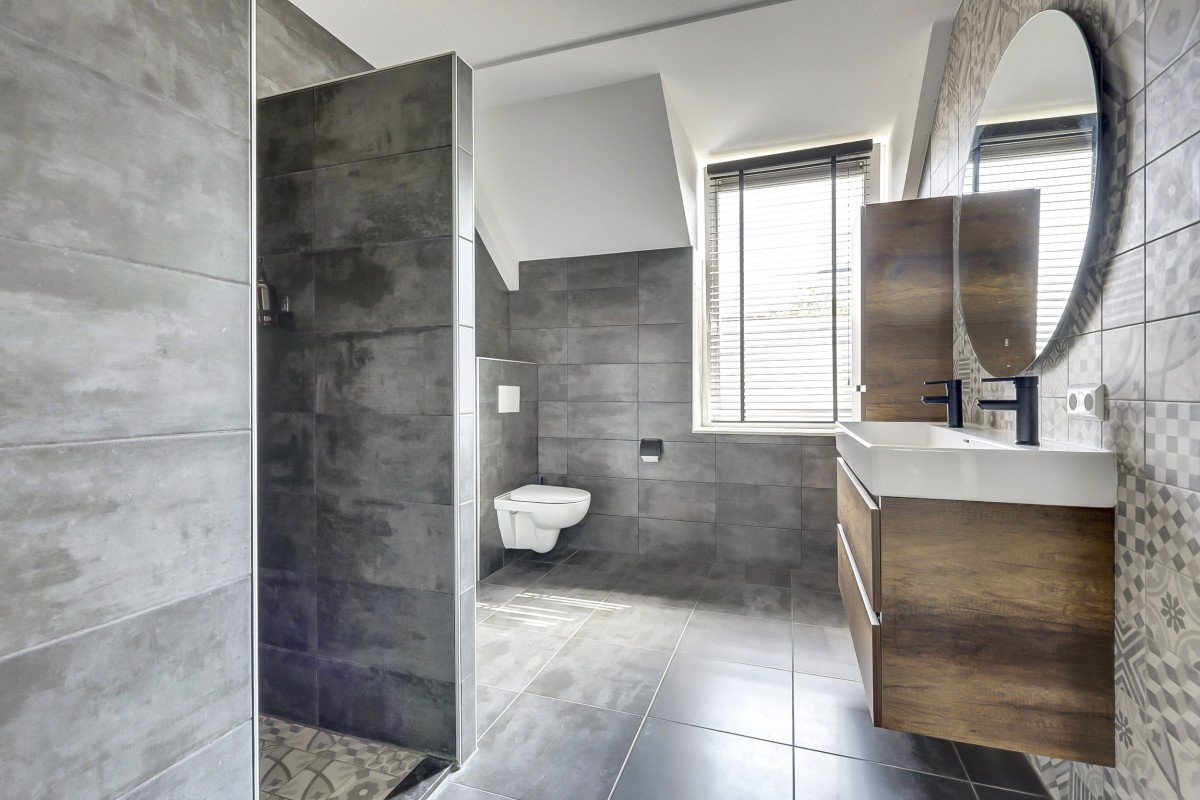 First floor: spacious landing with three beautiful bedrooms and the modern bathroom adjacent to it. The spacious master bedroom is located at the front of the house and features a dormer window and a generous walk-in closet. At the rear, there are two beautiful bedrooms equipped with synthetic skylights. The luxurious bathroom is fully tiled with beautiful modern tiles and features luxury sanitary ware. A large walk-in shower with a designer finish, a second wall-mounted toilet, and a double sink complete the bathroom. This floor is also fully equipped with underfloor heating, and the landing and bedroom feature beautiful laminate flooring.