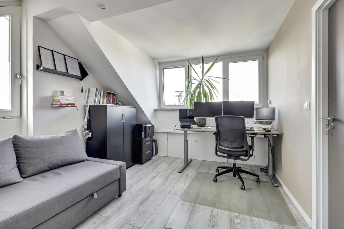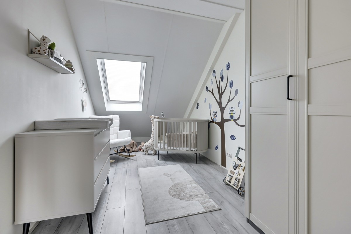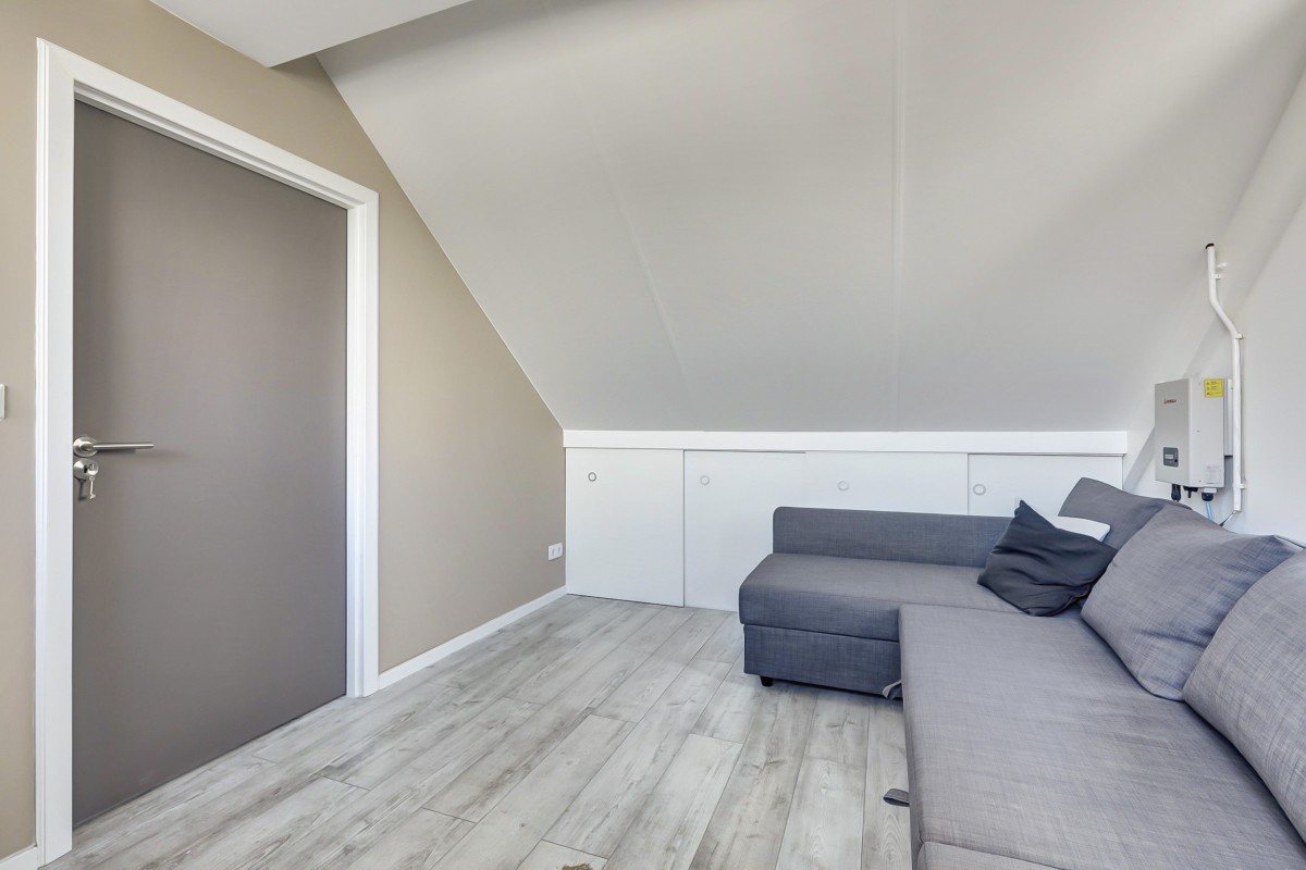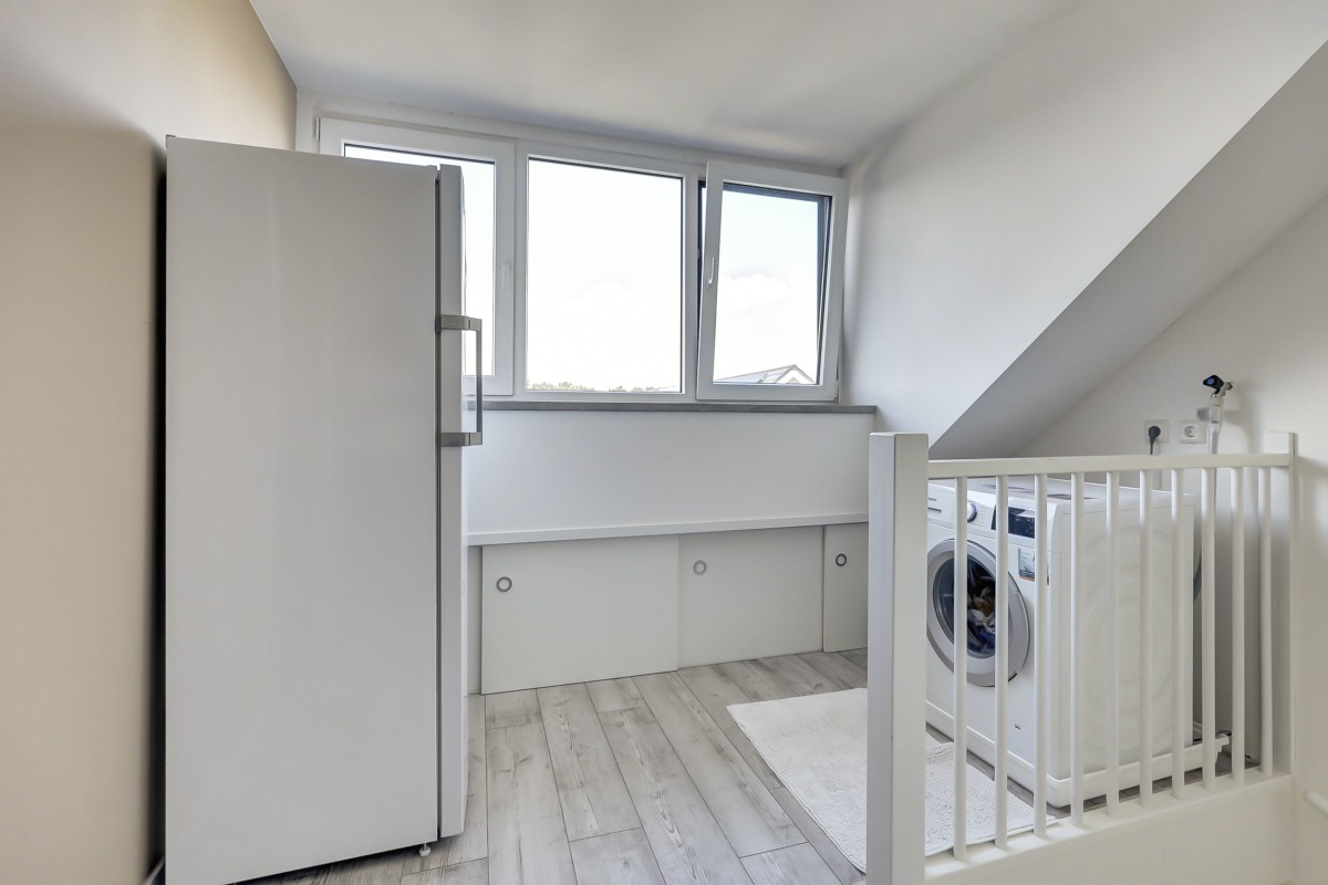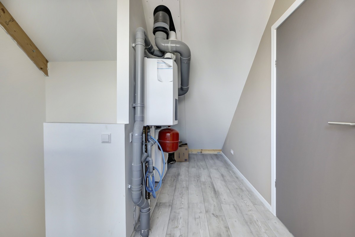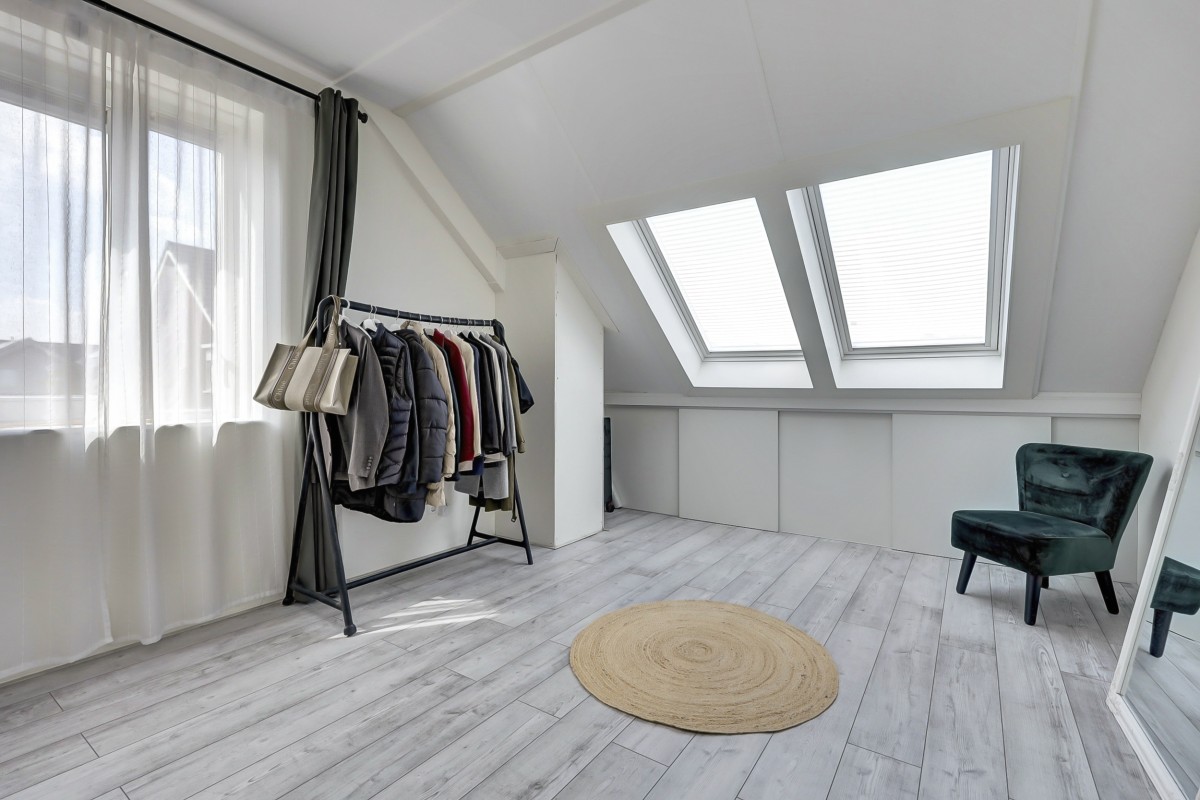 Second floor: the spacious attic, where a beautiful, bright sleeping area is situated, can be reached via a fixed staircase. This floor features a dormer window at the rear of the house with insect screens and roller shutters spanning the maximum width of the home, allowing the bedroom and landing to receive a particularly large amount of light. Additionally, the washing machine, central heating boiler (Atag HR 2017), mechanical ventilation, and inverter for the solar panels are located in the landing.