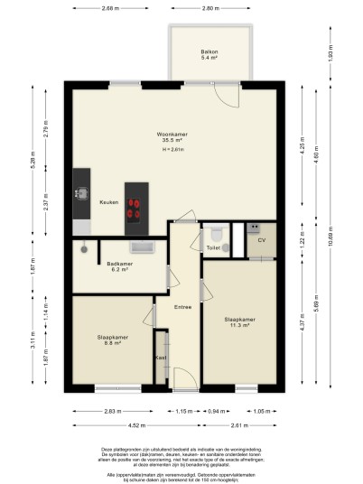 Entrance/hall with access to the 2 bedrooms, bathroom, separate toilet, and the living room with open-plan kitchen. The living room is very bright thanks to the large windows and the door to the balcony. The luxurious kitchen with a cooking island features white fronts and various built-in appliances, including a hob with integrated extractor hood, fridge-freezer, combination microwave oven, and dishwasher. The fully tiled bathroom includes a vanity with cabinet and a walk-in shower. The entire apartment has a neat PVC floor with underfloor heating.
