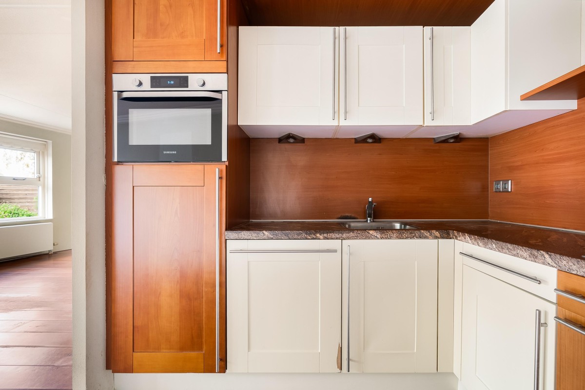 Entrance, hallway with access to the indoor storage room (with washing machine connection and door to the outside), toilet, fuse box, staircase to the upper floor, wardrobe niche, extra room with the potential to create a second bathroom, a spacious bedroom, and the living room. The large living room offers plenty of space for a sitting area and dining area. The kitchen is in an L-shape and equipped with various built-in appliances and a granite countertop. Through the French doors, you step into the delightful garden.