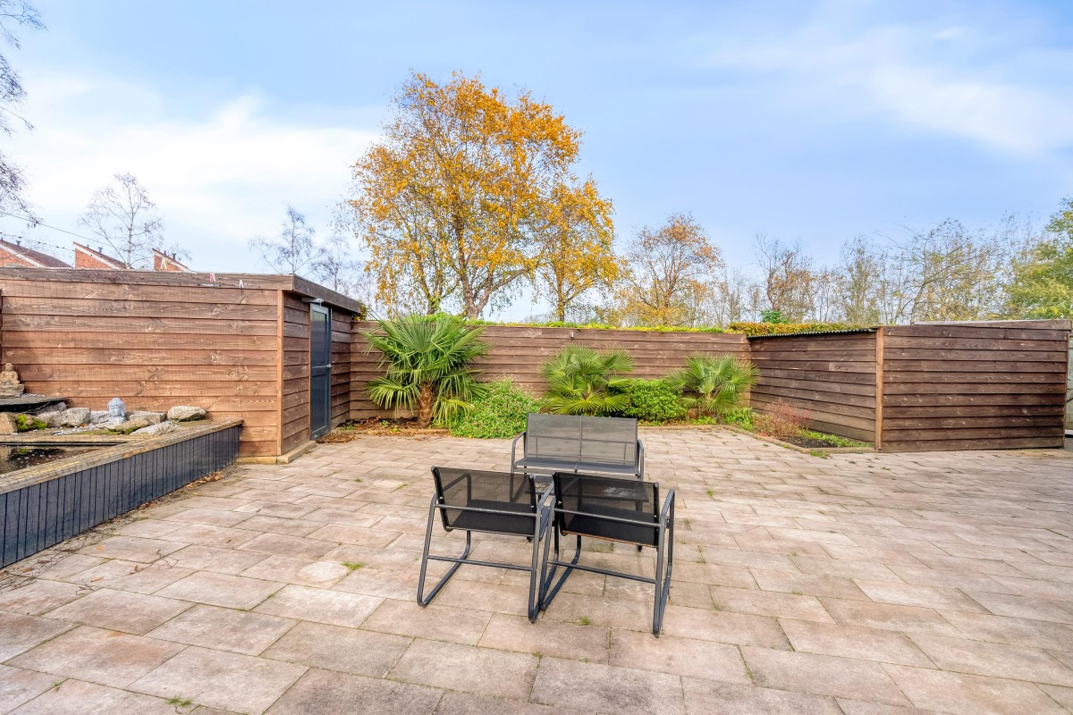 The garden is exceptional due to its circular shape "around the house," offering not only a cozy covered terrace but also two extra storage sheds. The fences provide great privacy, and whether you prefer sun or shade, there is a spot for everyone.