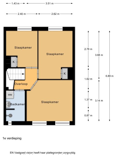 The staircase in the hall leads to the first floor. The landing provides access to all rooms. The largest bedroom is located at the front. Next to this room is the bathroom, which is equipped with a shower, sink, and a connection for a washing machine. At the rear, you will find the other two bedrooms, both of which are equipped with a built-in wardrobe.