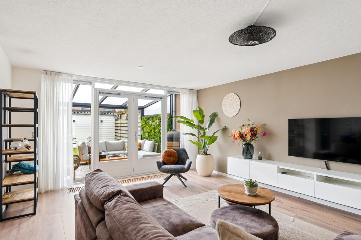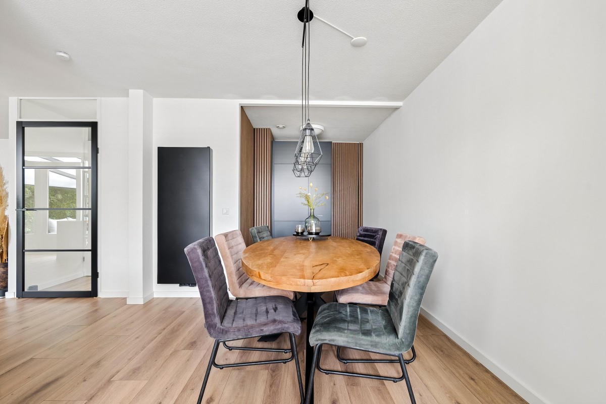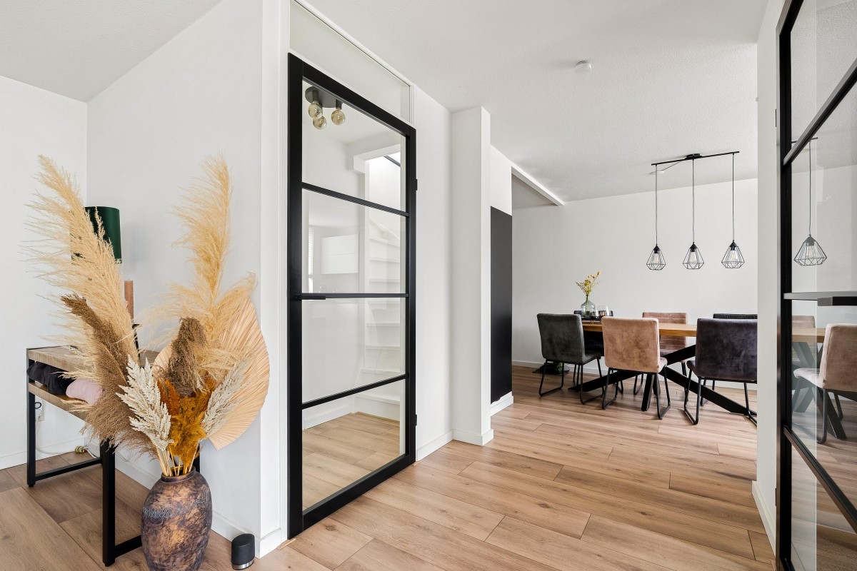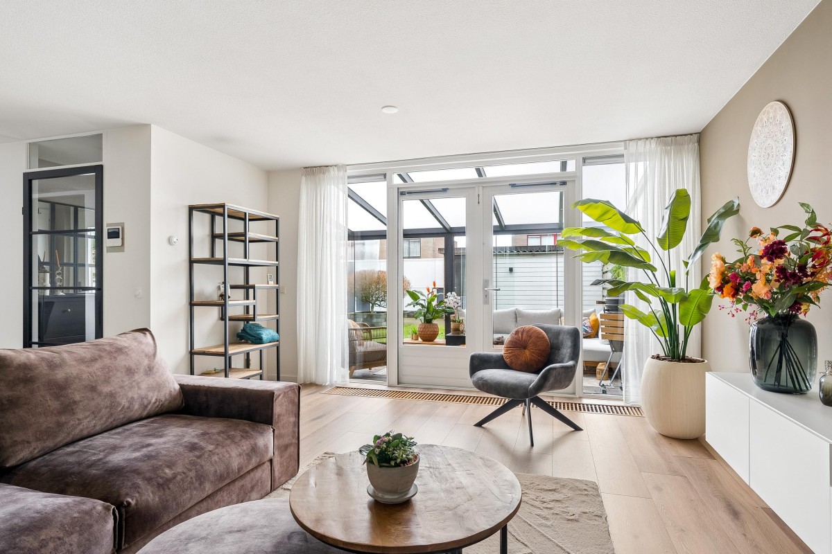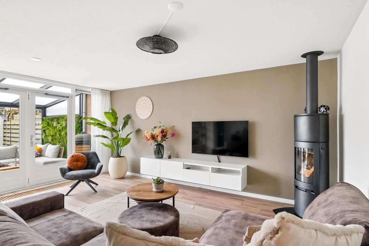Entrance/hallway with a coat closet and meter cupboard. The cozy, spacious living room with a wood-burning stove has two French doors leading to the conservatory. From this conservatory, sliding glass walls provide access to the front garden. The living room flows into the kitchen/diner. The modern fitted kitchen (2021 and 2023) is equipped with all necessary appliances and overlooks the garden. The kitchen offers ample storage space in several cupboards. A hallway with a toilet (2021) provides access to the first floor. The staircase is very bright thanks to the tall windows.