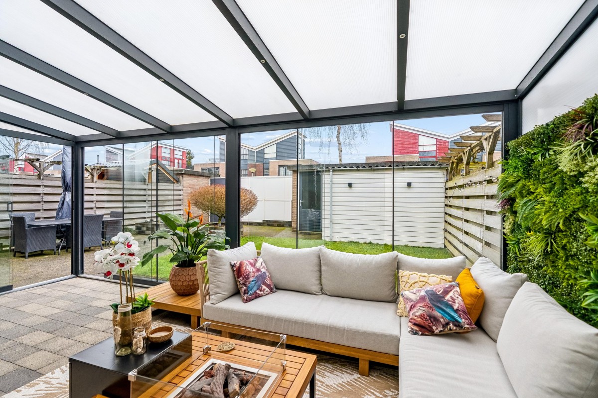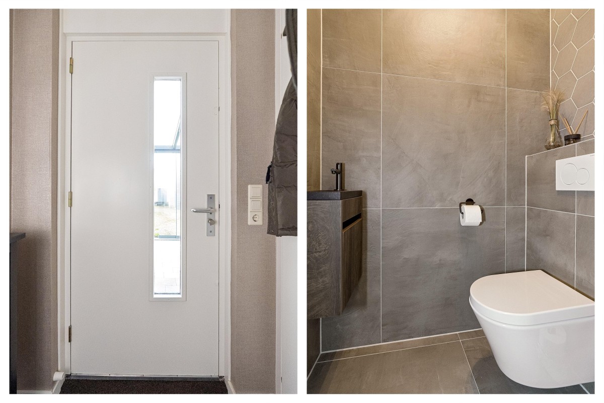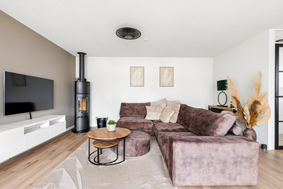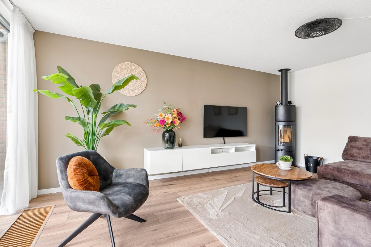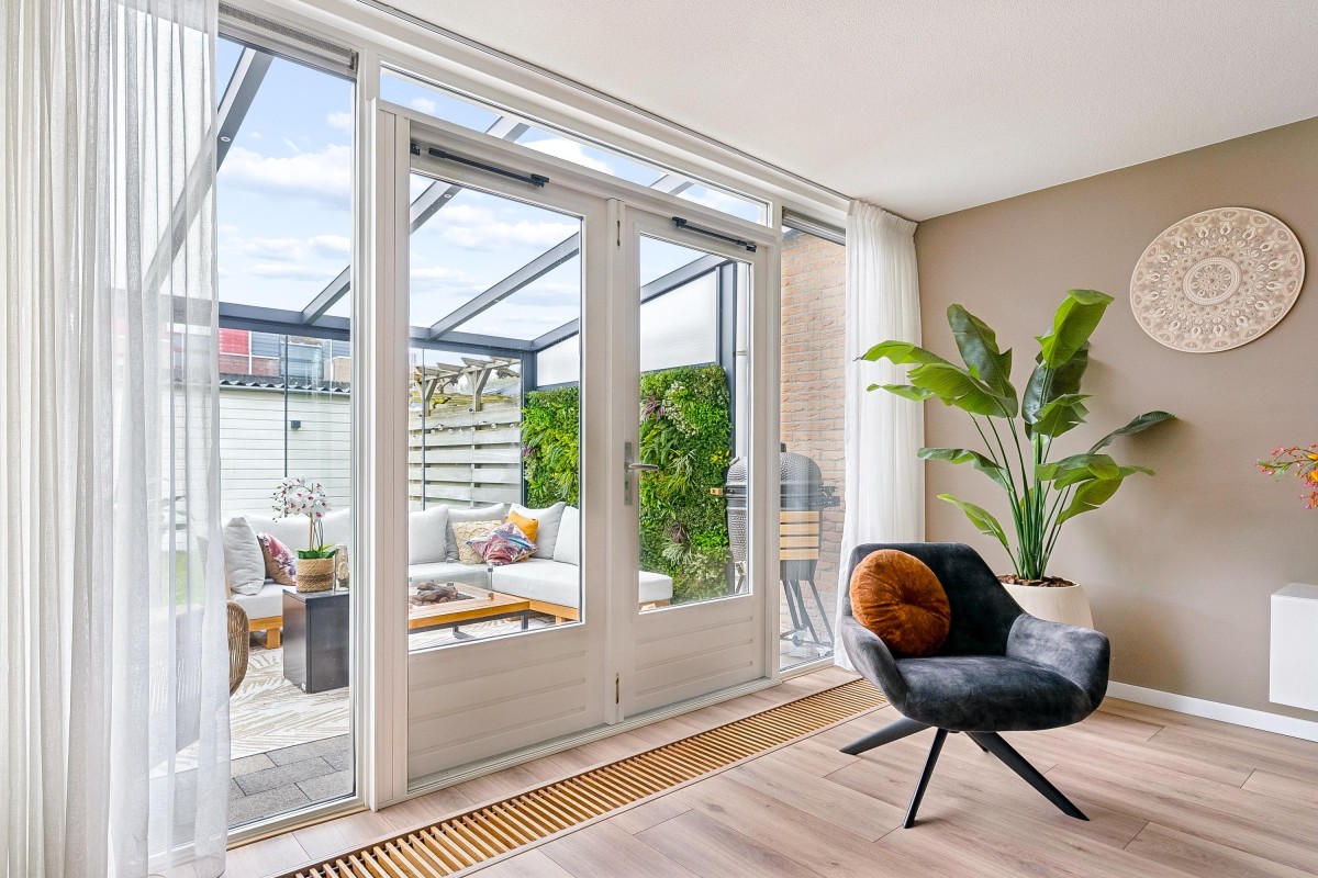 Entrance/hallway with a coat closet and meter cupboard. The cozy, spacious living room with a wood-burning stove has two French doors leading to the conservatory. From this conservatory, sliding glass walls provide access to the front garden. The living room flows into the kitchen/diner. The modern fitted kitchen (2021 and 2023) is equipped with all necessary appliances and overlooks the garden. The kitchen offers ample storage space in several cupboards. A hallway with a toilet (2021) provides access to the first floor. The staircase is very bright thanks to the tall windows.