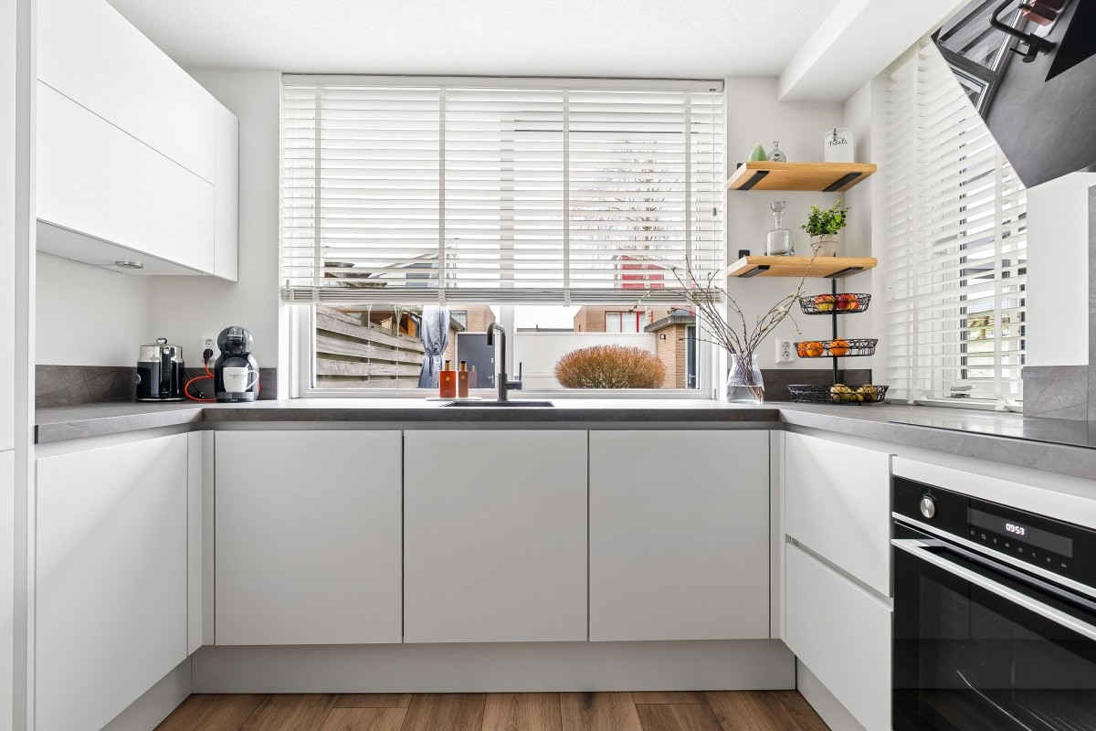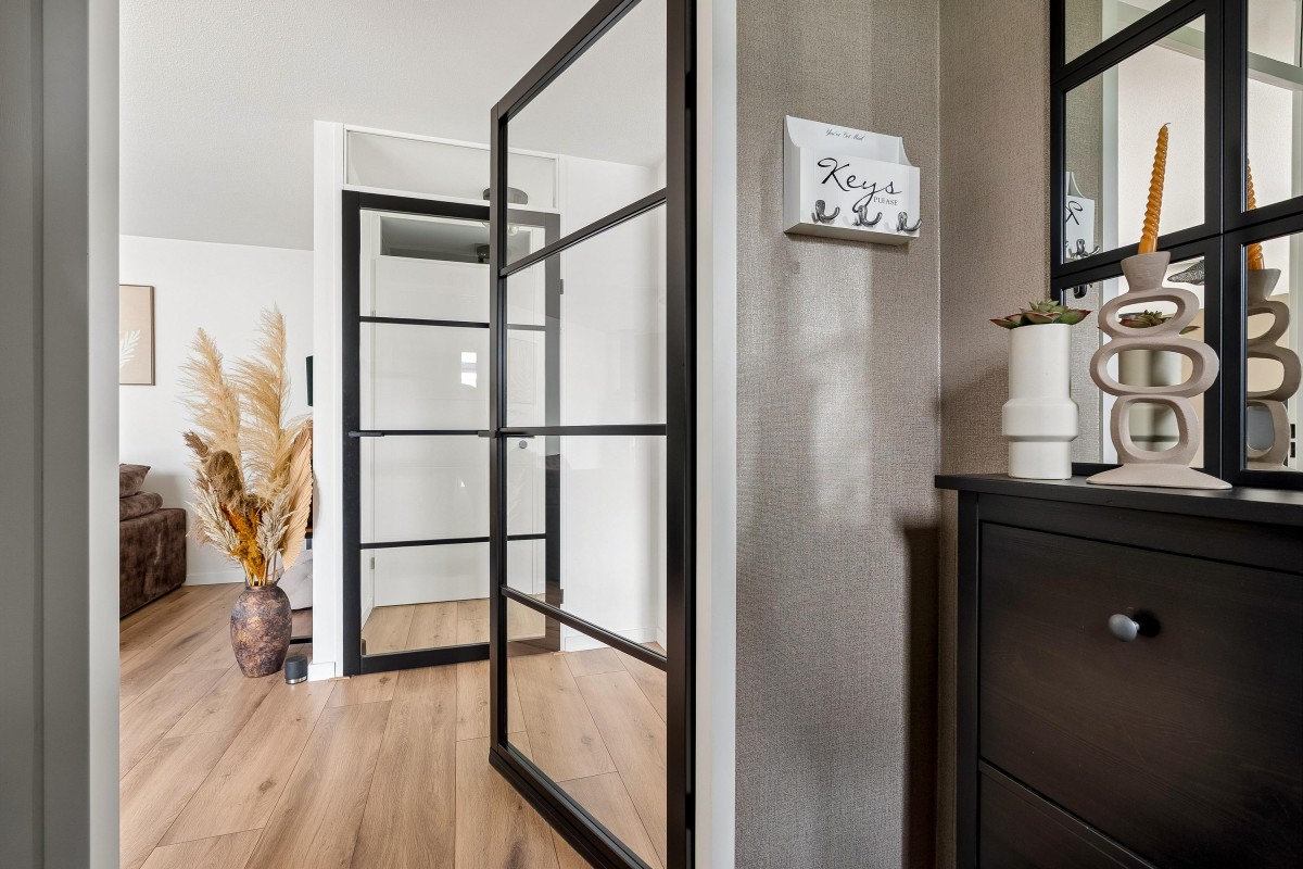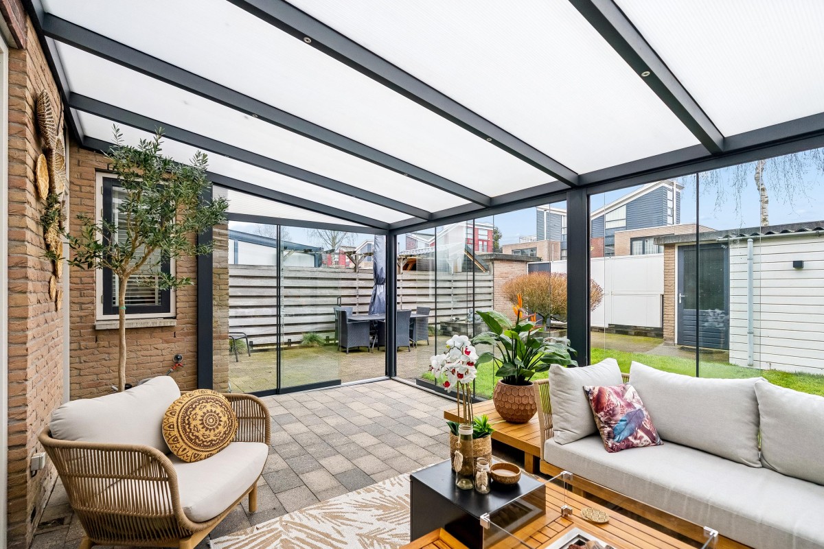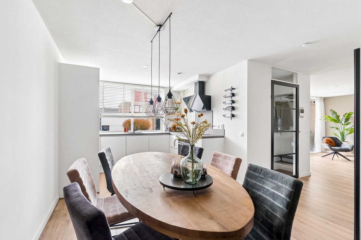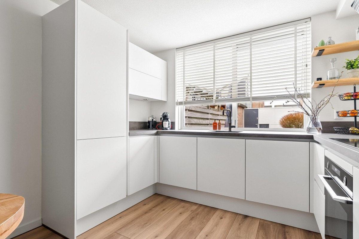 Entrance/hallway with a coat closet and meter cupboard. The cozy, spacious living room with a wood-burning stove has two French doors leading to the conservatory. From this conservatory, sliding glass walls provide access to the front garden. The living room flows into the kitchen/diner. The modern fitted kitchen (2021 and 2023) is equipped with all necessary appliances and overlooks the garden. The kitchen offers ample storage space in several cupboards. A hallway with a toilet (2021) provides access to the first floor. The staircase is very bright thanks to the tall windows.