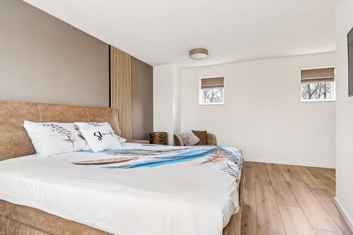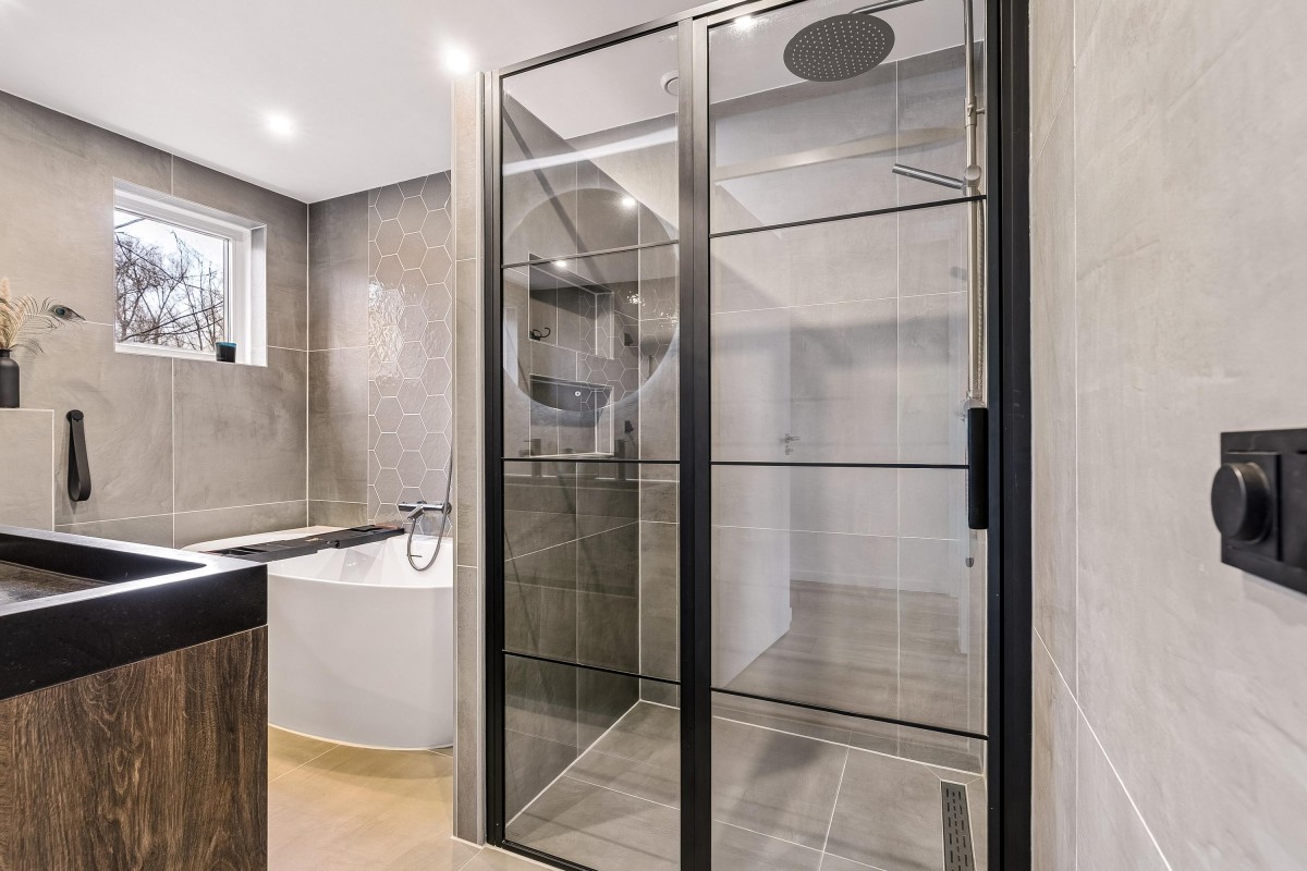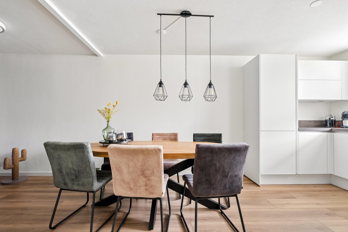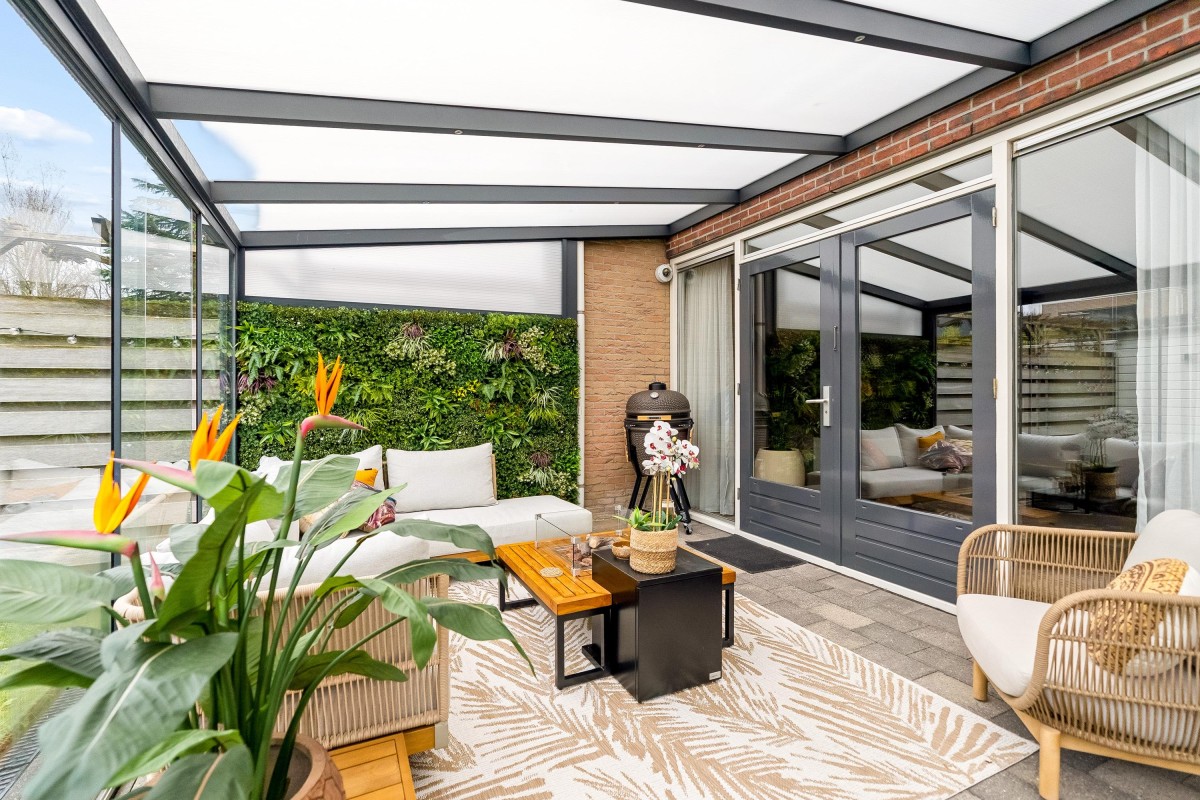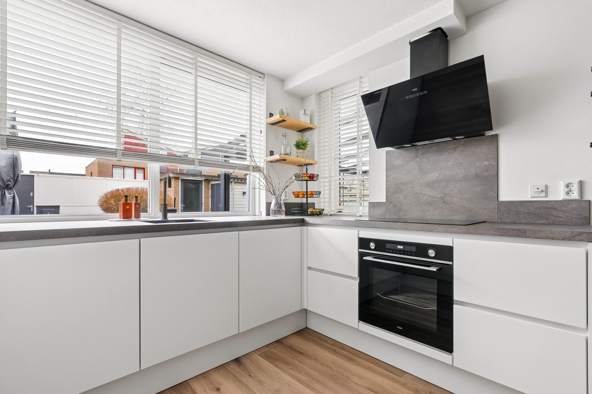 Entrance/hallway with a coat closet and meter cupboard. The cozy, spacious living room with a wood-burning stove has two French doors leading to the conservatory. From this conservatory, sliding glass walls provide access to the front garden. The living room flows into the kitchen/diner. The modern fitted kitchen (2021 and 2023) is equipped with all necessary appliances and overlooks the garden. The kitchen offers ample storage space in several cupboards. A hallway with a toilet (2021) provides access to the first floor. The staircase is very bright thanks to the tall windows.
