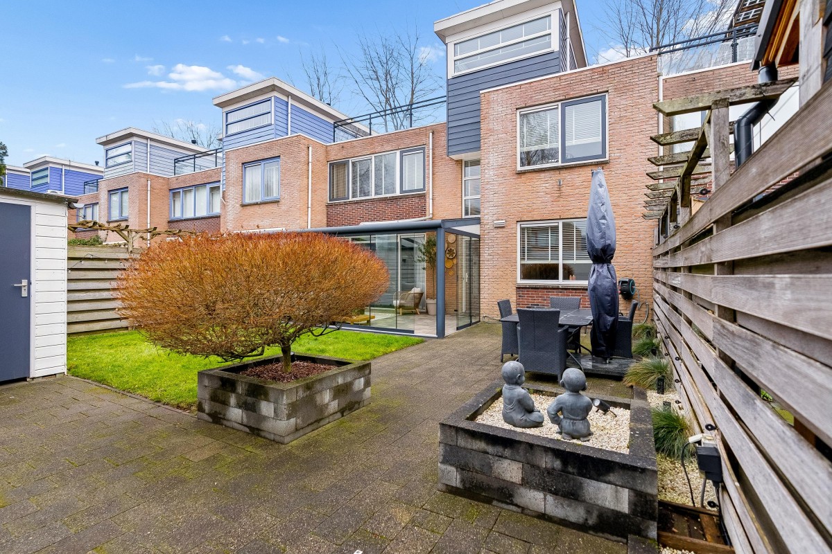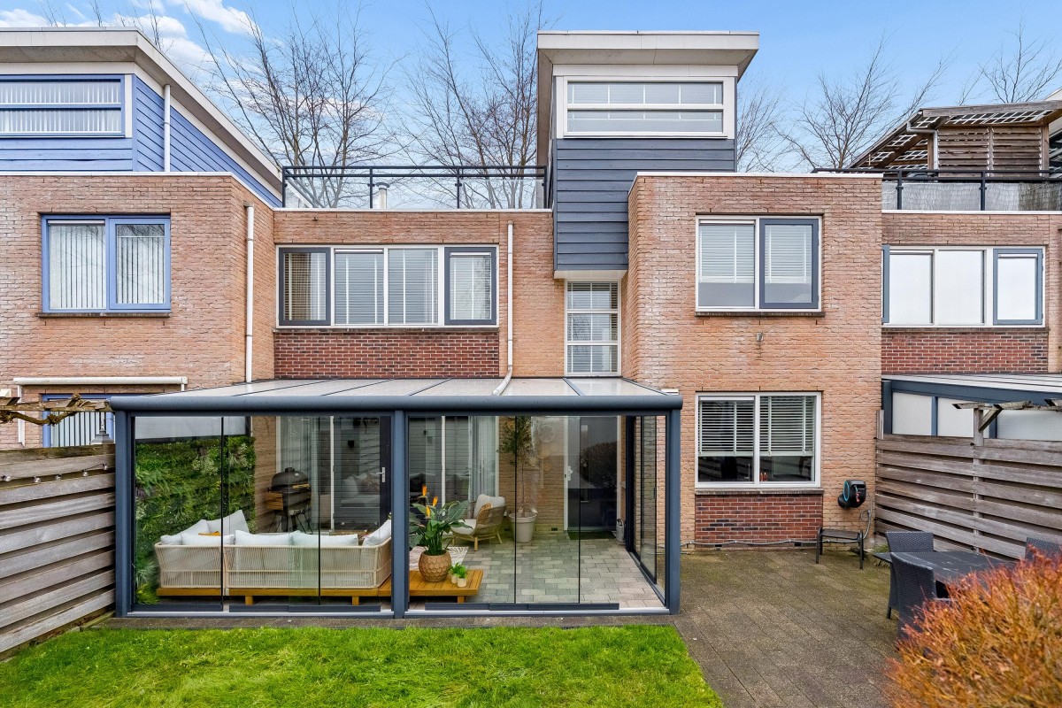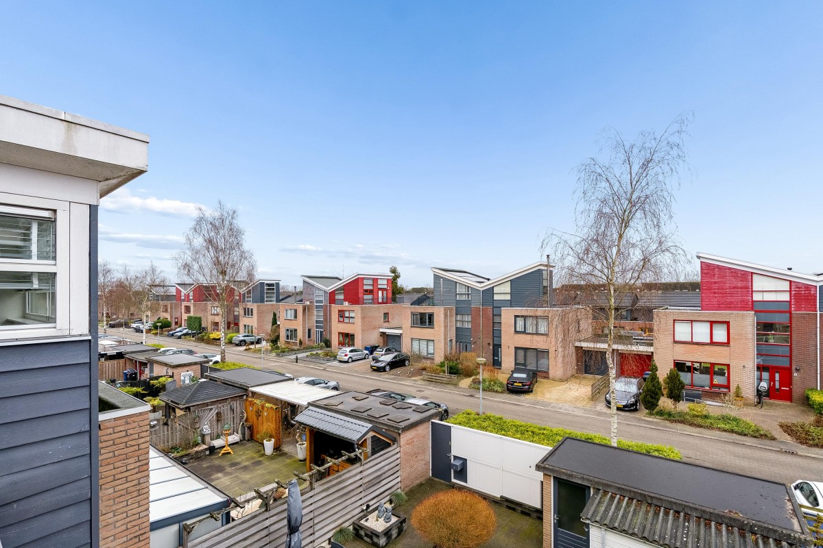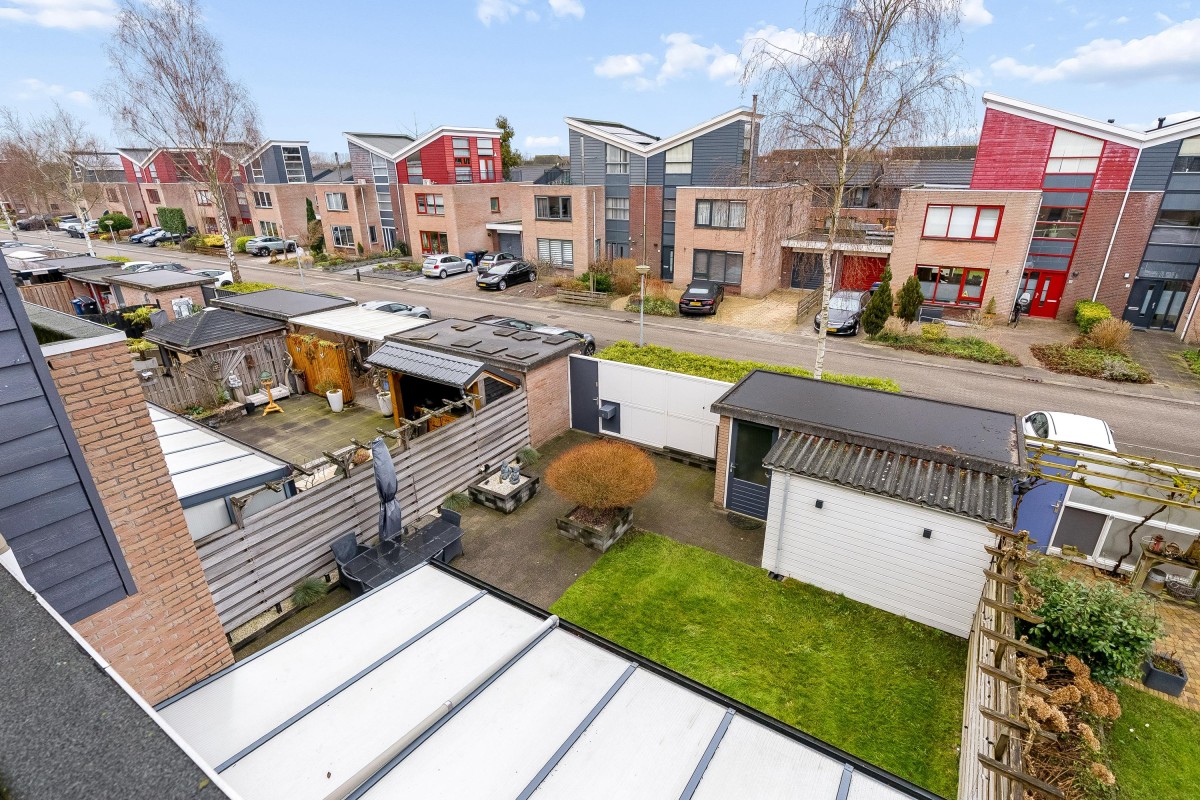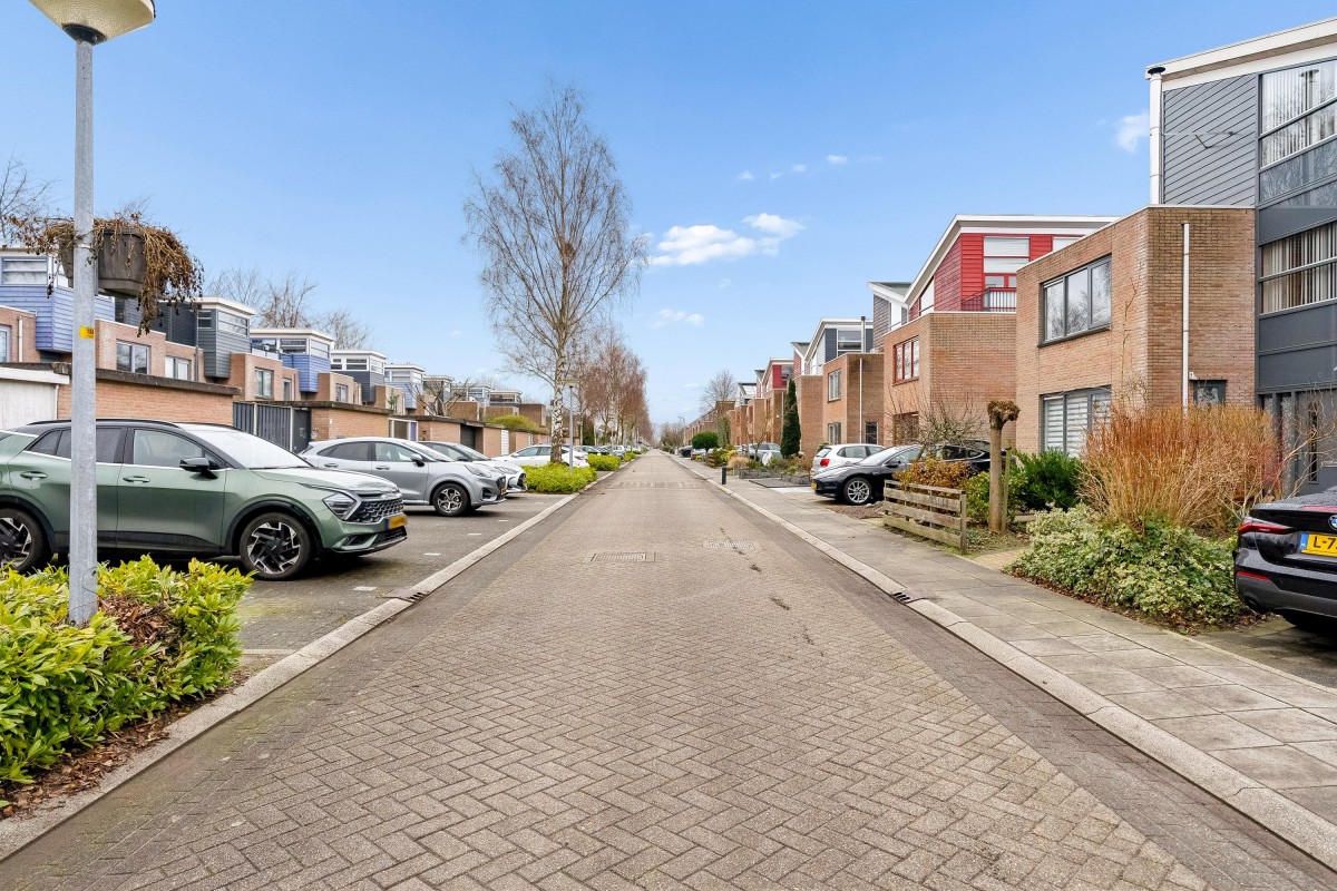 This architect-designed (Bugawall) and optimally sound-insulated, full-width townhouse is located on the quiet and leafy Jan van Eijckstraat in Almere, in the "Tussen de Vaarten Noord" neighborhood. The spacious house features a large, private southeast-facing front garden and a generous roof terrace.