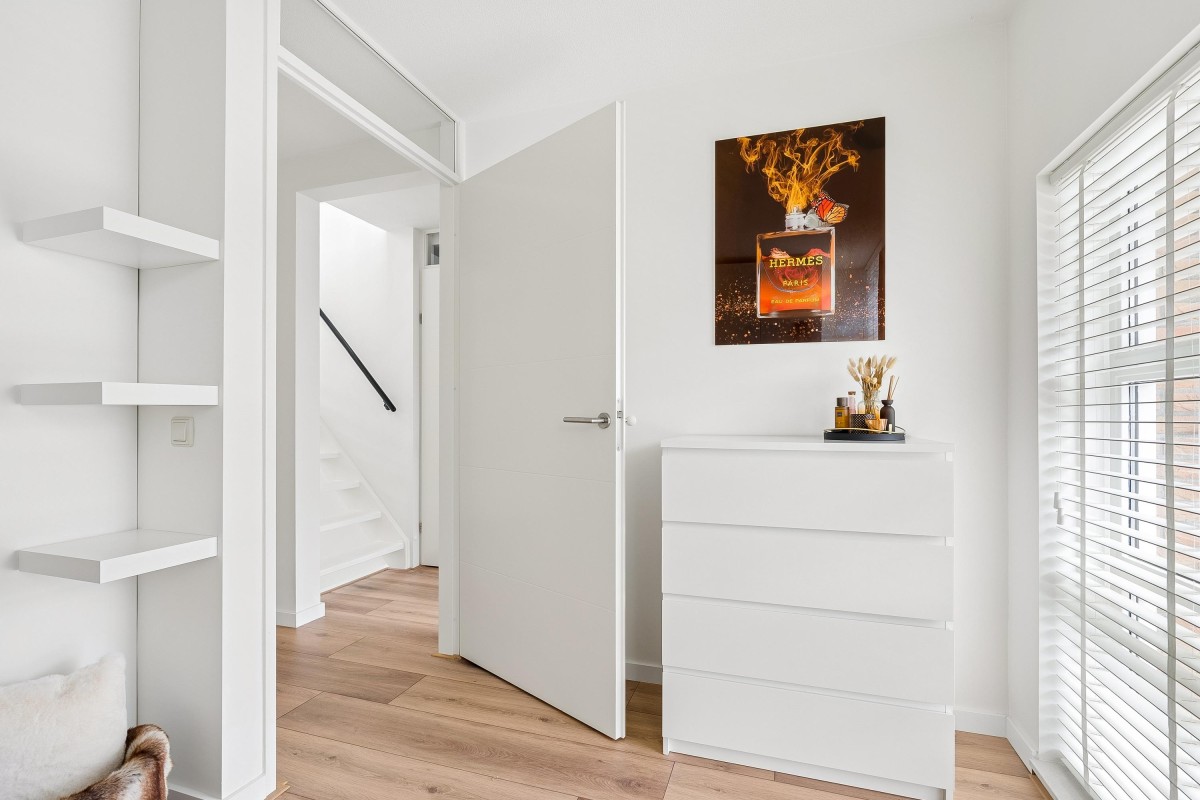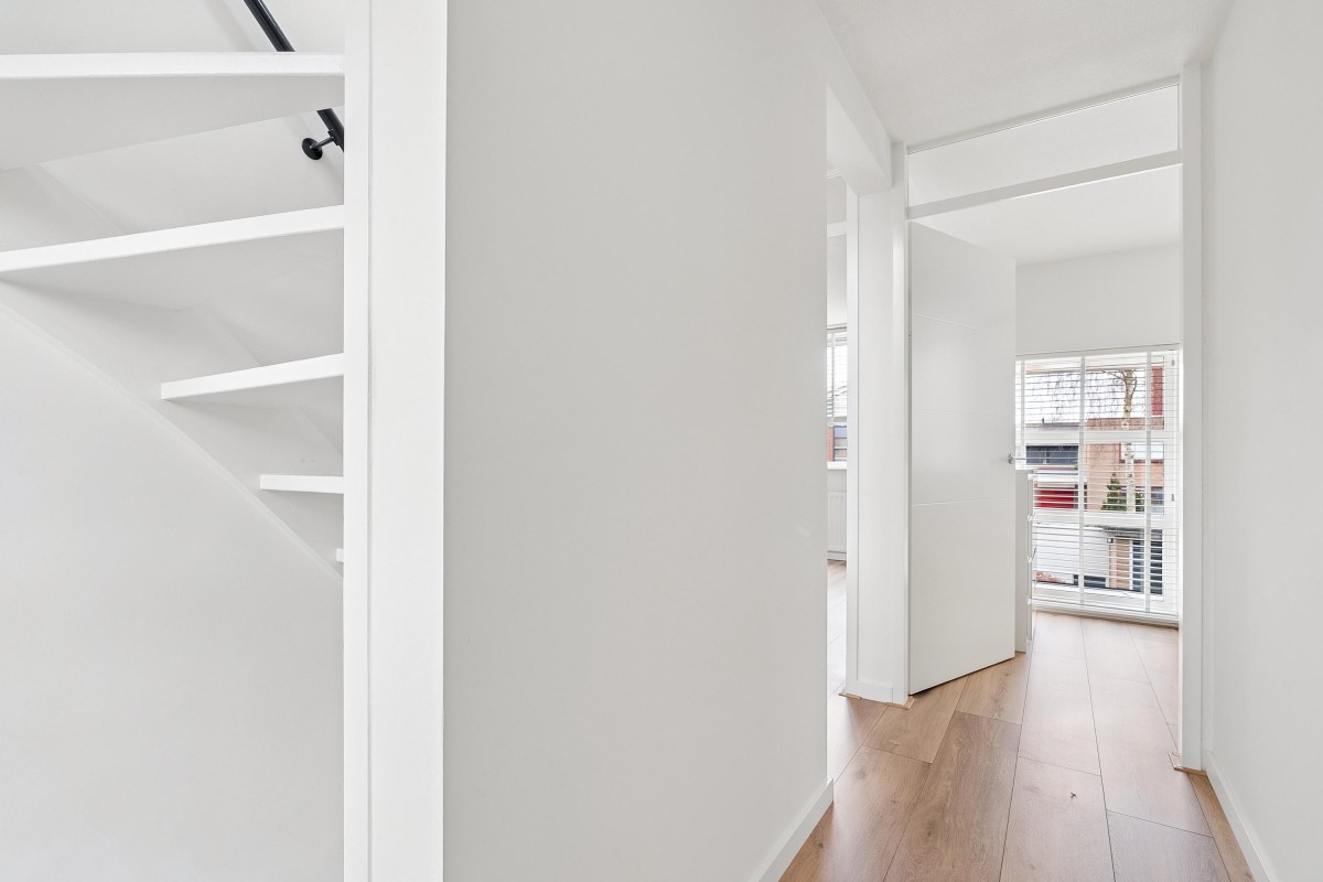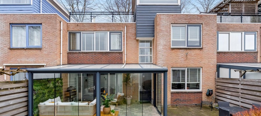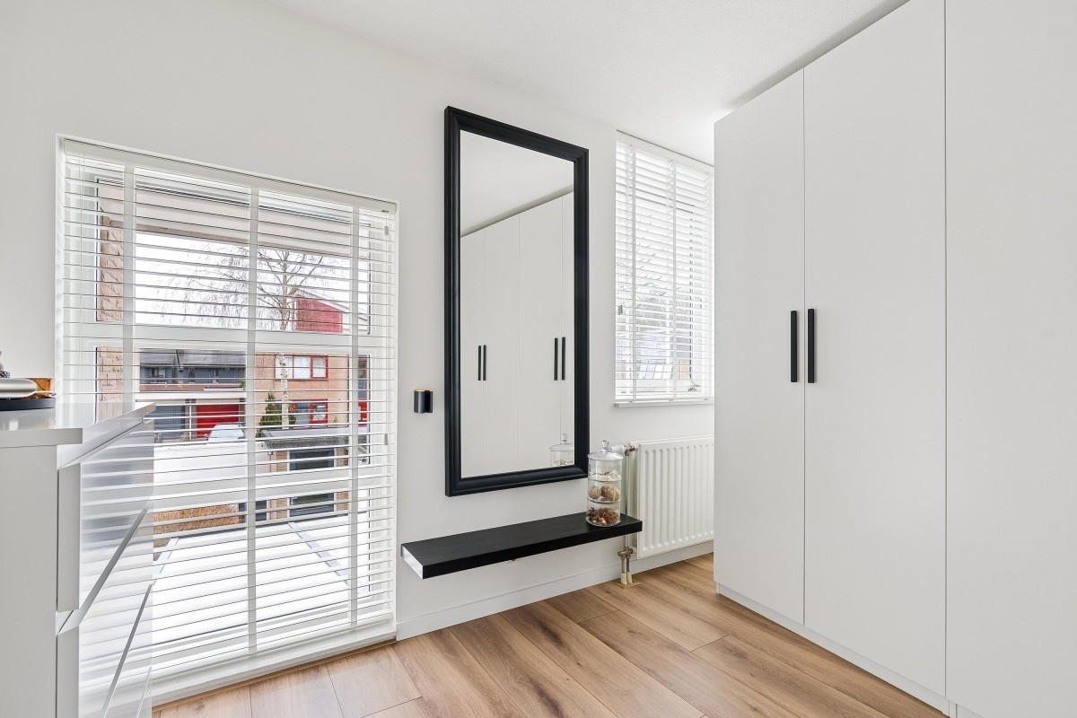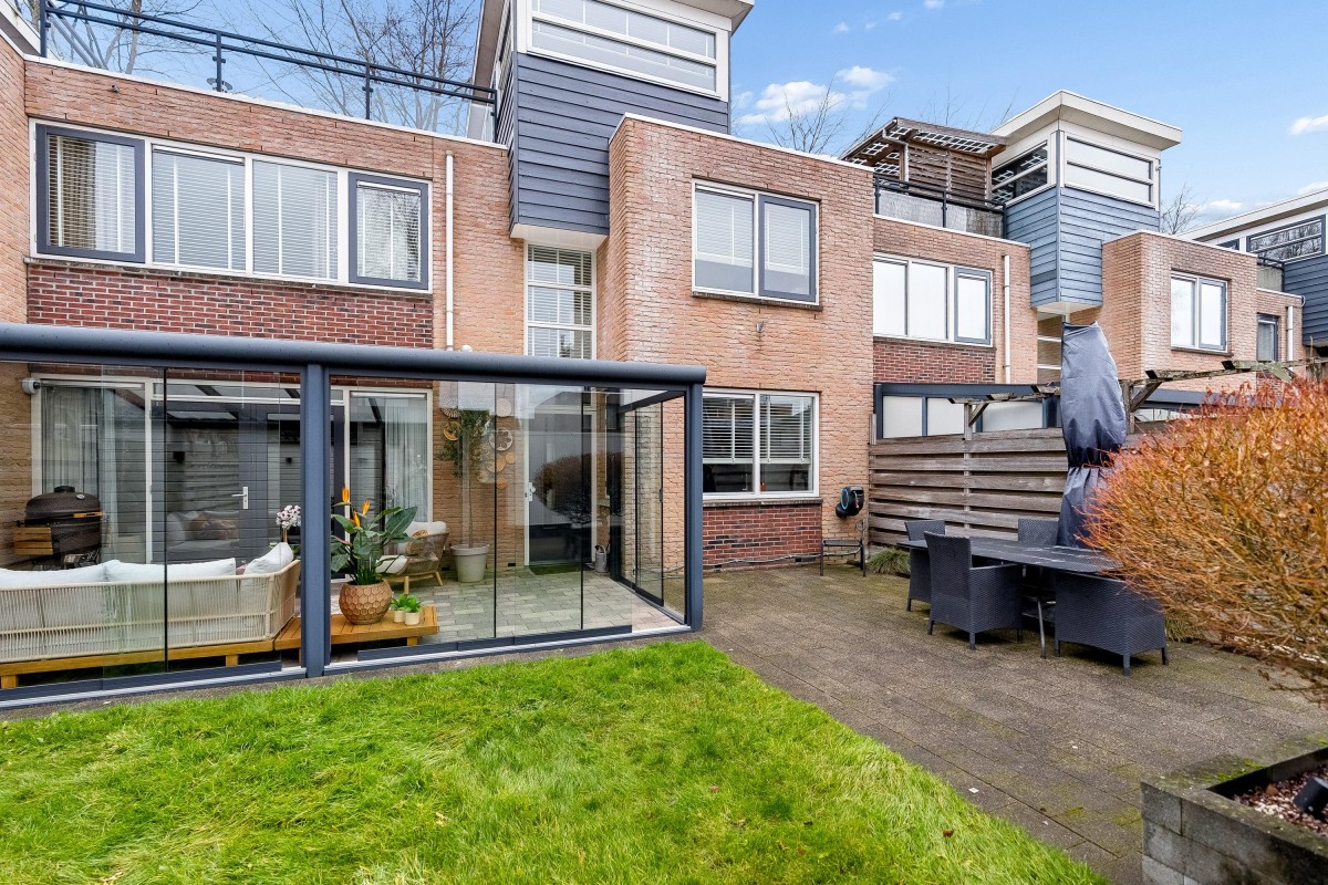 This architect-designed (Bugawall) and optimally sound-insulated, full-width townhouse is located on the quiet and leafy Jan van Eijckstraat in Almere, in the "Tussen de Vaarten Noord" neighborhood. The spacious house features a large, private southeast-facing front garden and a generous roof terrace.
