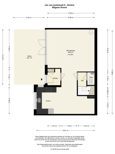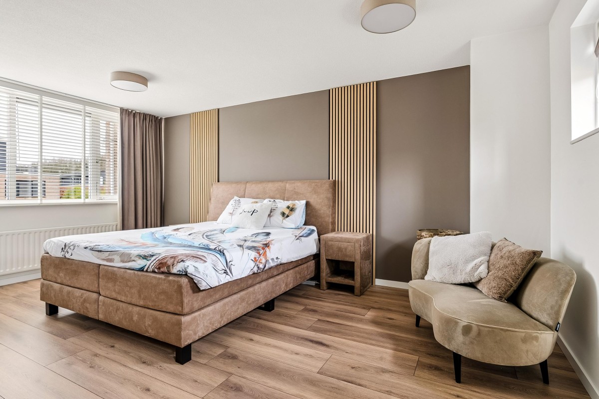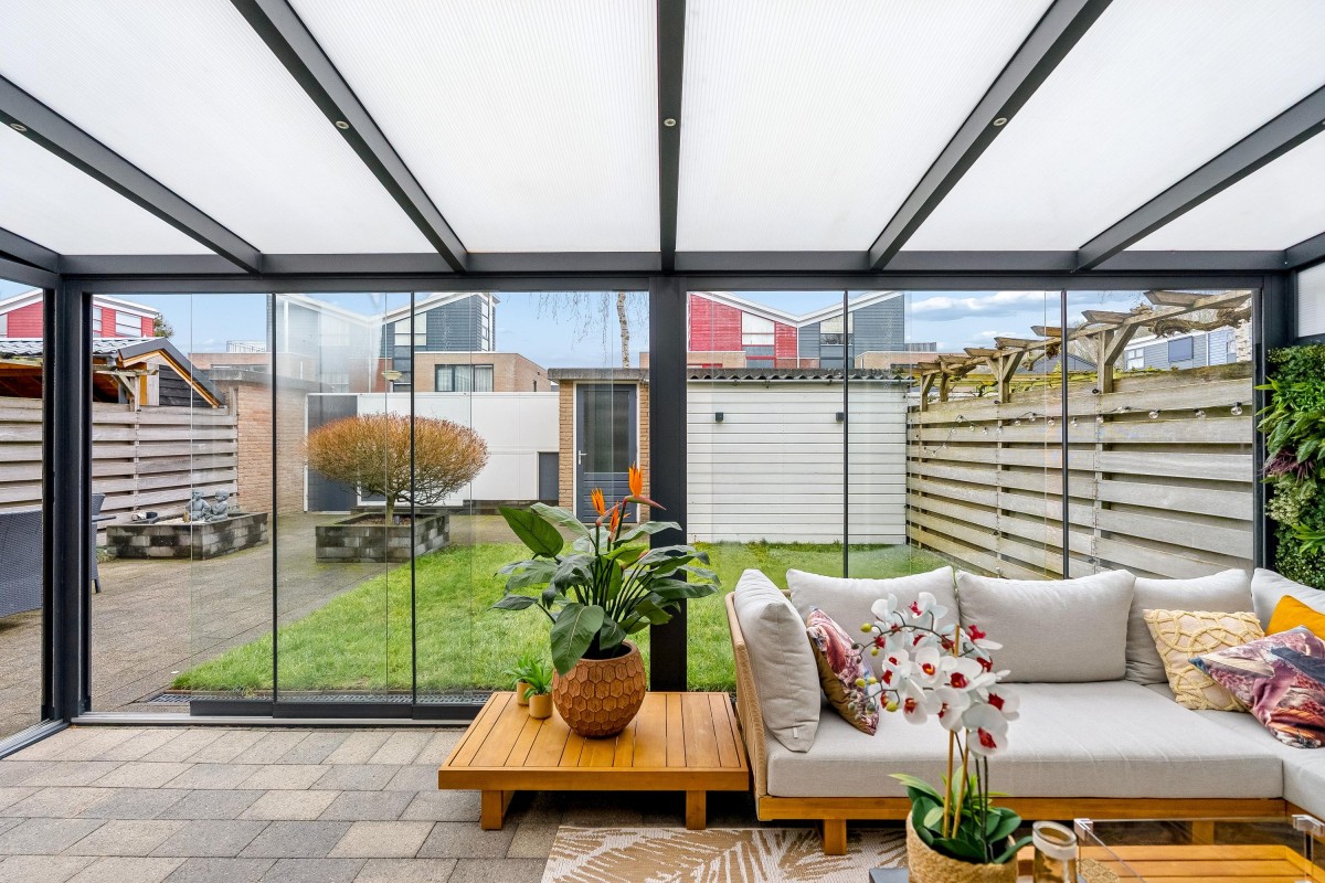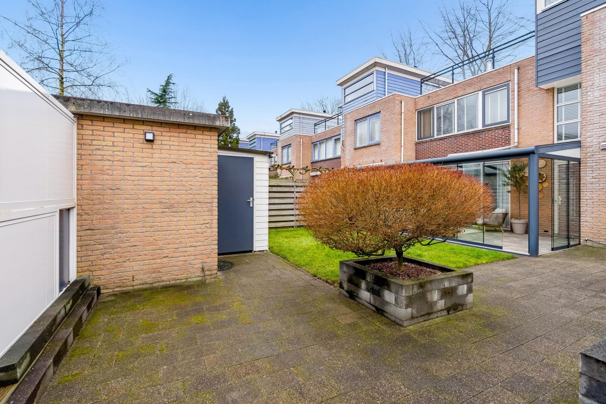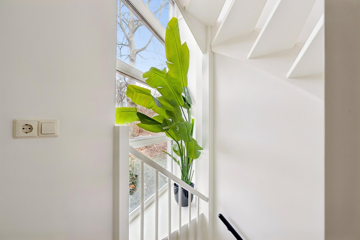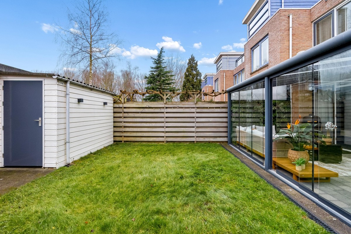 This architect-designed (Bugawall) and optimally sound-insulated, full-width townhouse is located on the quiet and leafy Jan van Eijckstraat in Almere, in the "Tussen de Vaarten Noord" neighborhood. The spacious house features a large, private southeast-facing front garden and a generous roof terrace.