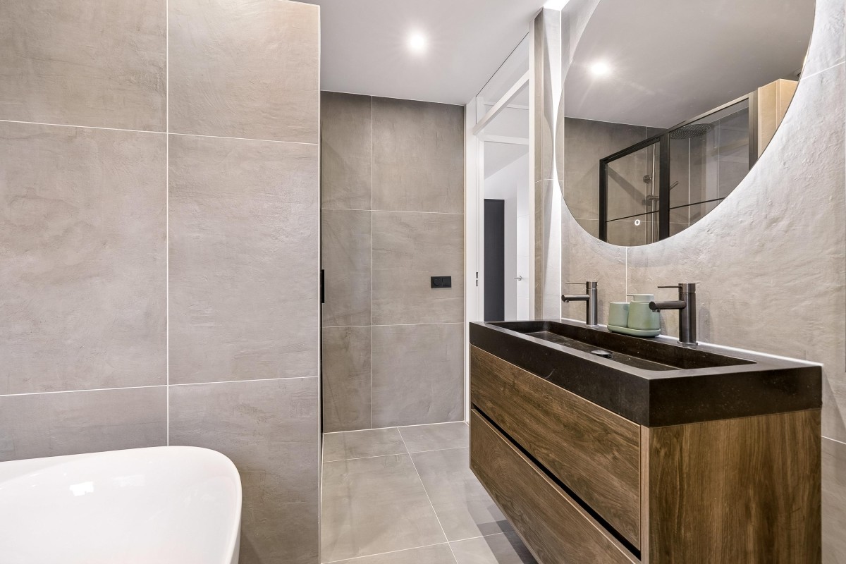The landing provides access to three spacious bedrooms, each with windows overlooking the front garden. The renovated bathroom features ceiling-high tiling, a bathtub, a walk-in shower, a vanity with double taps, and a window for extra ventilation.