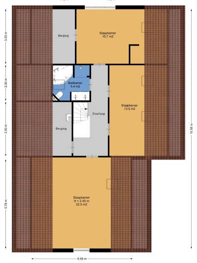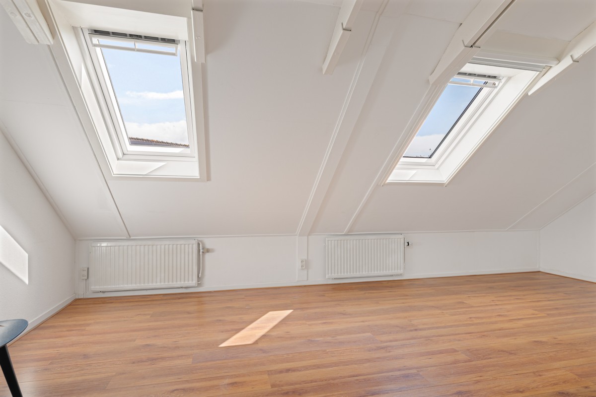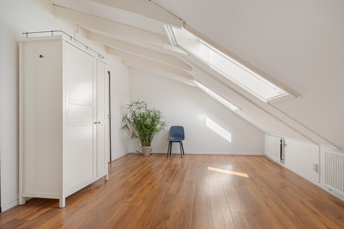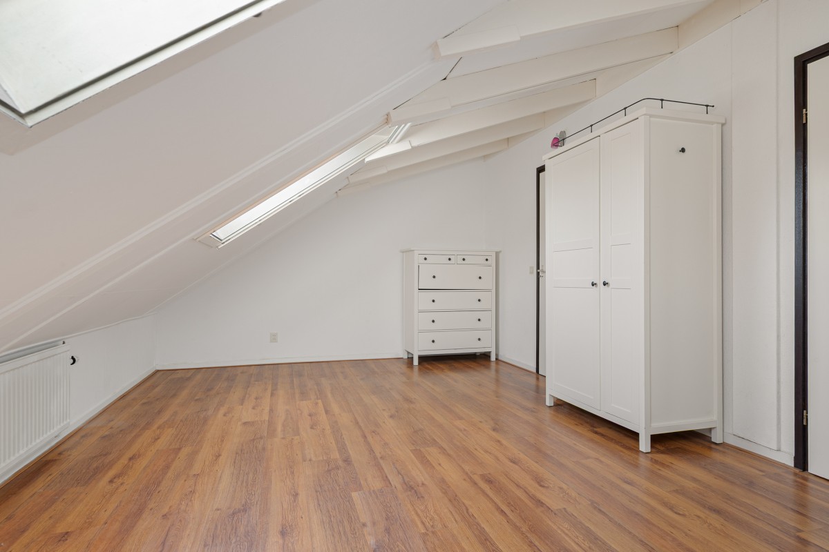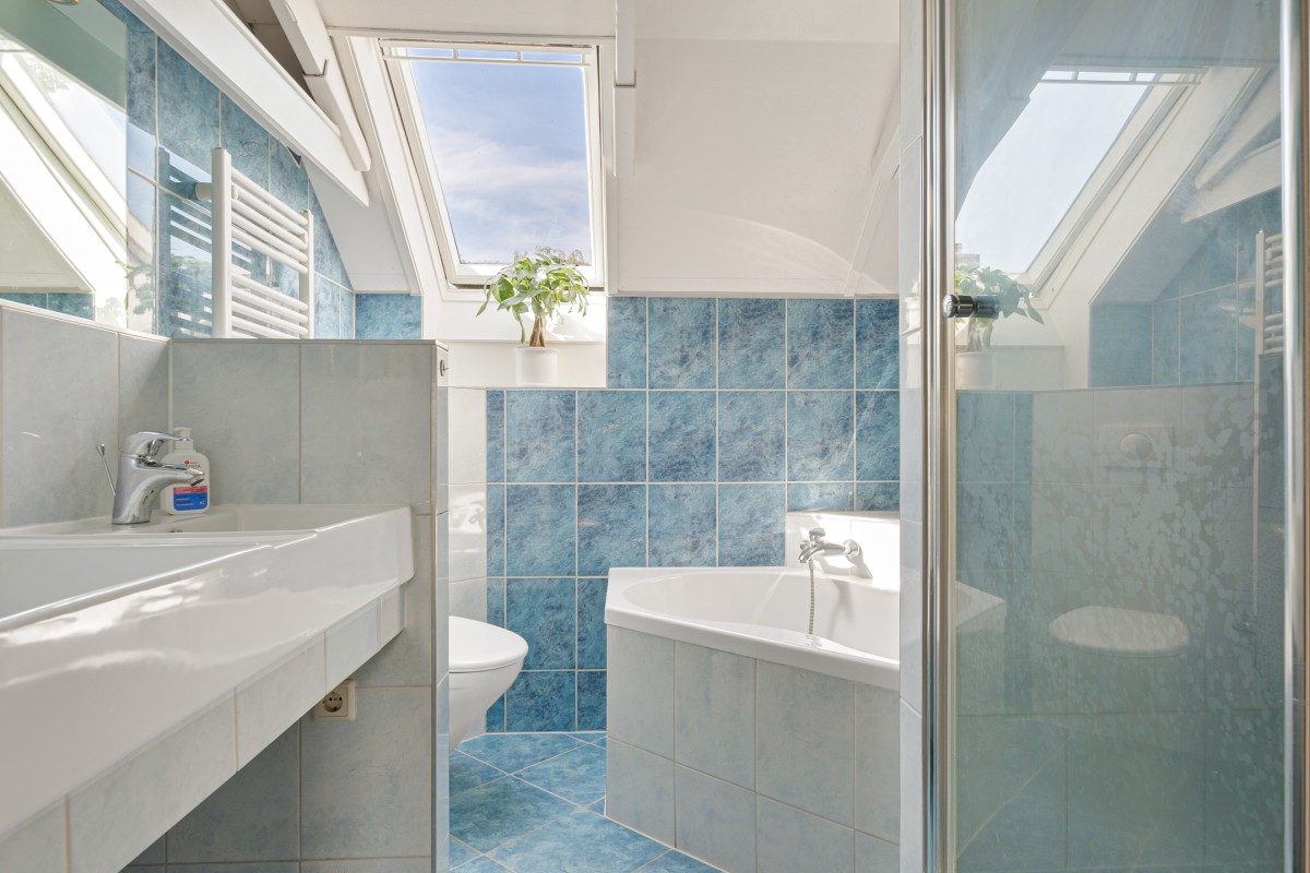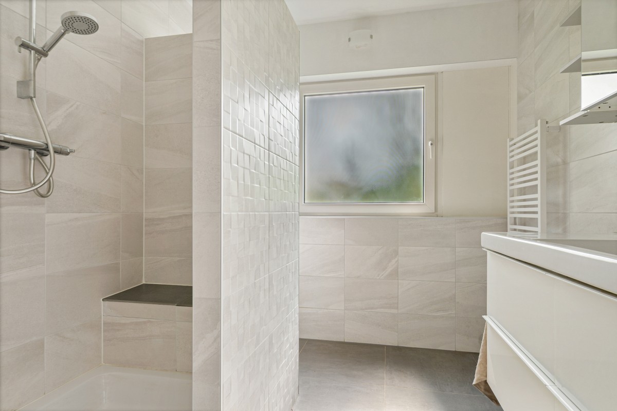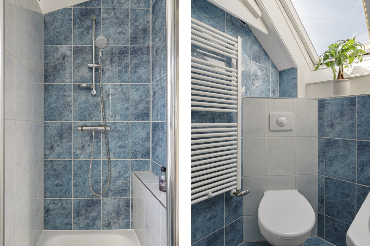 The first floor offers three spacious bedrooms. The largest bedroom (approx. 22.5 m²) spans the full width of the home, giving it an extra generous feel. The bathroom is fully tiled and fitted with a washbasin unit, designer radiator, toilet, and a large shower. A window provides natural light and ventilation. This floor is also neatly finished with a laminate floor.