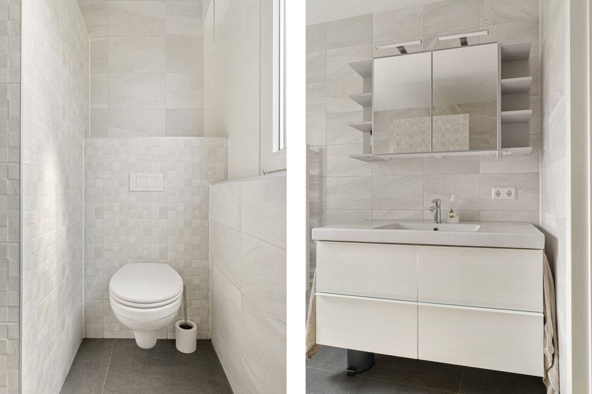 Through the entrance you arrive in the hall with access to the meter cupboard, the toilet with washbasin, and the staircase to the upper floor. From here you continue into the spacious and bright living room. Large windows provide a pleasant amount of daylight, making the space feel warm and inviting. The sleekly finished walls and neat tiled floor give the whole a fresh and homely atmosphere.