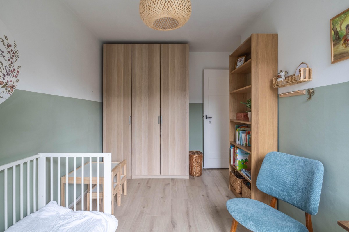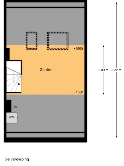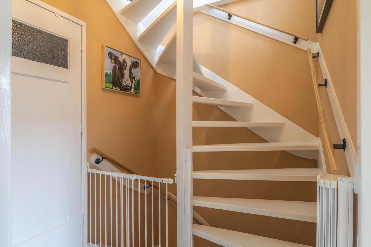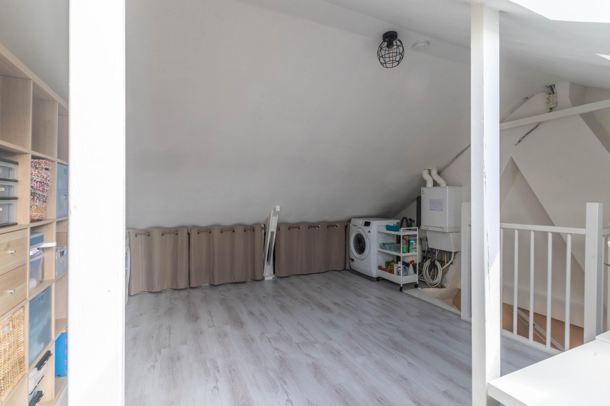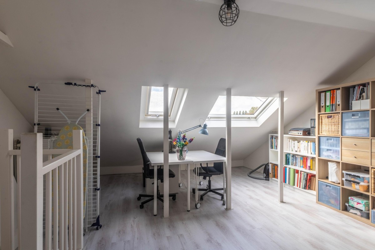 A fixed staircase leads to the top floor, currently used as a study. Large windows provide ample natural light. At this floor you will find the connections for a washing machine and dryer and practical storage space behind the knee walls. This floor can also be used as a spacious master bedroom. The central heating boiler (Intergas) is from 2018.