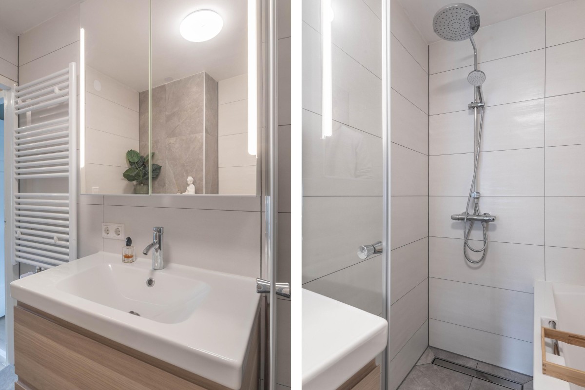 Landing, modern bathroom with bathtub, walk-in rain shower, second toilet, stylish vanity, and heated towel rail. Three good-sized bedrooms offer space for a family, guest room, or home office.