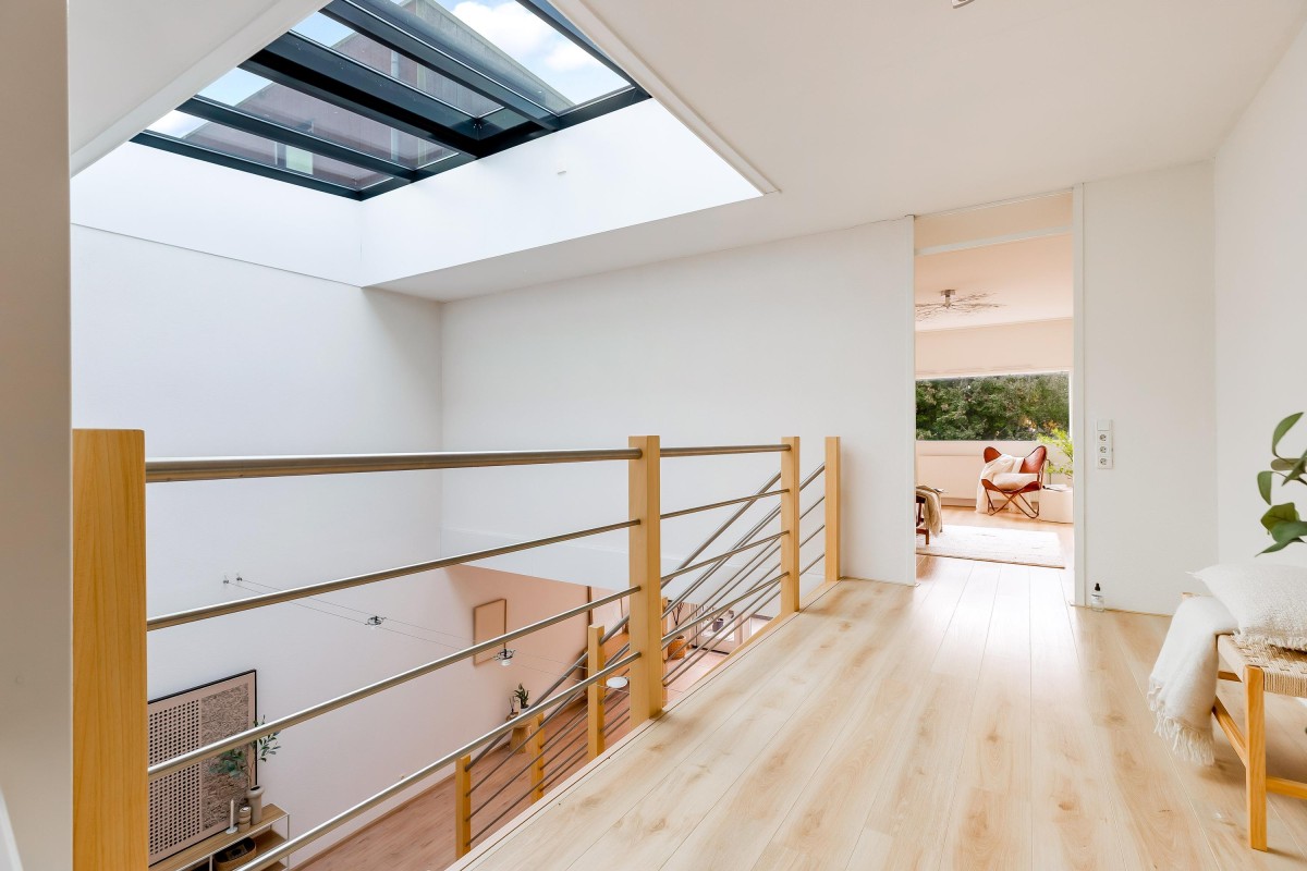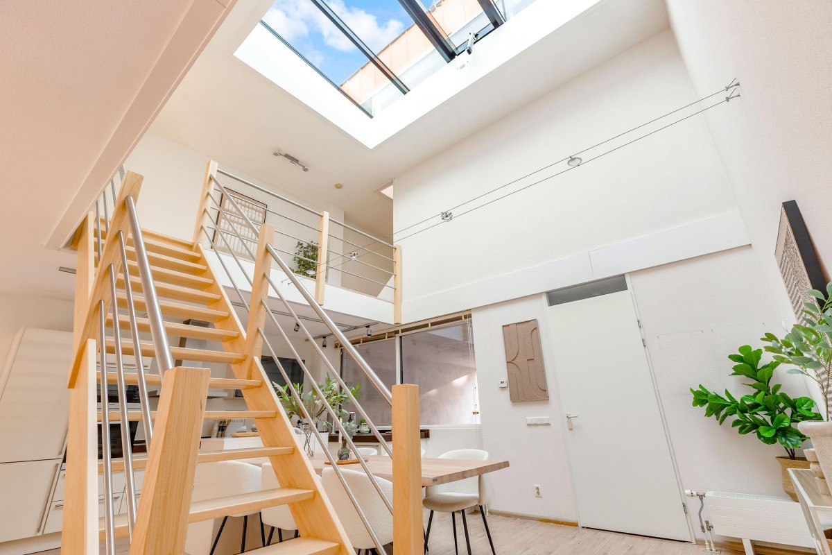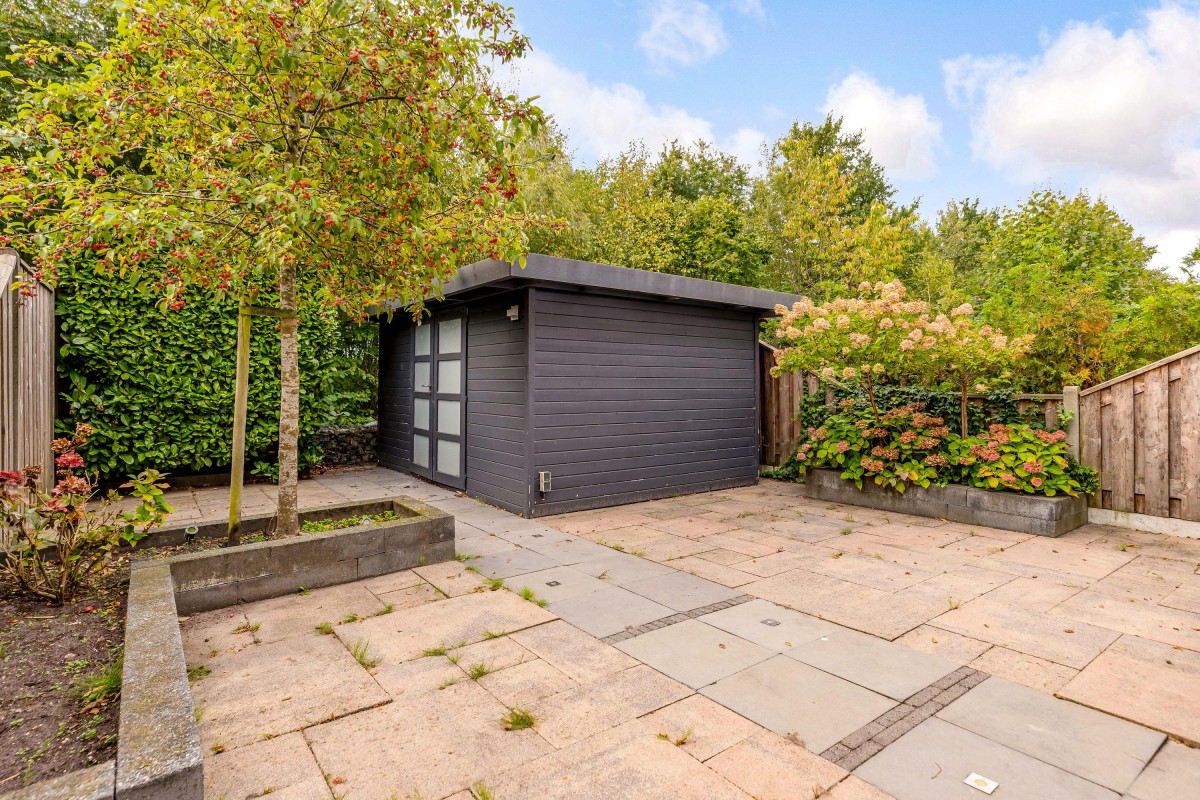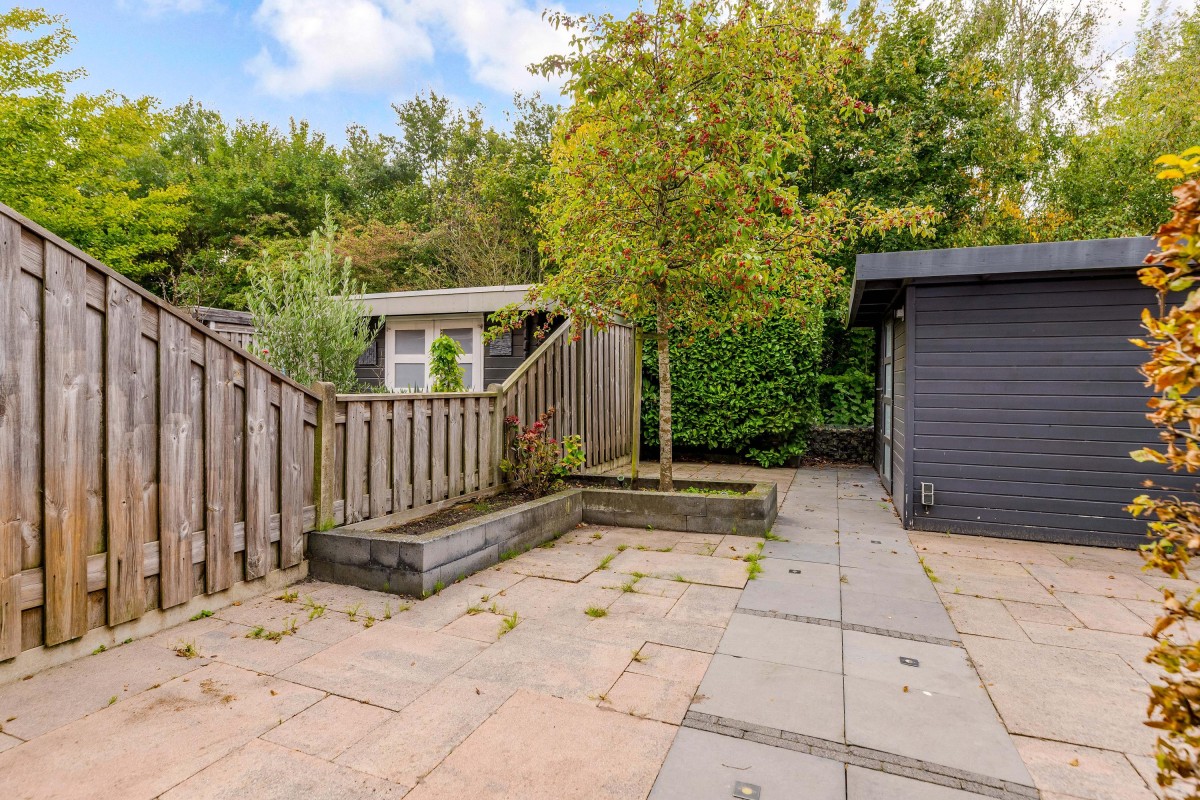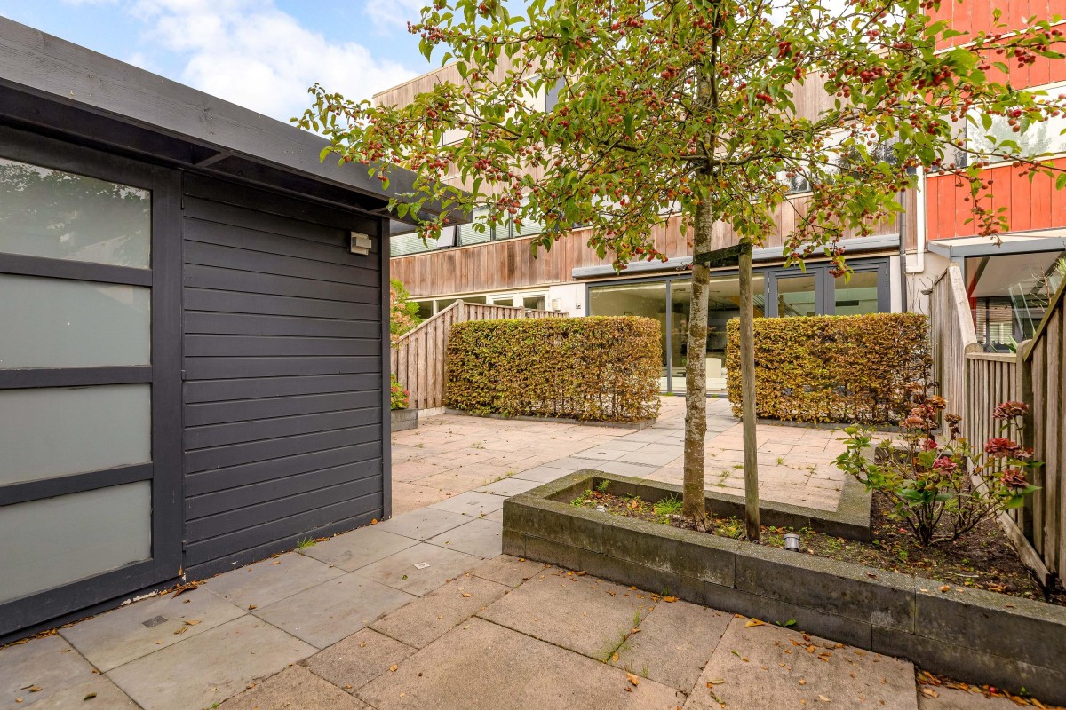 A key feature of the home is the mezzanine and large skylight, allowing ample natural daylight throughout the living areas. The southeast-facing garden provides good sunlight and privacy, with a detached, insulated shed equipped with electricity for storage or workspace use.
