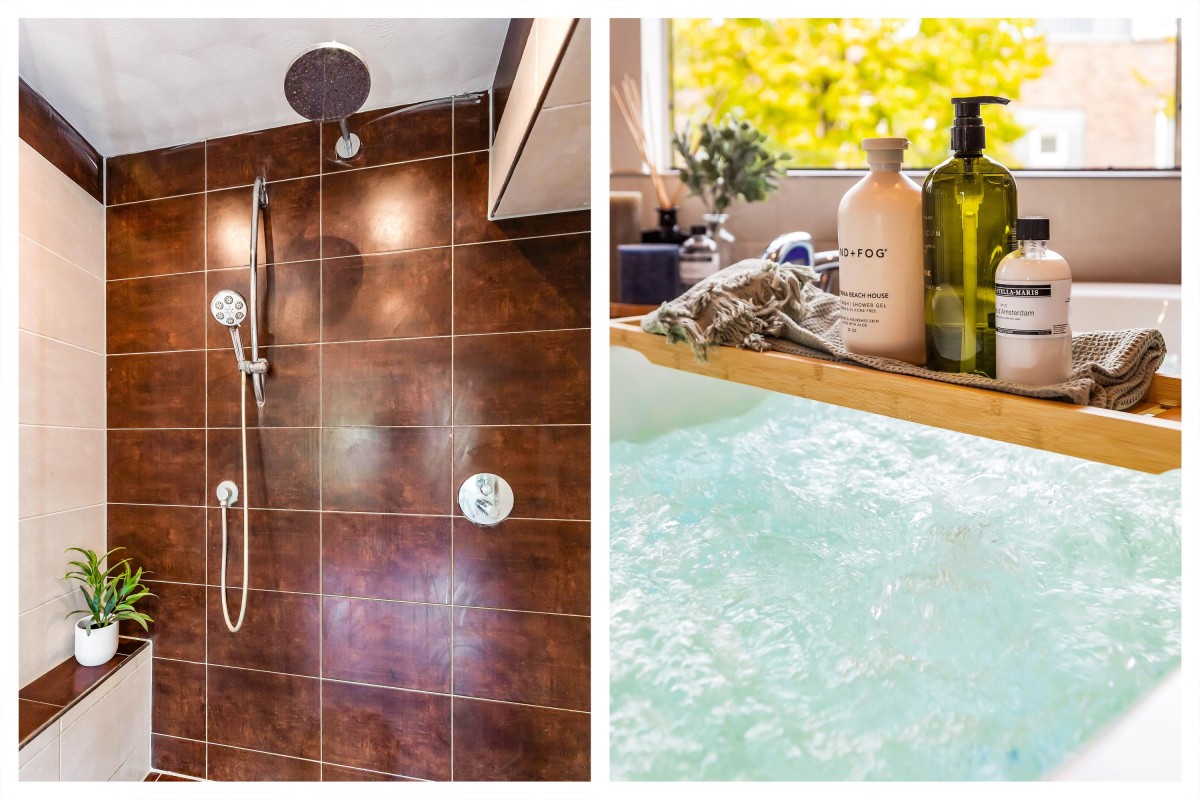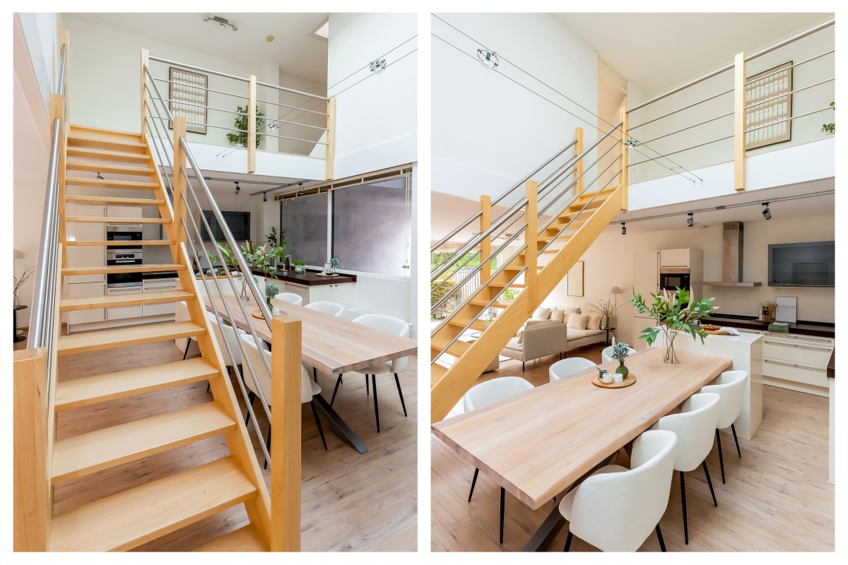 On the first floor, the landing overlooks the loft and skylight. The master bedroom includes a walk-in closet and an air conditioning unit. A second spacious bedroom is located at the front. The bathroom is equipped with a whirlpool tub, walk-in shower, double sinks, and modern fixtures.