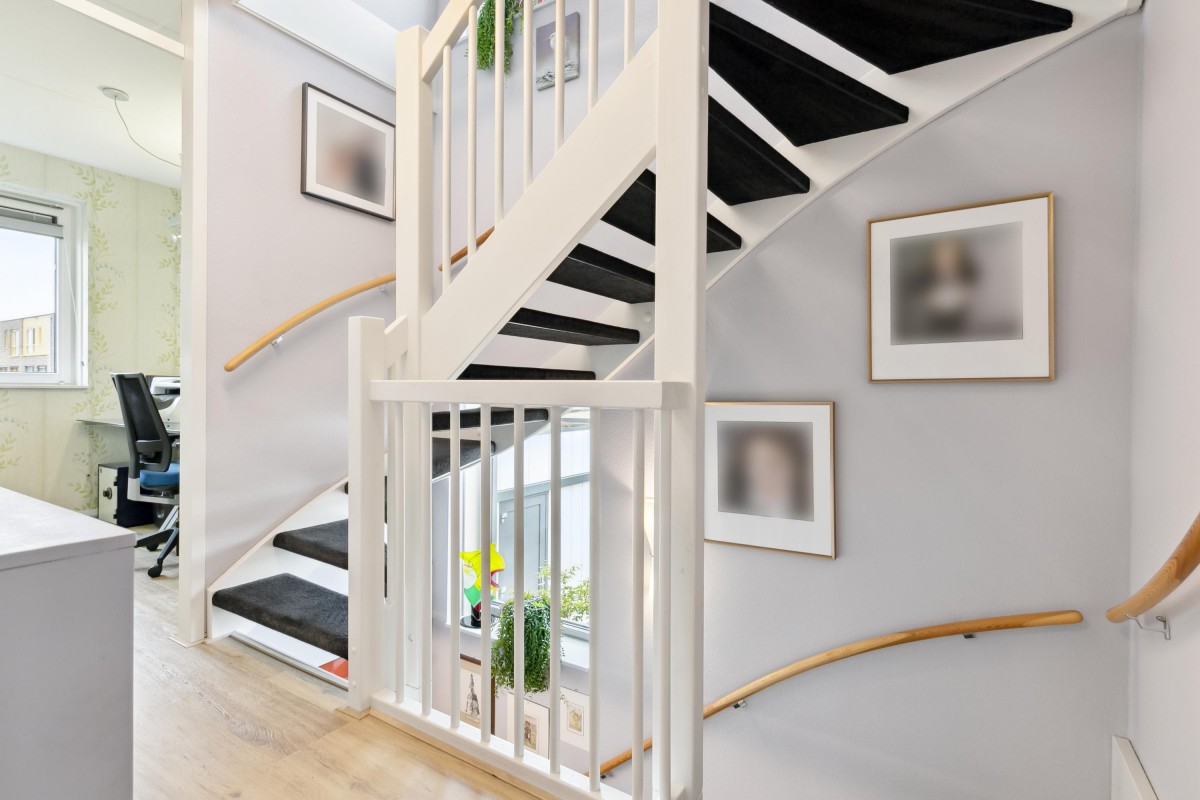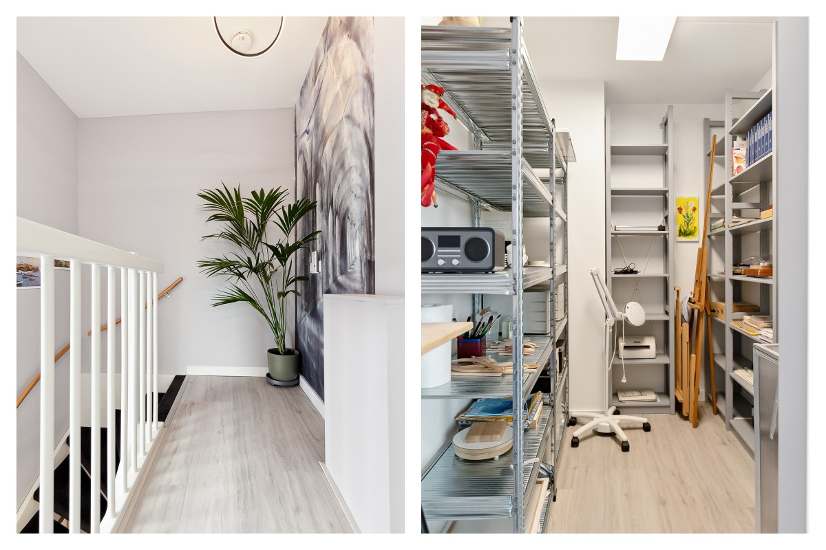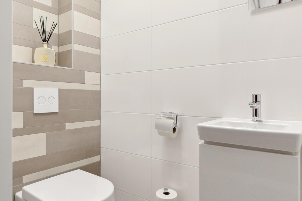 You enter into a spacious entrance hall with the meter cupboard, equipped with fiber optic connection and district heating. You'll also find a modern, wall-hung toilet with a small sink, access to the living room and the bedroom on the ground floor, as well as the stairs to the first floor.