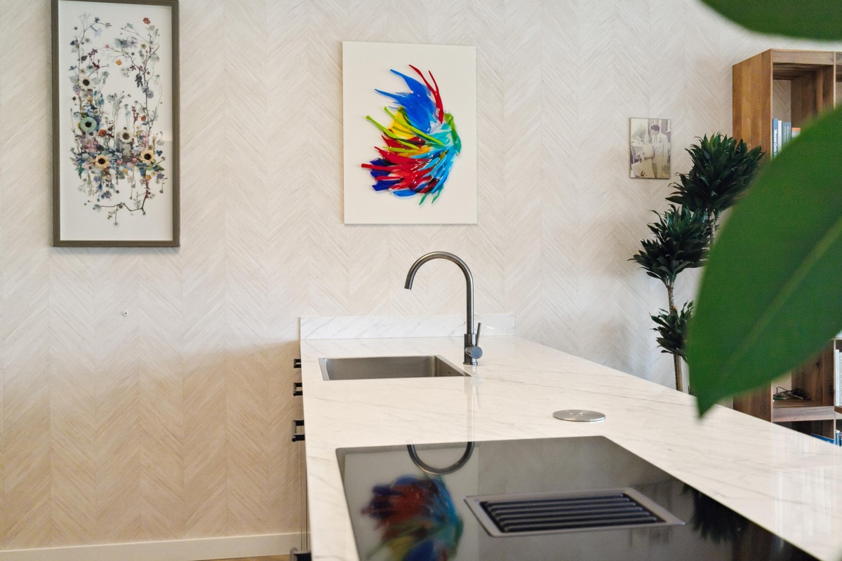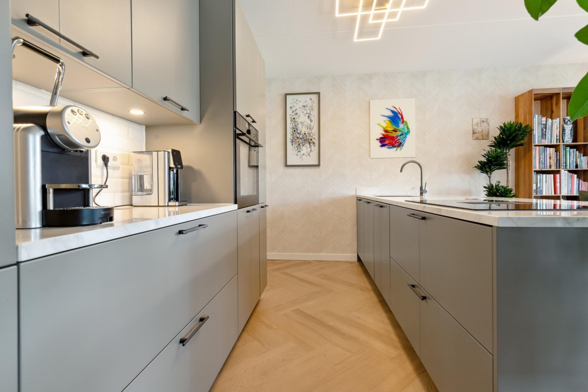 Thanks to the clever design, there's ample storage space in the cupboards and drawers, keeping everything neat and organized. The kitchen also offers ample space for a large dining table, making it perfect for both intimate dinners and convivial gatherings with family or friends.