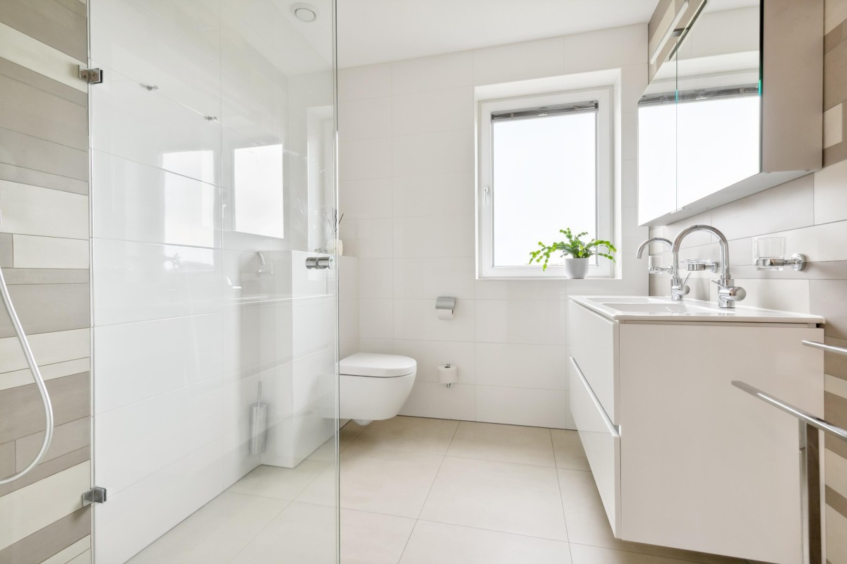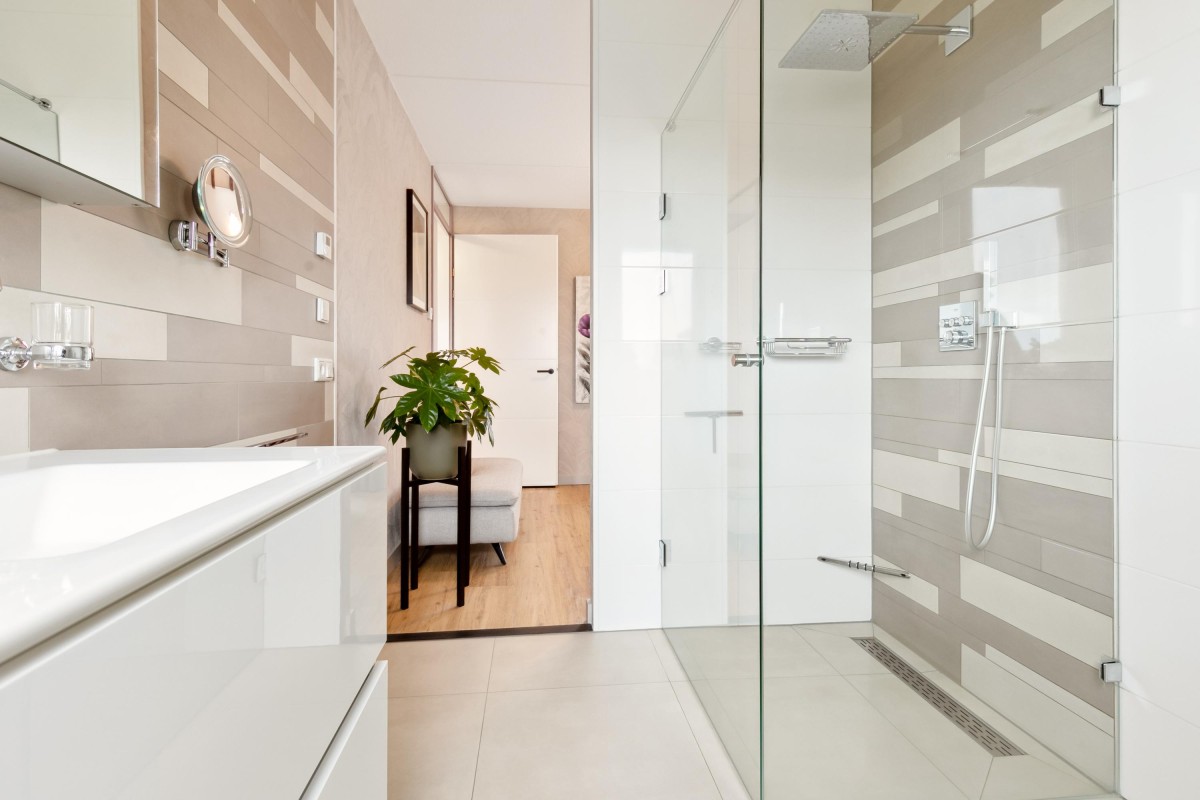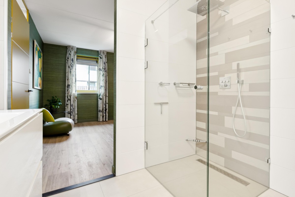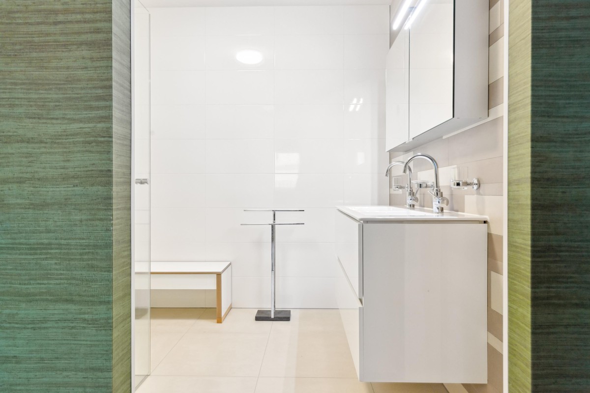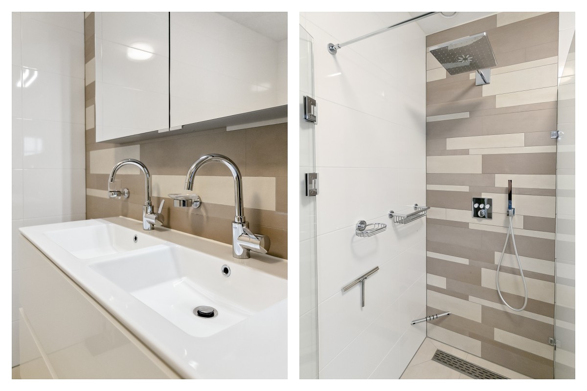Through the hall, you reach the spacious bedroom with an en-suite bathroom featuring a walk-in shower with rain shower head, a vanity with a double sink, and a mirrored cabinet.