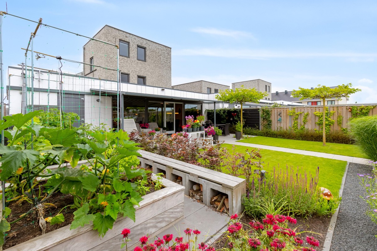 The architect-designed garden features a water pump for the sprinkler system, various colorful plants, two spacious vegetable plots, and a diverse collection of trees, including ornamental pears and mulberries.