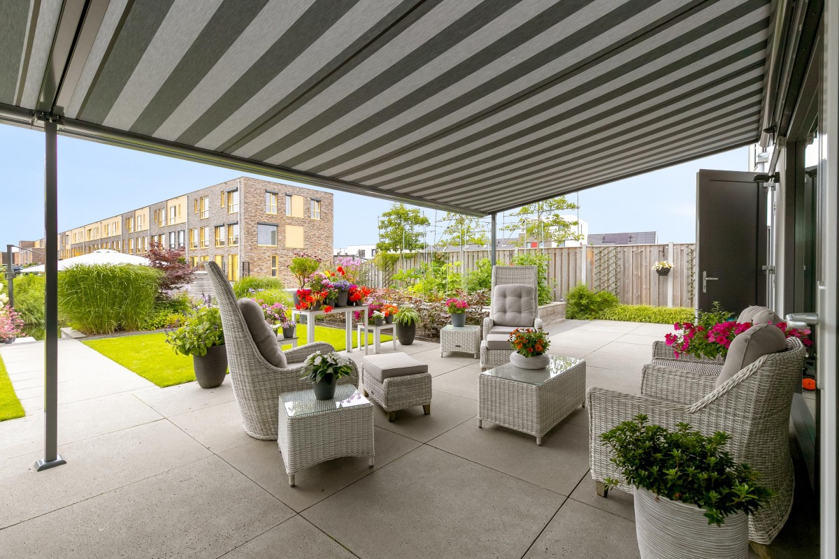 The backyard offers the best of both worlds: soaking up the sun and finding cool shade. Enjoy a cup of coffee on the terrace or relax comfortably under the electric awning without overheating.
