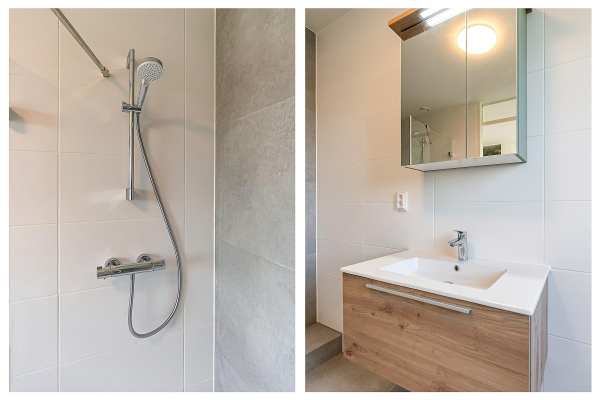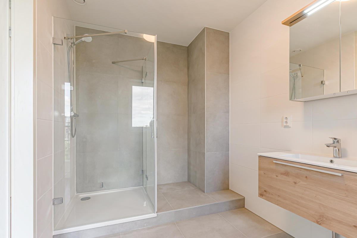Spacious landing with a French balcony and access to the second toilet, two spacious bedrooms, and the bathroom. The bathroom features light-colored tiling up to the ceiling, a vanity unit (2025 cm), a walk-in shower, and a window for extra ventilation.