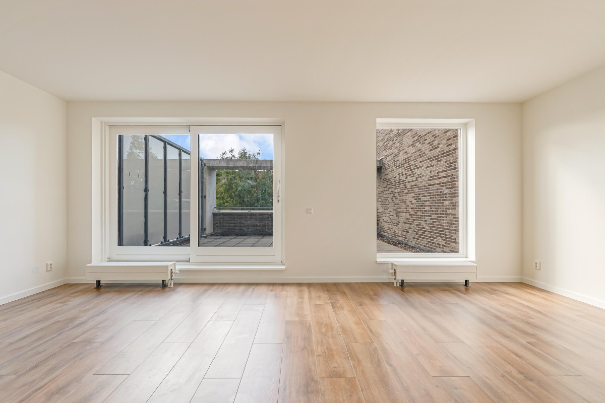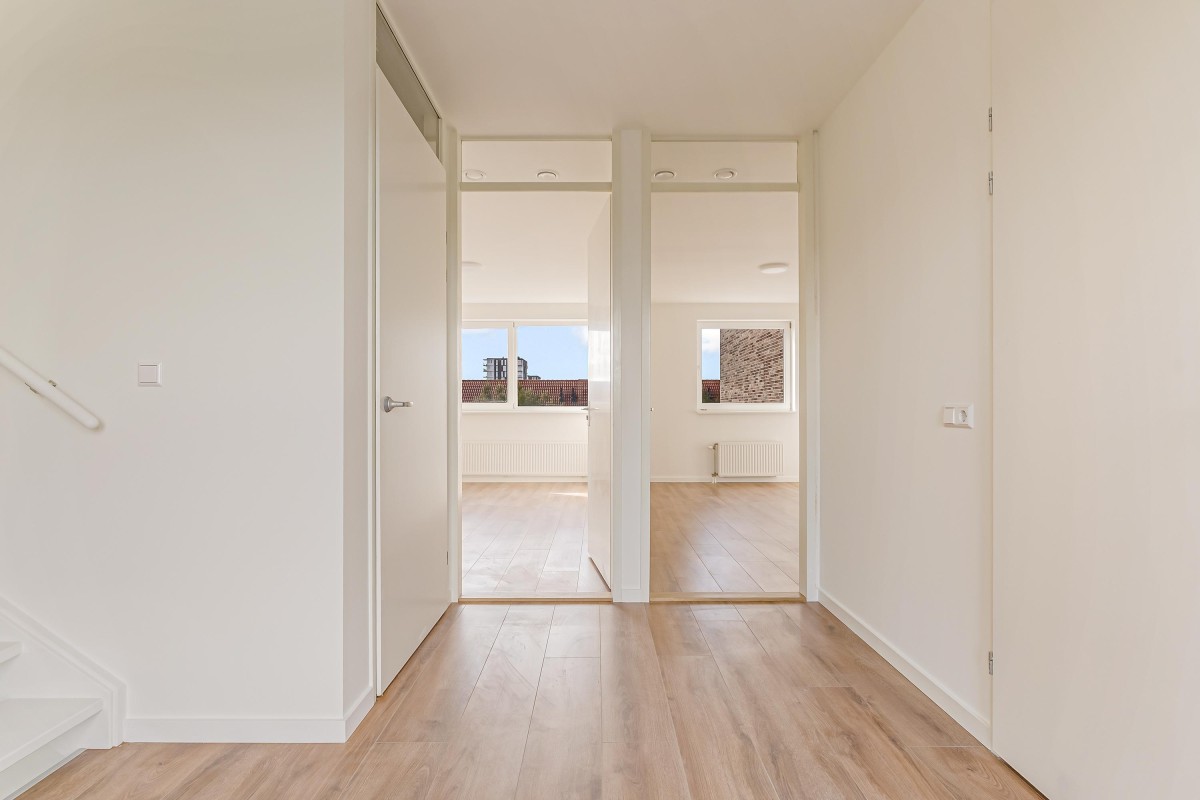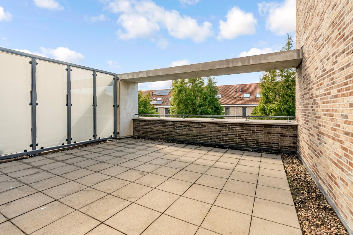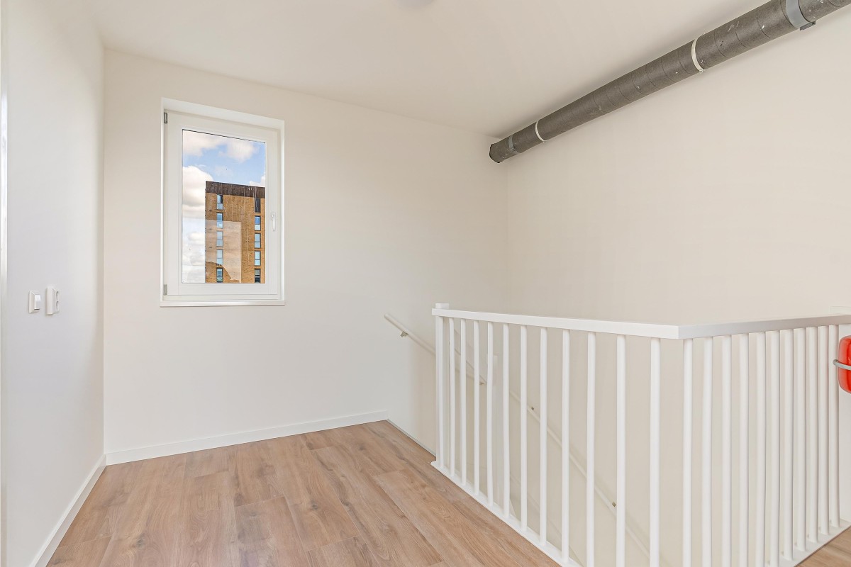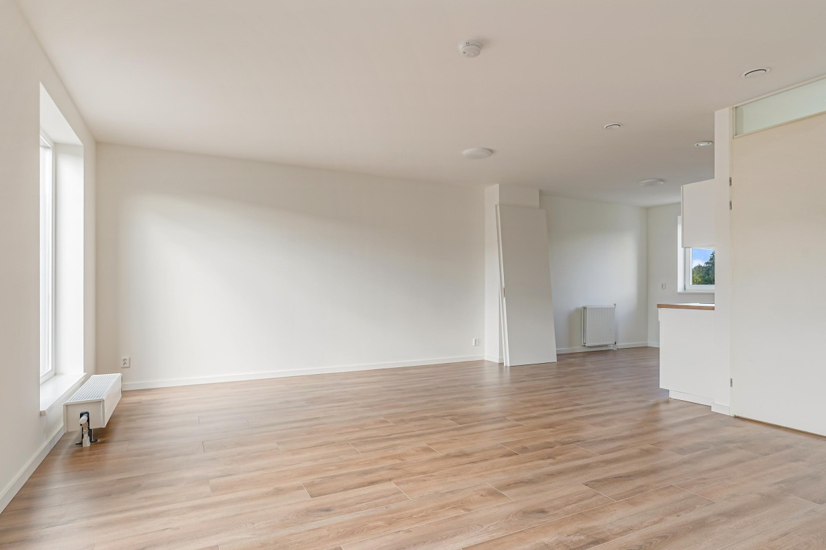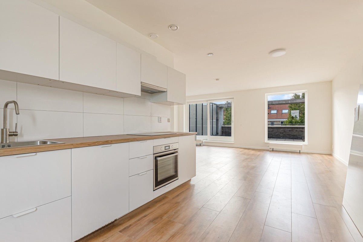 Spacious landing with natural light and access to the toilet, the spacious living room with open-plan kitchen, and roof terrace. The simple fitted kitchen is located at the front of the house. From the living room, sliding doors provide access to the expansive 45m² southwest-facing roof terrace.