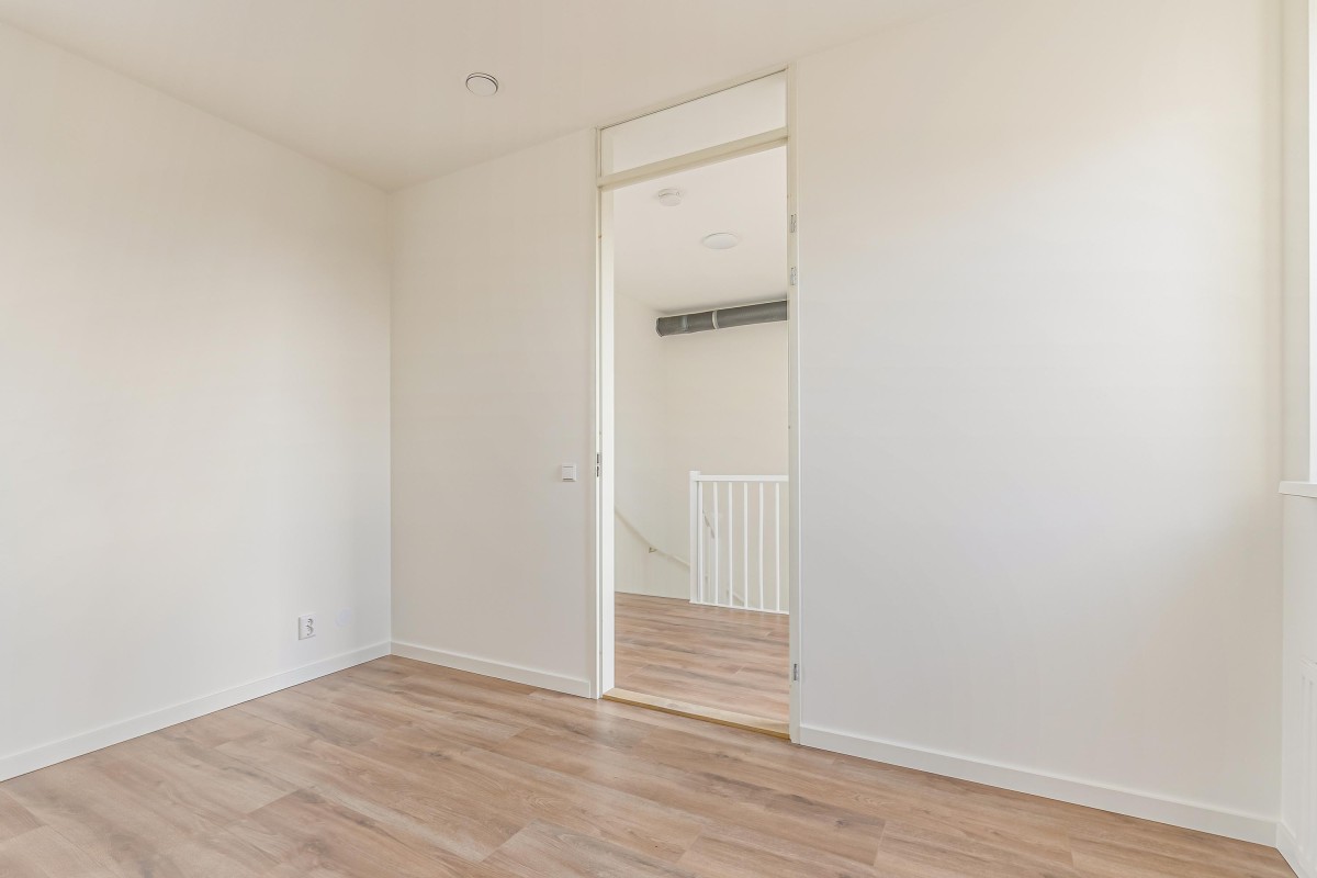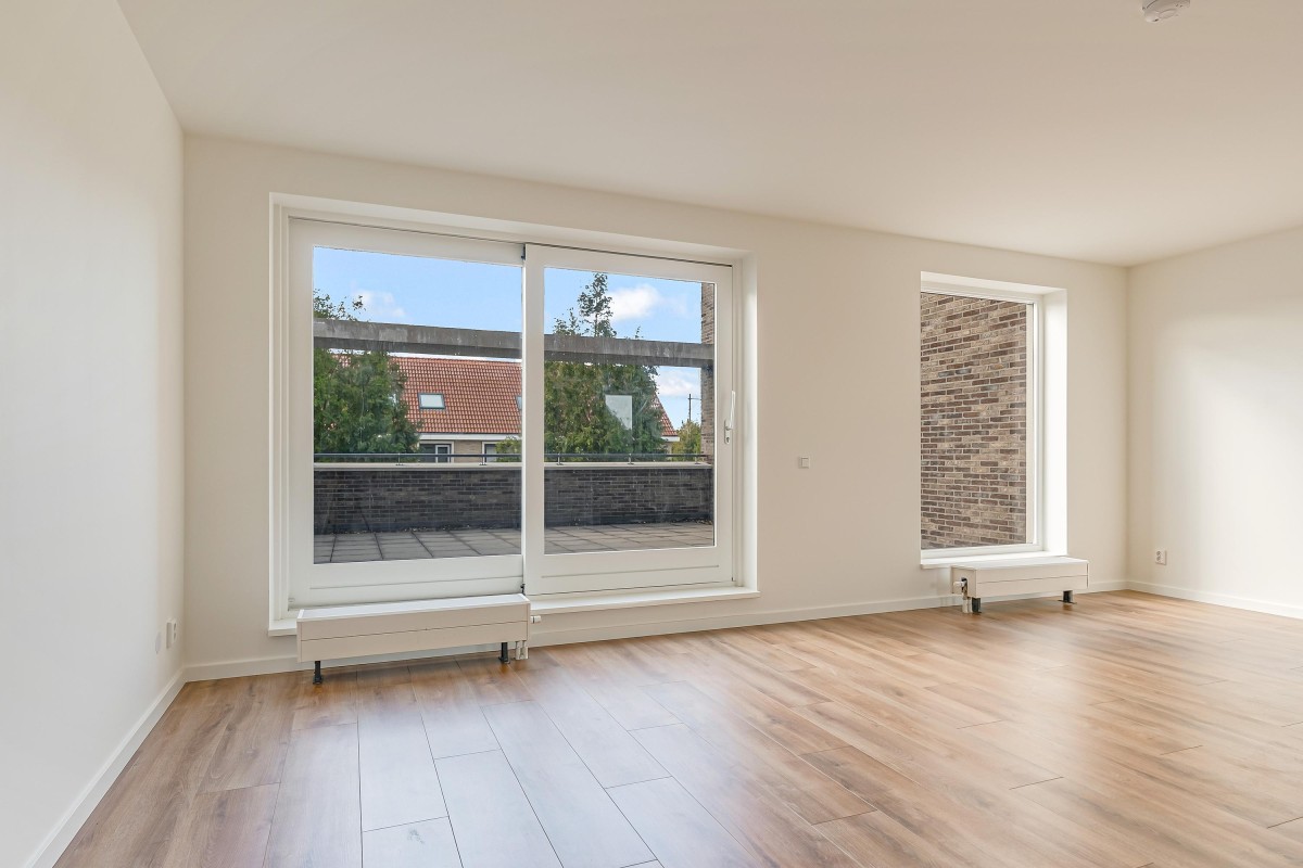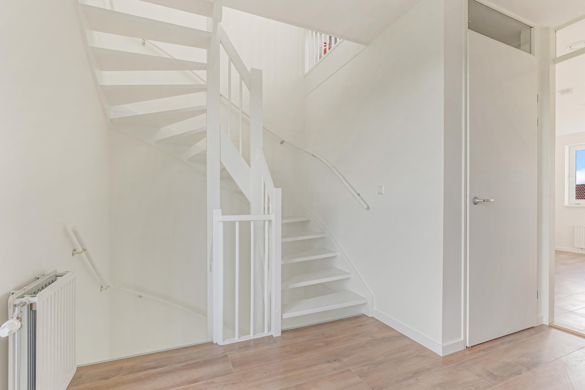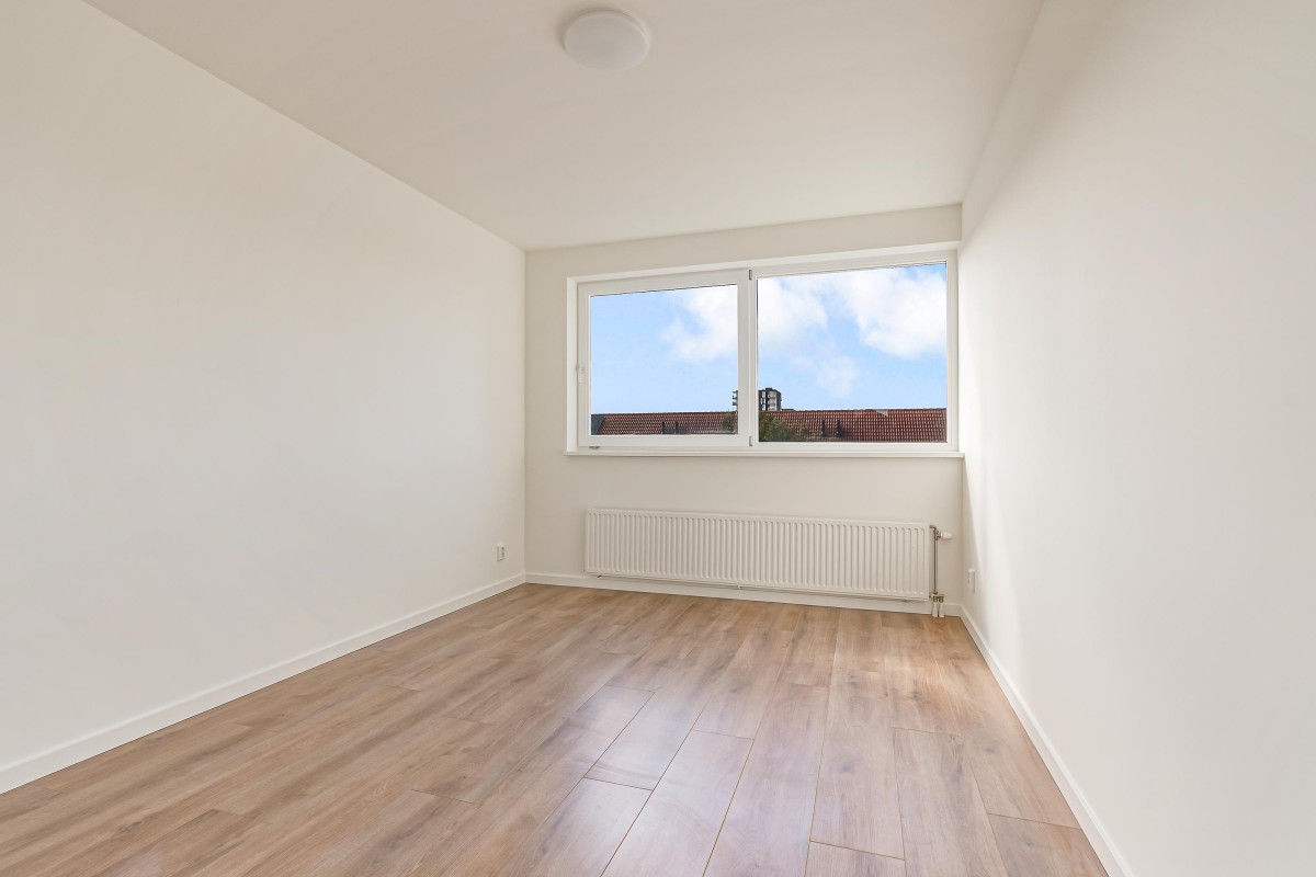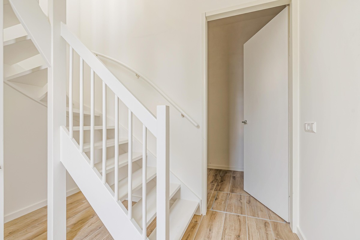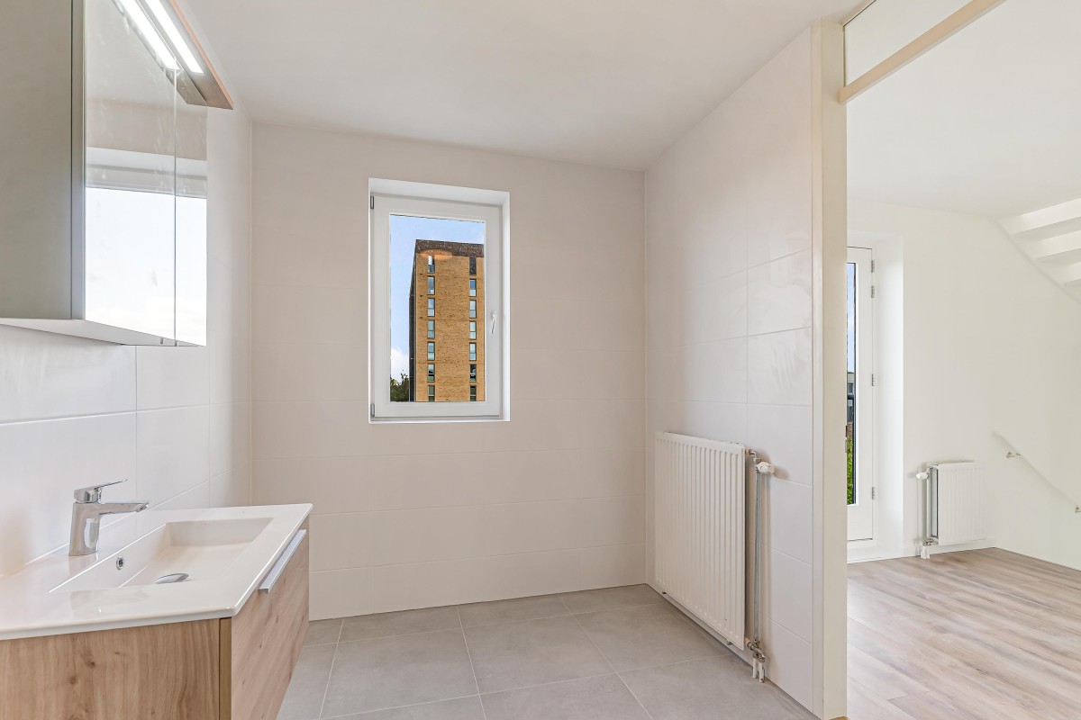 Spacious landing with natural light and access to the toilet, the spacious living room with open-plan kitchen, and roof terrace. The simple fitted kitchen is located at the front of the house. From the living room, sliding doors provide access to the expansive 45m² southwest-facing roof terrace.