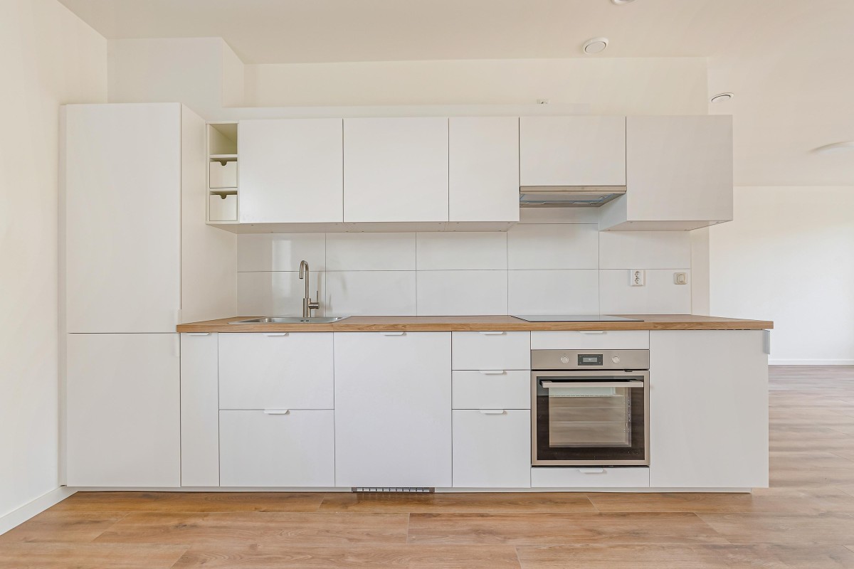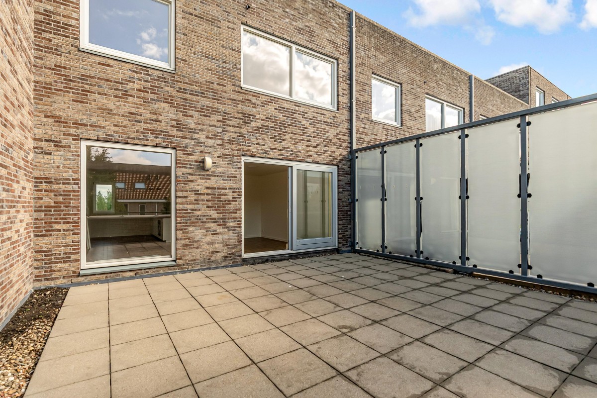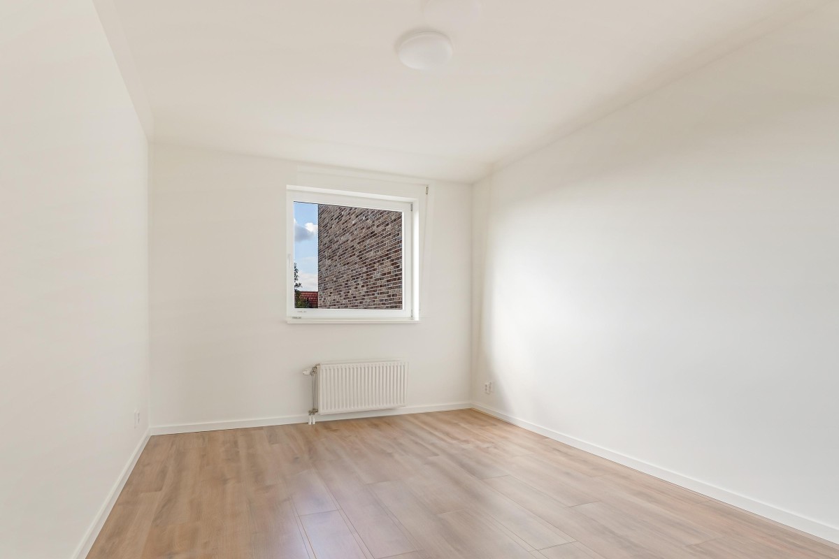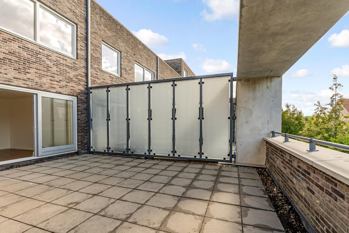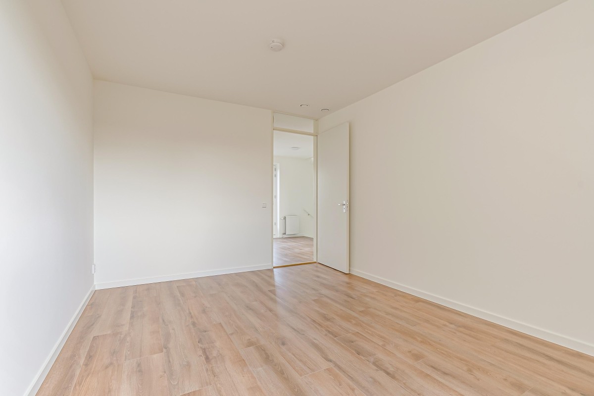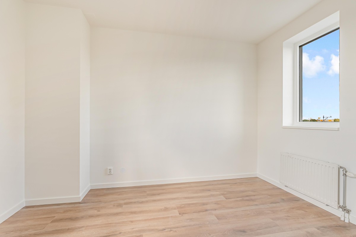 Spacious landing with natural light and access to the toilet, the spacious living room with open-plan kitchen, and roof terrace. The simple fitted kitchen is located at the front of the house. From the living room, sliding doors provide access to the expansive 45m² southwest-facing roof terrace.