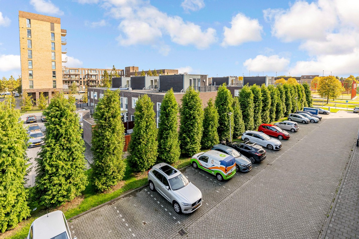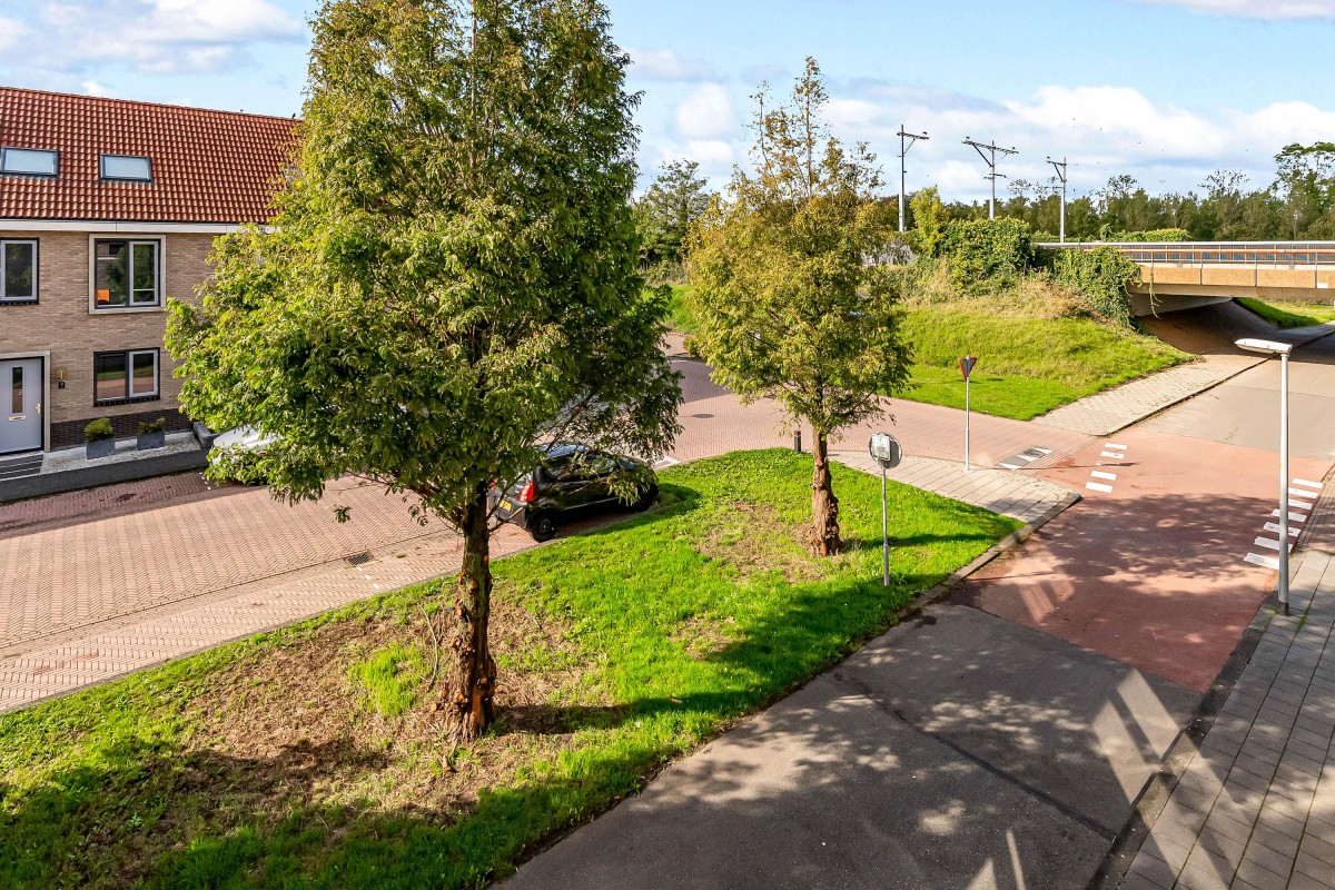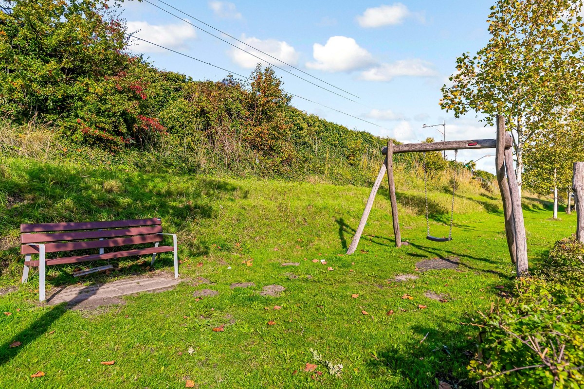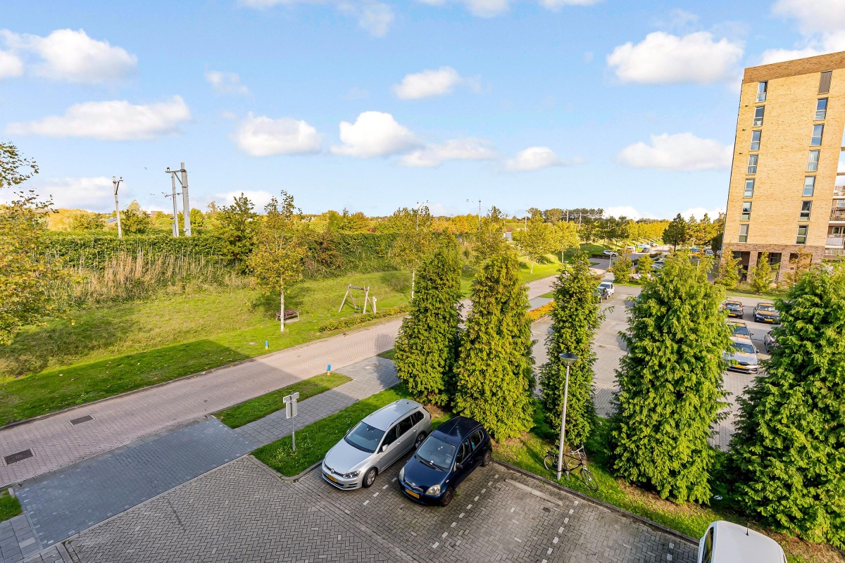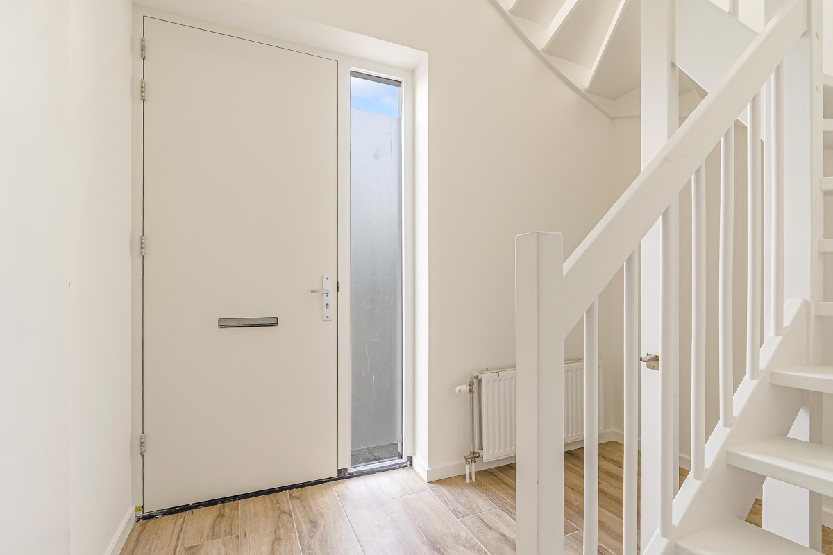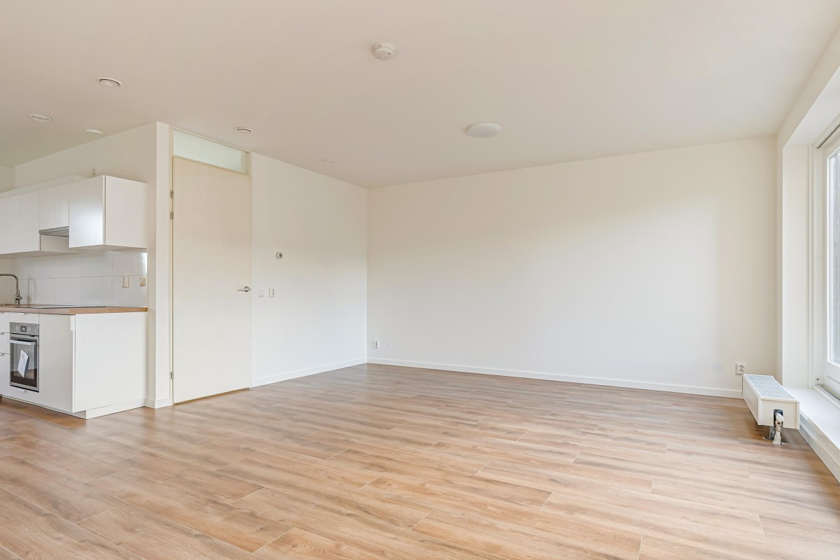 Spacious landing with natural light and access to the toilet, the spacious living room with open-plan kitchen, and roof terrace. The simple fitted kitchen is located at the front of the house. From the living room, sliding doors provide access to the expansive 45m² southwest-facing roof terrace.