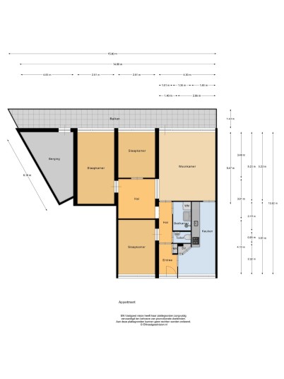 Lees verderTo the right, you will find the kitchen, equipped with a kitchen unit, district heating connection, and space for a cozy dining area. The kitchen connects to the bright, spacious living room, which provides access to the wide balcony. The balcony also leads to an indoor storage space. From the living room, a second door leads to a large central hall, providing access to two bedrooms at the rear of the house.