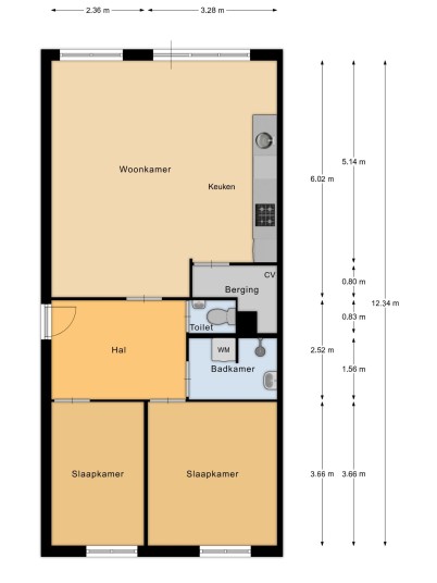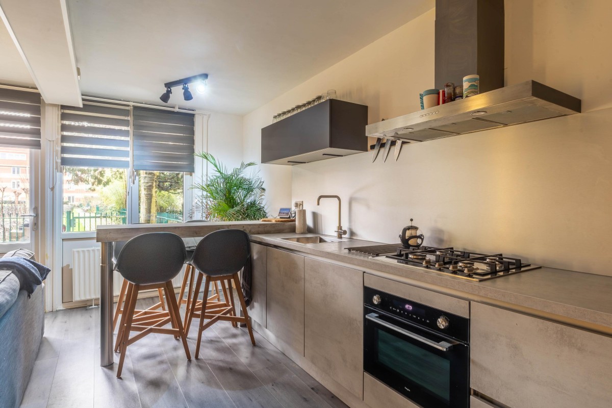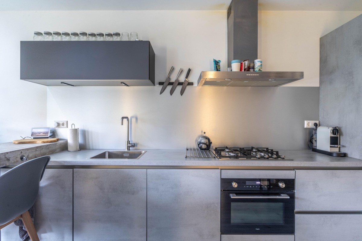 At the rear, you will find the living room with open kitchen spanning the full width of the apartment. The kitchen comes equipped with various built-in appliances, including a dishwasher, fridge-freezer, and a 4-burner gas stove with extractor hood. This open space provides plenty of room for a cozy dining and sitting area. Additionally, there is a convenient built-in storage cupboard housing the central heating system (Intergas, 2019).