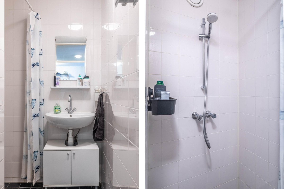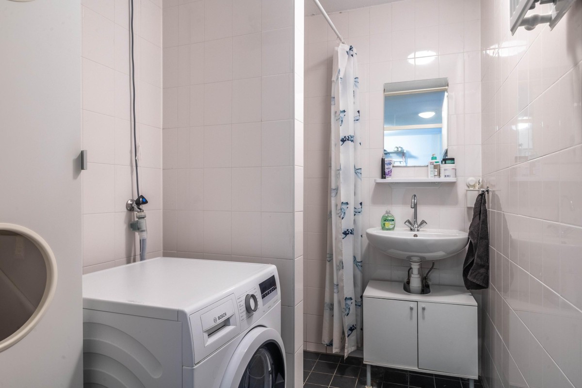Lees verderThe bathroom is fitted with a shower, sink, and a washing machine connection. The toilet with a small hand basin is located in a separate room.