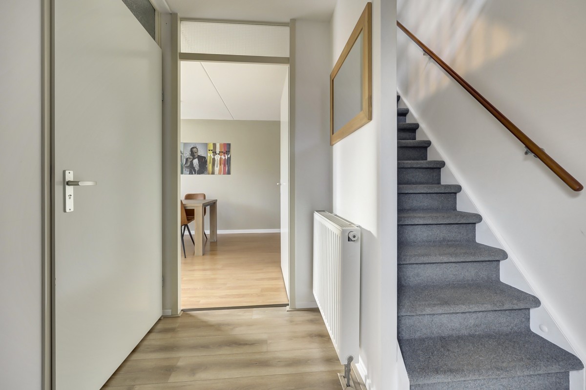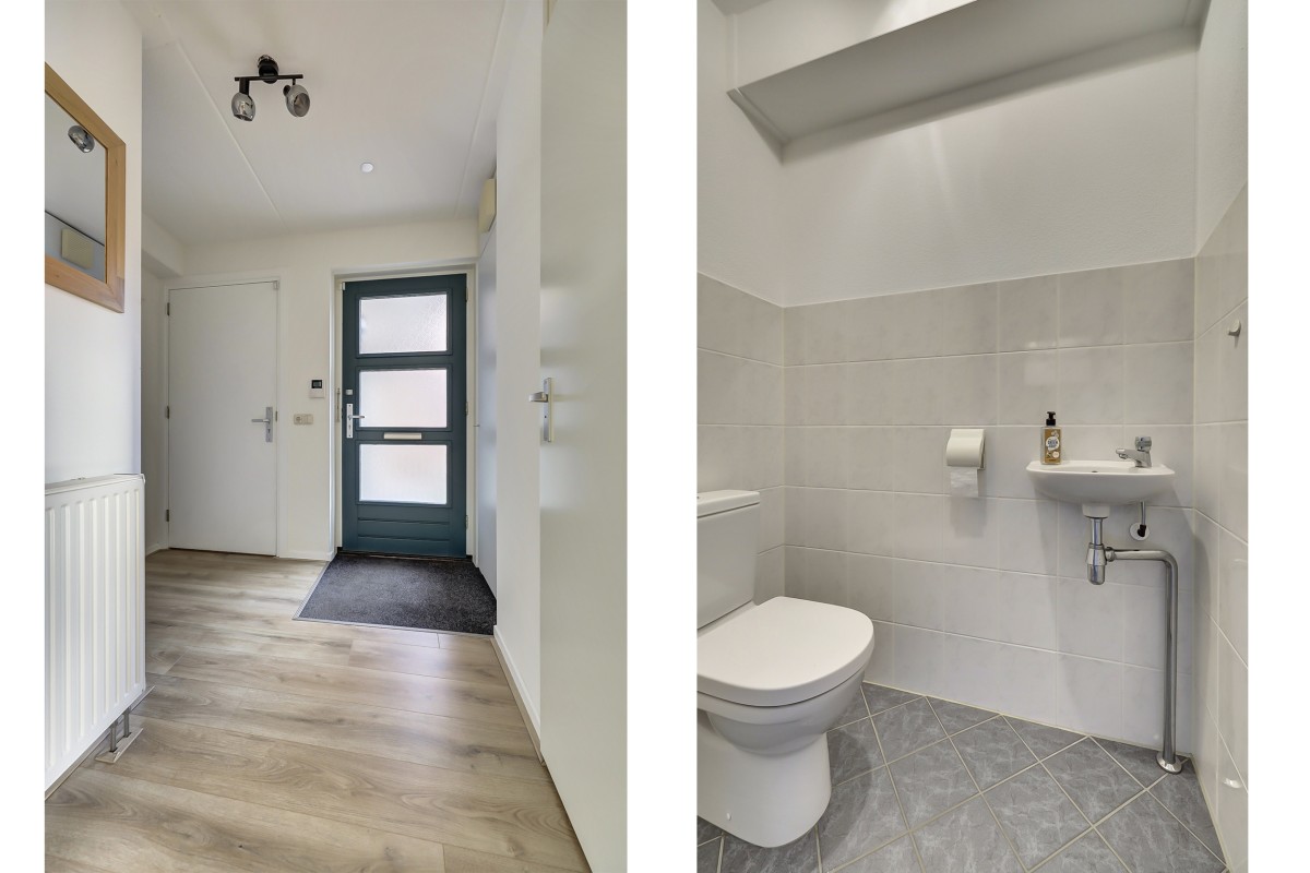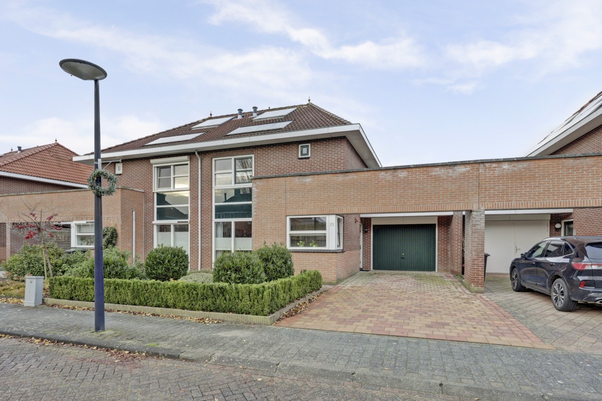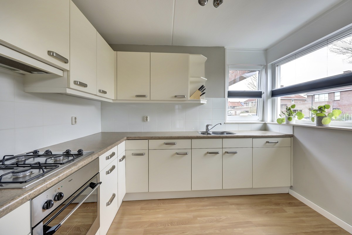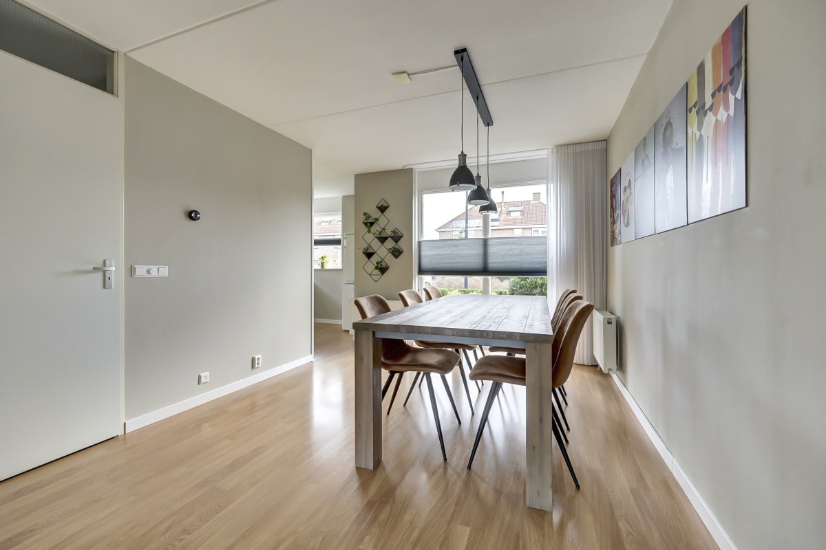 Begane grond: entree, lichte hal met meterkast en garderobe, lichte toiletruimte met toilet en fonteintje, straatgerichte eethoek met erker en uitzicht op de straat. De keuken is in hoek opgesteld en voorzien van veel werkruimte en kastruimte alsmede een ingebouwde vaatwasser, oven, gaskookplaat met afzuiging en een losse koelkast. Aan de achterzijde van de woning is een ruime woonkamer over de gehele breedte van de woning gesitueerd. Vanuit de woonkamer toegang tot de tuin. De tuin is op het westen gesitueerd en mooi aangelegd met o.a. een groot terras tegen de woning en een recent aangelegd gazon. De aangebouwde stenen garage is bereikbaar middels een loopdeur vanuit de tuin en een loopdeur binnendoor vanuit de hal.