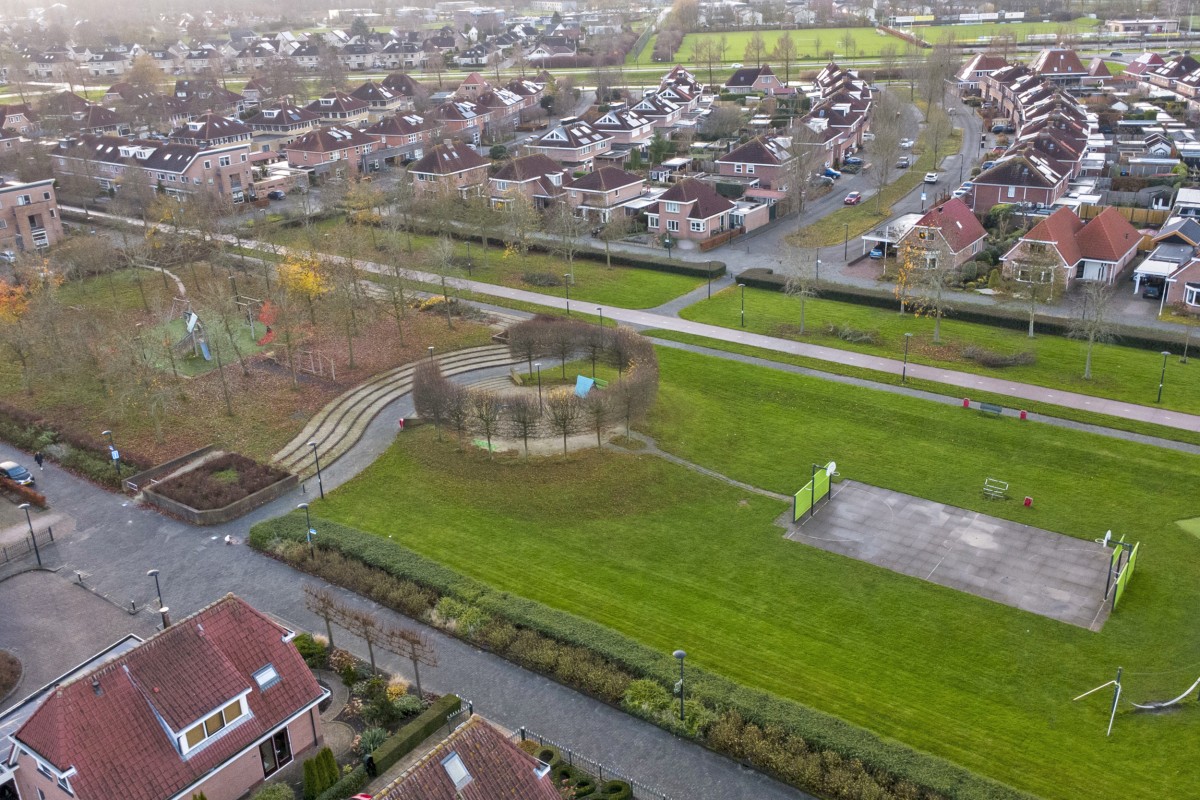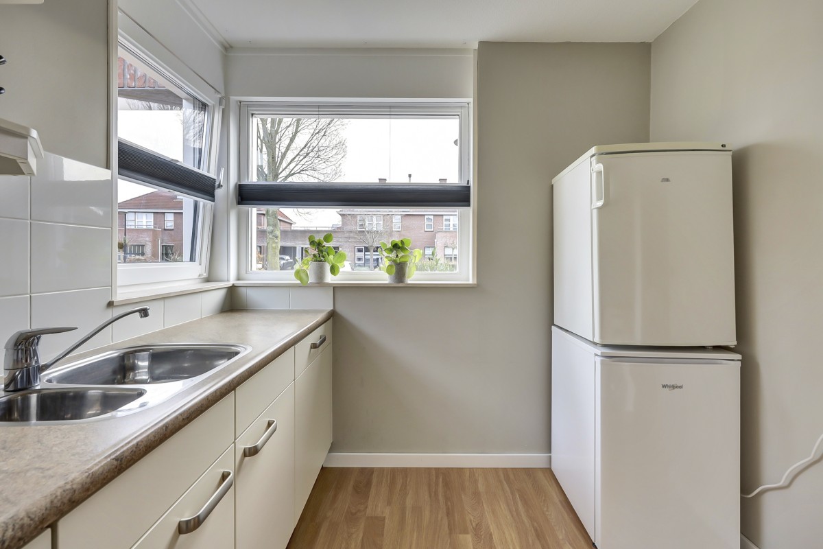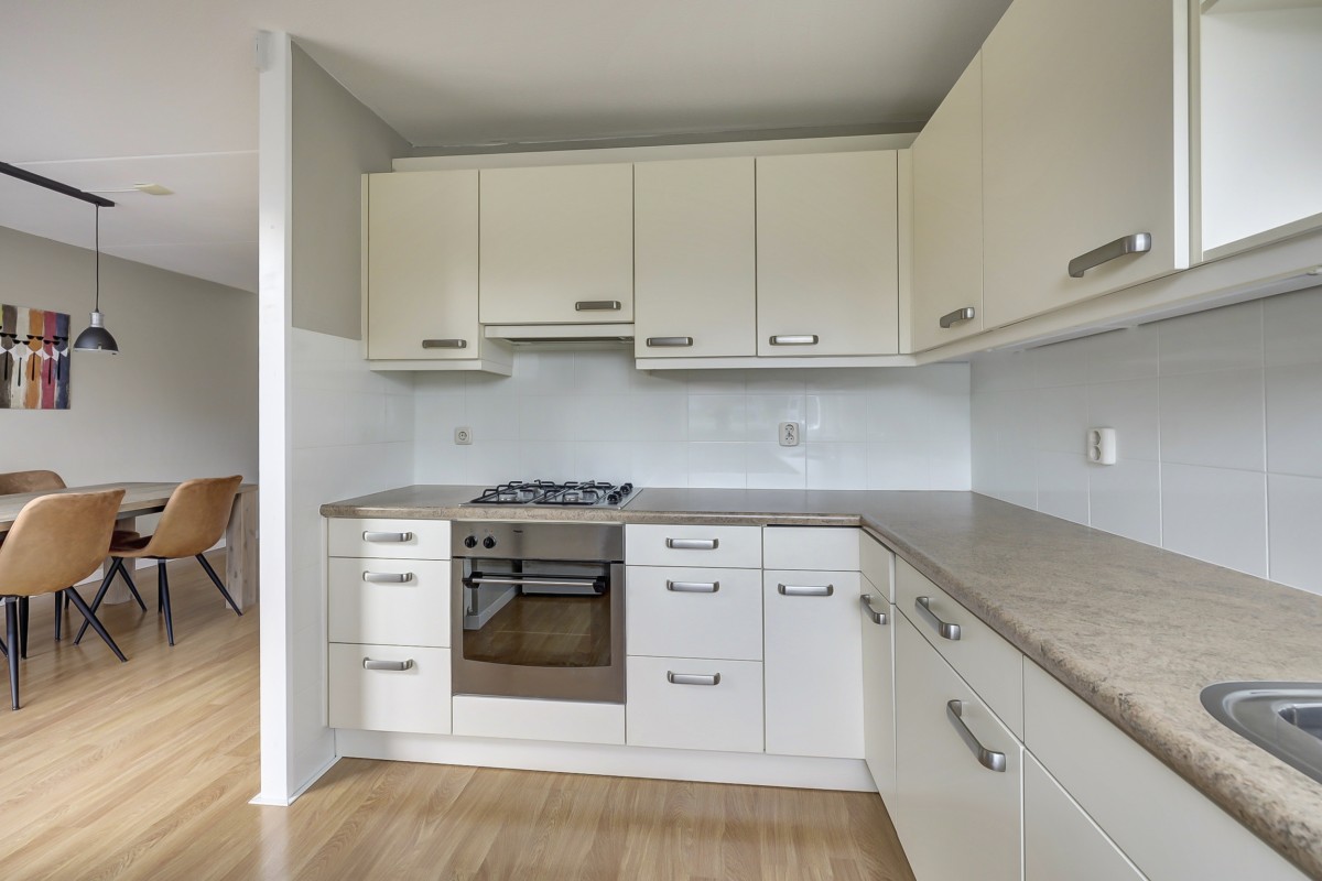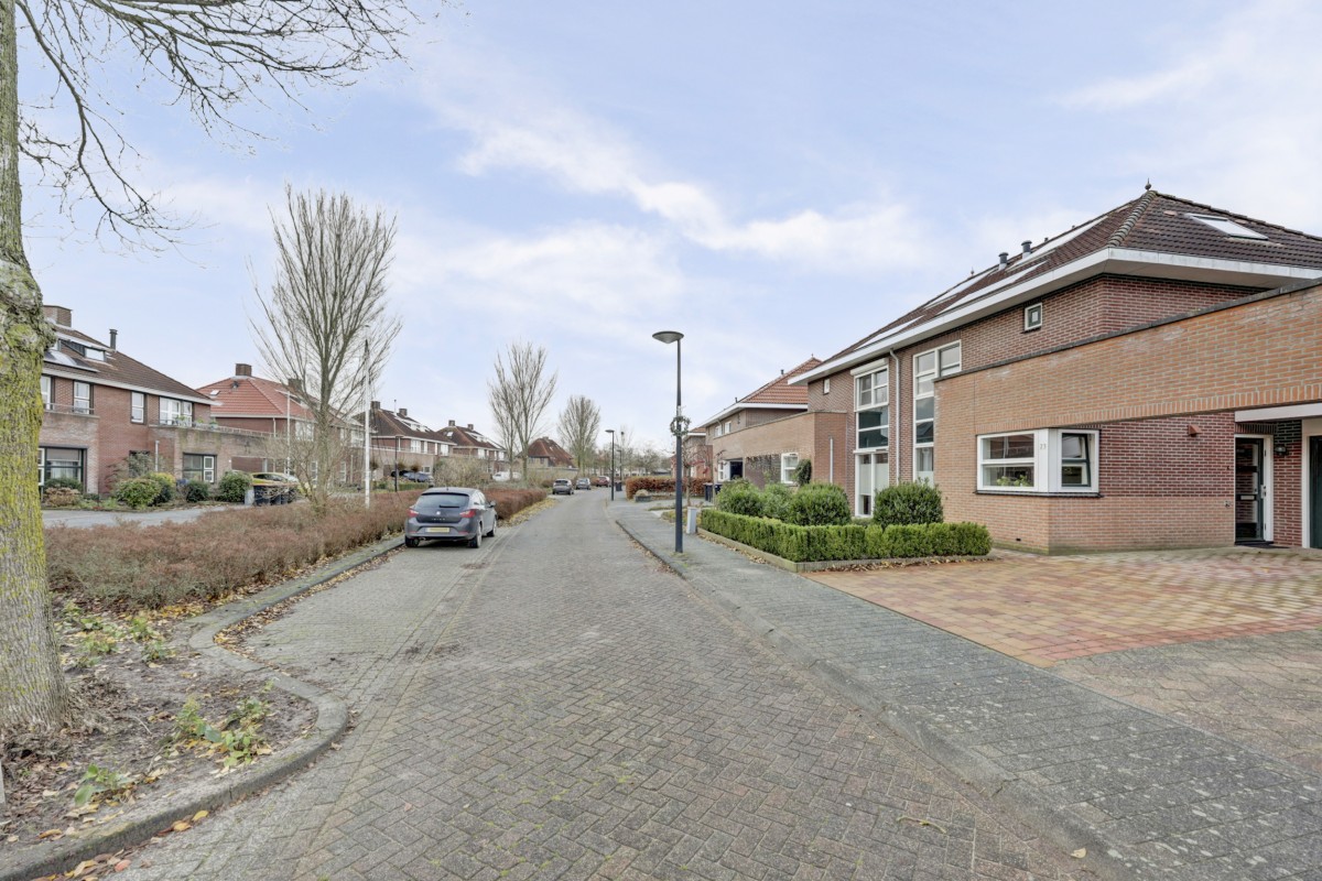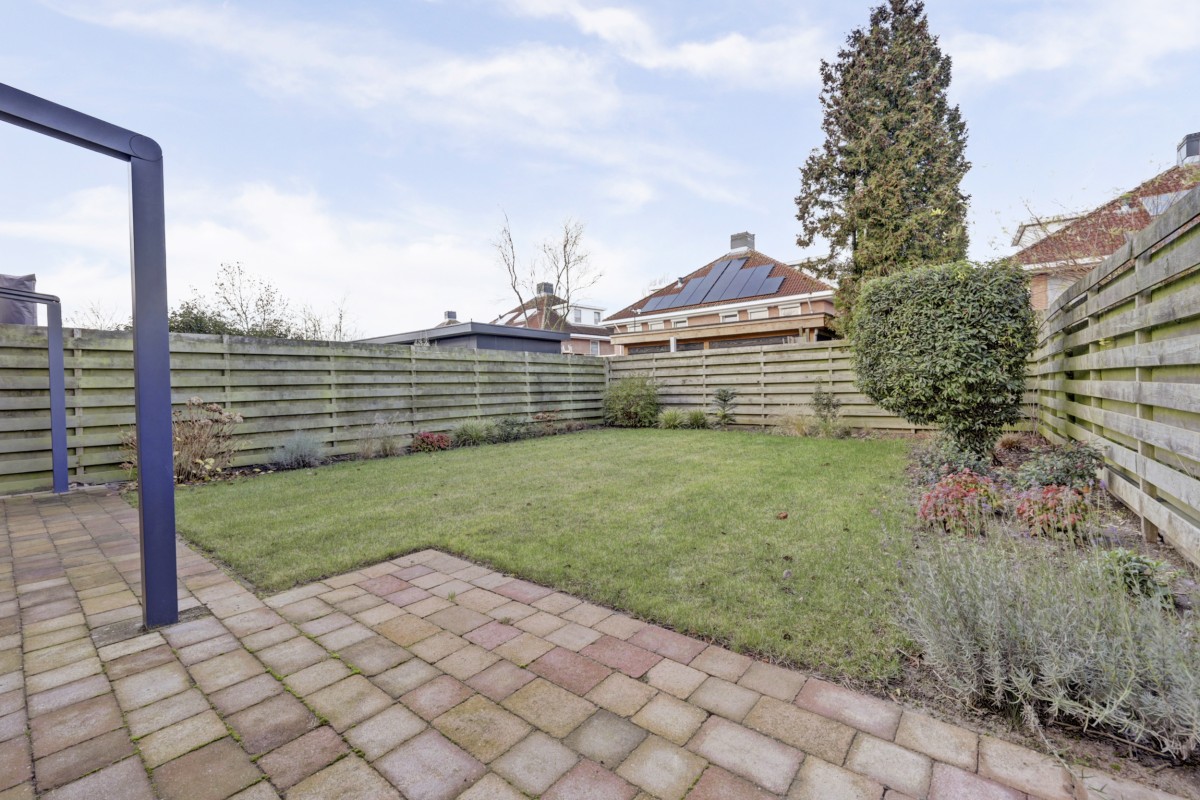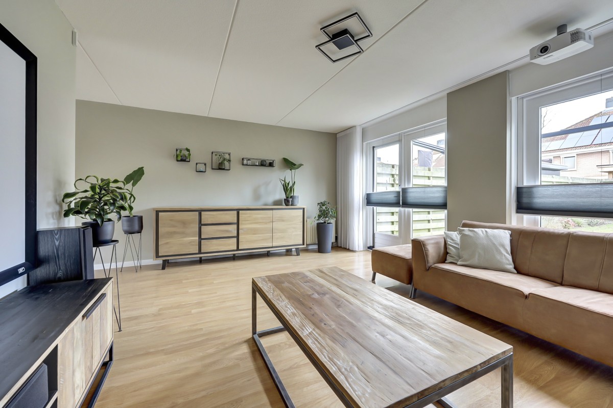 Begane grond: entree, lichte hal met meterkast en garderobe, lichte toiletruimte met toilet en fonteintje, straatgerichte eethoek met erker en uitzicht op de straat. De keuken is in hoek opgesteld en voorzien van veel werkruimte en kastruimte alsmede een ingebouwde vaatwasser, oven, gaskookplaat met afzuiging en een losse koelkast. Aan de achterzijde van de woning is een ruime woonkamer over de gehele breedte van de woning gesitueerd. Vanuit de woonkamer toegang tot de tuin. De tuin is op het westen gesitueerd en mooi aangelegd met o.a. een groot terras tegen de woning en een recent aangelegd gazon. De aangebouwde stenen garage is bereikbaar middels een loopdeur vanuit de tuin en een loopdeur binnendoor vanuit de hal.