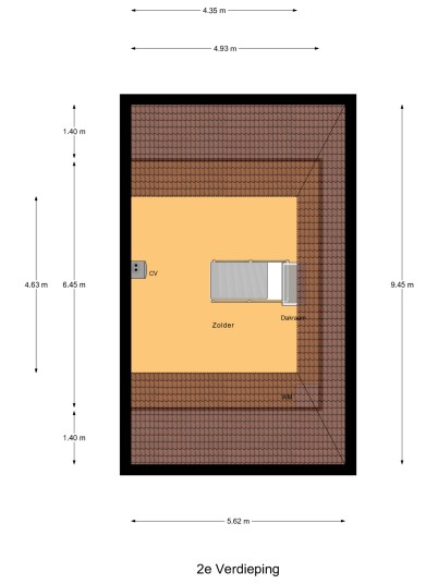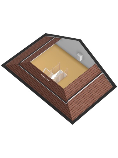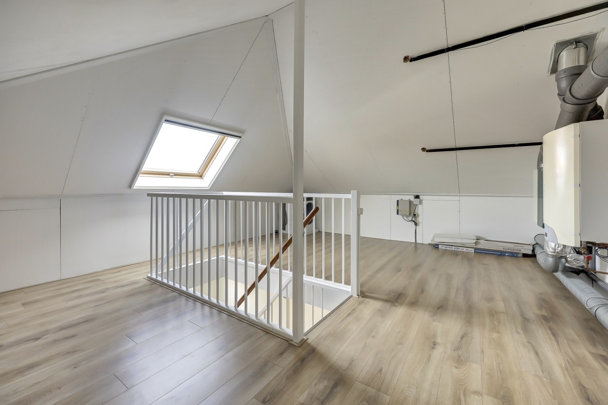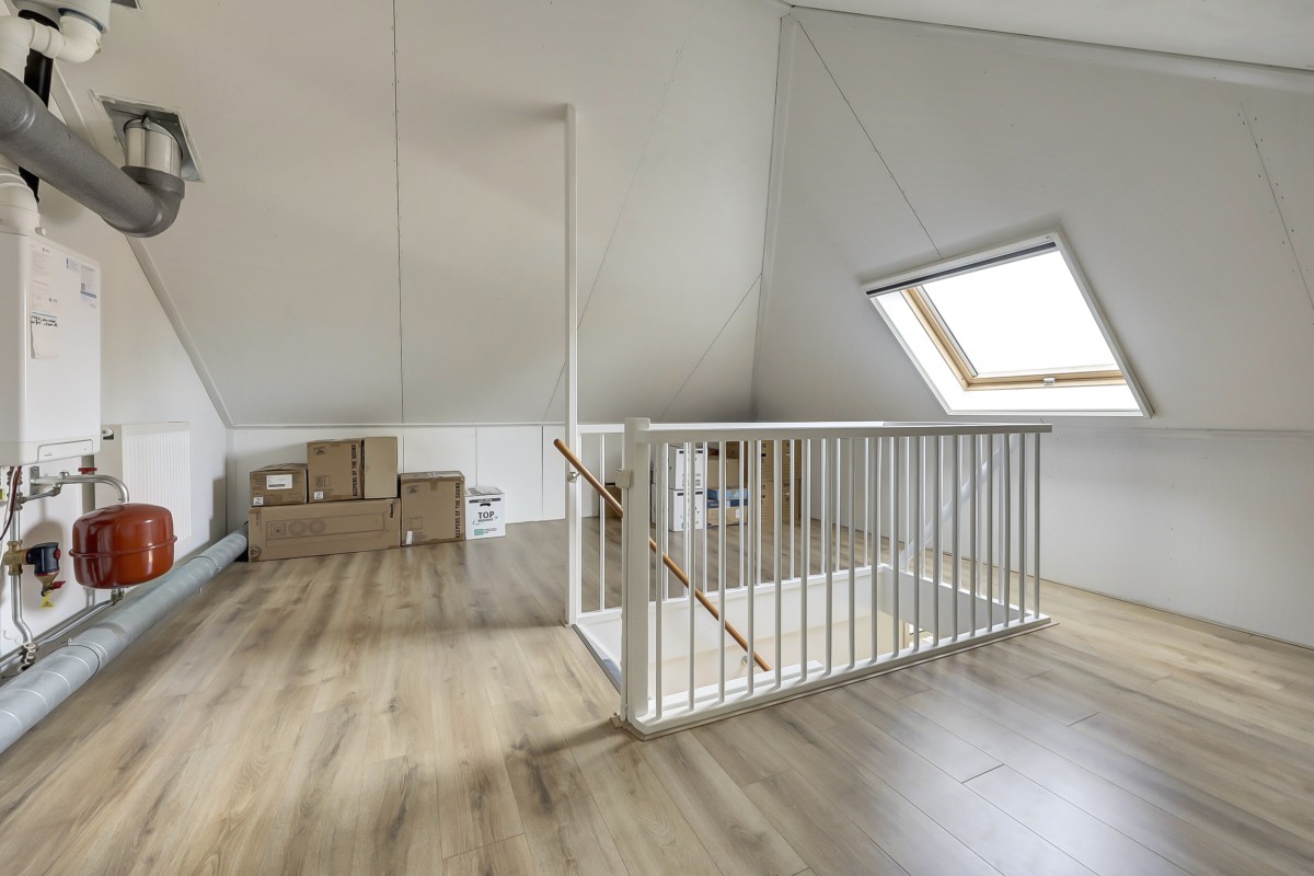 Tweede verdieping: vaste trap naar de riante zolder met dakraam. Op de zolder zijn de wasmachine, droger, mechanische ventilatie en c.v.-ketel (Intergas HR) opgesteld. Een prachtige 4e slaapkamer is hier gemakkelijk te realiseren. Achter de knieschotten is veel bergruimte beschikbaar.