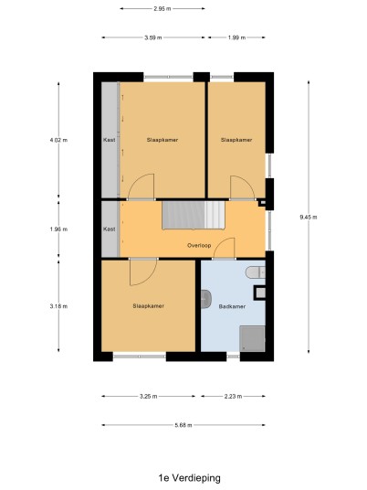 Eerste verdieping: overloop met aansluitend 3 mooie slaapkamers en de badkamer voorzien van douche met cabine, 2e toilet en wastafelmeubel. De slaapkamers en overloop zijn voorzien van 2 vaste kasten.