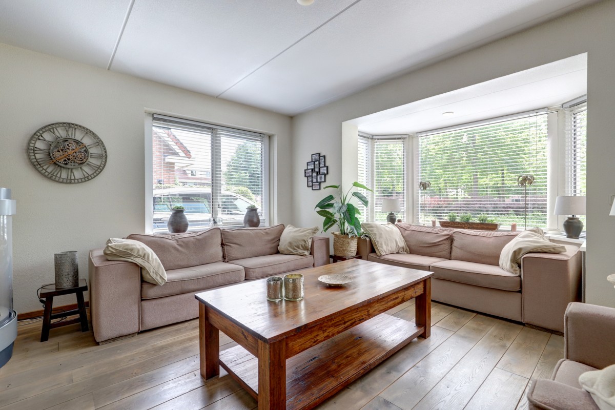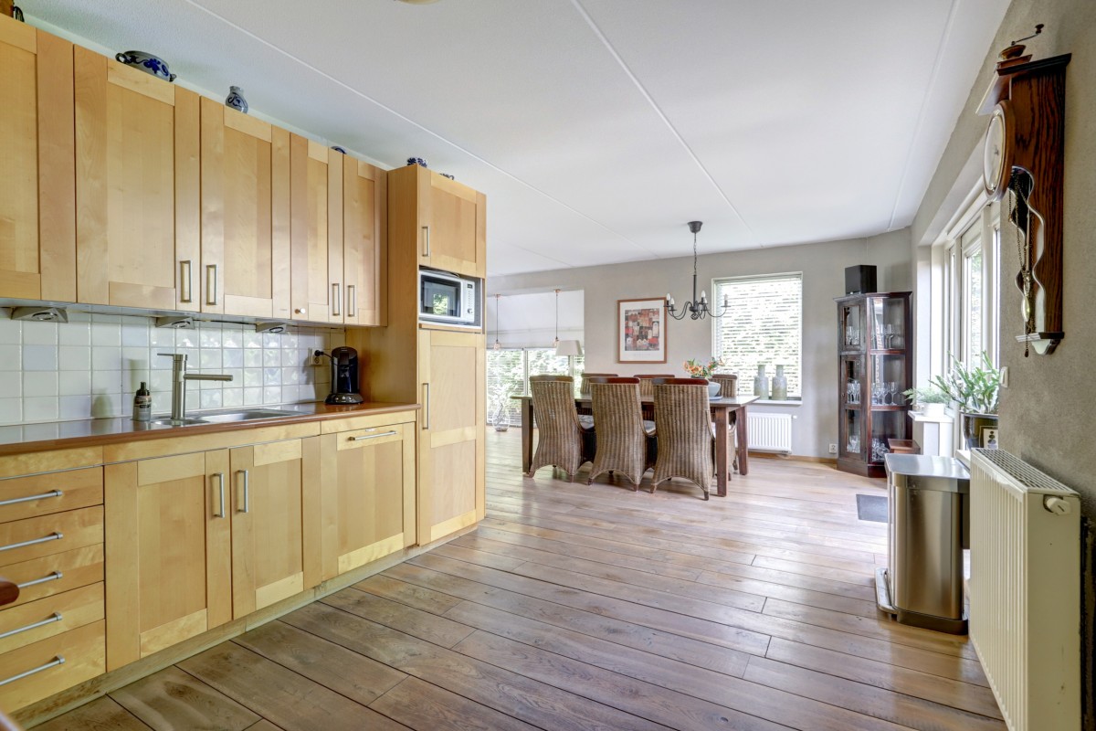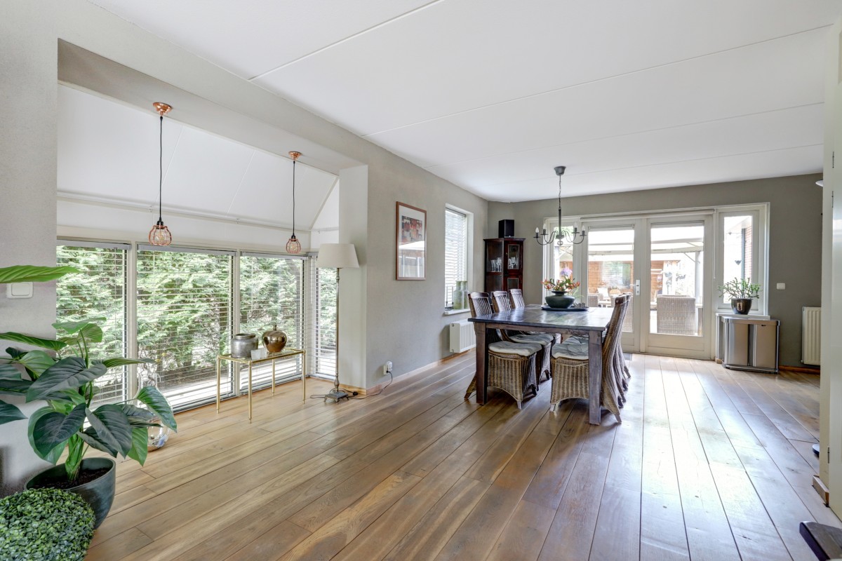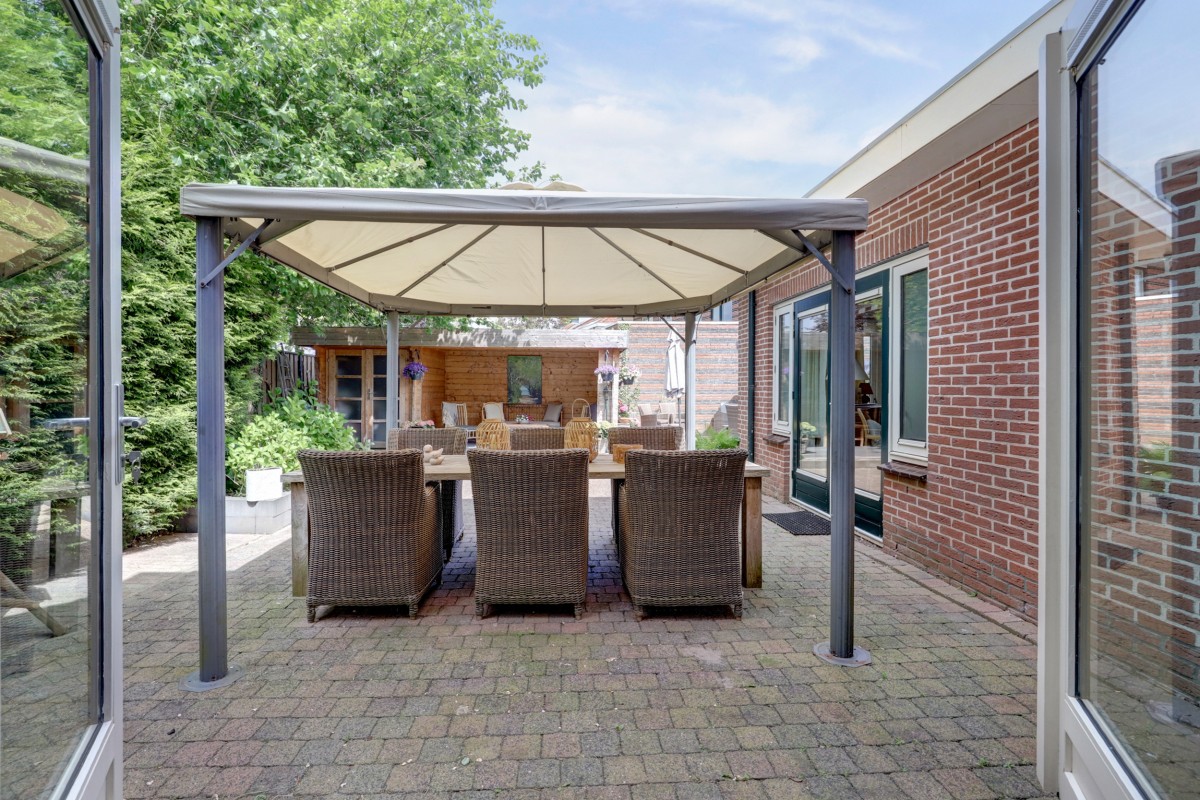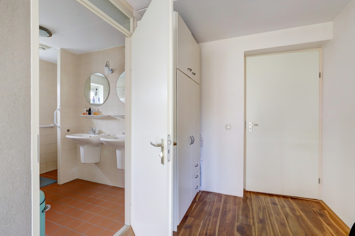 Begane grond: overdekte entree, ruime hal met vide, garderobe, meterkast, toiletruimte met hangcloset en fonteintje, trapopgang naar de eerste verdieping. Doorgang naar de L-vormige woonkamer voorzien van twee erkers en een gashaard. Aan de achterzijde van de woning is een brede eetkamer gelegen met aansluitend een keuken hoekopstelling. De keuken is voorzien van ingebouwde apparatuur en een groot werkblad. Naast de keuken biedt een deur toegang tot de bijkeuken waar de wasmachine en droger staan opgesteld. Grenzend aan de tuin is de prachtig grote slaapkamer met aangrenzende badkamer gelegen. De badkamer beschikt over een 2 wastafels, een hoge kast en inloopdouche. Vanuit de slaapkamer en eetkamer is de achtertuin bereikbaar welke onderhoudsarm aangelegd is en heerlijk beschut gelegen is. Langs beide zijden van de woning is de achtertuin bereikbaar welke tevens beschikt over een vrijstaande berging met overkapping. Aan de voorzijde is een oprit aangelegd welke deels overdekt is middels een carport. De woning beschikt aan de voorzijde tevens over een inpandige berging met openslaande houten deuren.