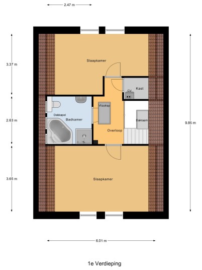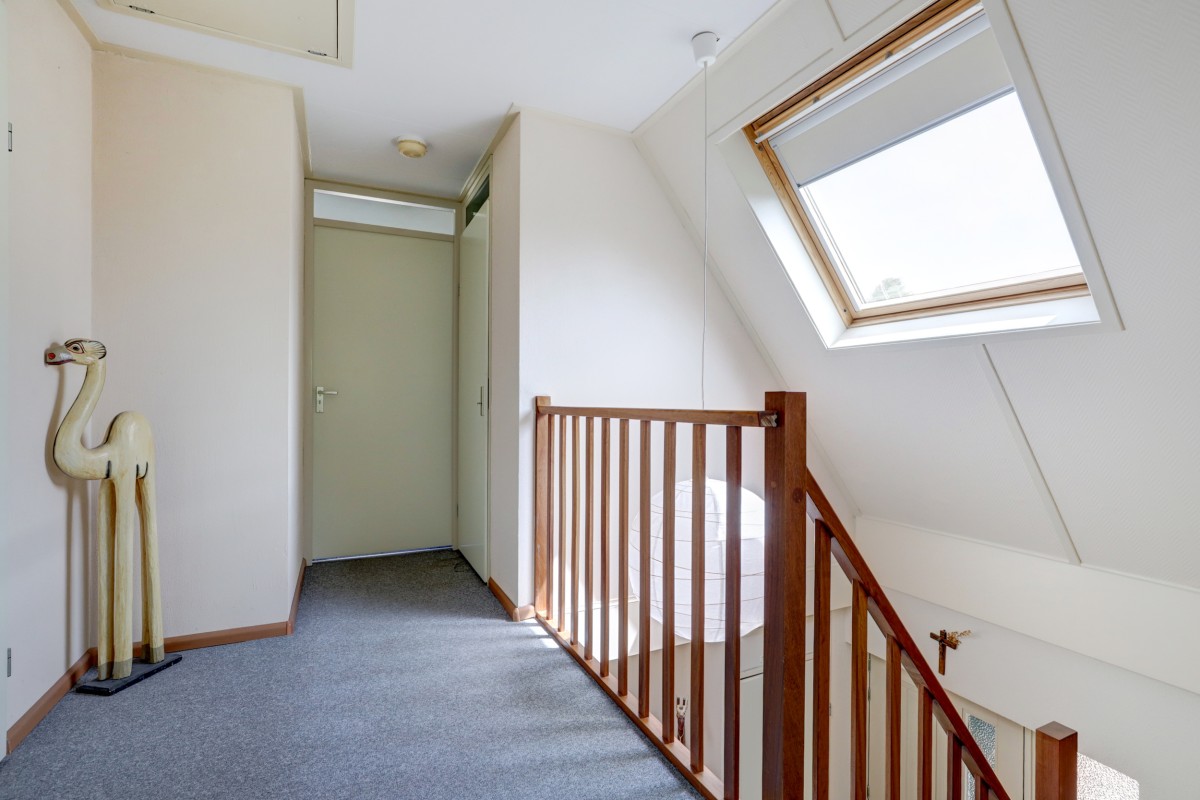 Eerste verdieping: ruime lichte overloop met aansluitend 2 mooie slaapkamers, een bergruimte en de tweede badkamer. De slaapkamer aan de voorzijde is over de gehele breedte van de woning gesitueerd. De tweede slaapkamer is aan de achterzijde is ook over de gehele breedte van het huis. Naast deze kamer bevindt zich een bergruimte waar tevens de nieuwe c.v.-ketel opgesteld is. De badkamer beschikt over een dakkapel, hoekbad, separate douchecabine, 2e toilet en wastafel.