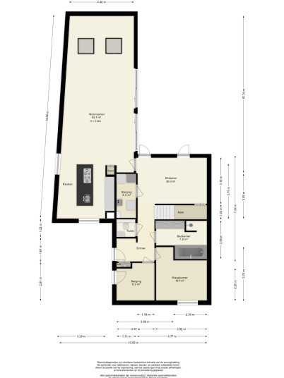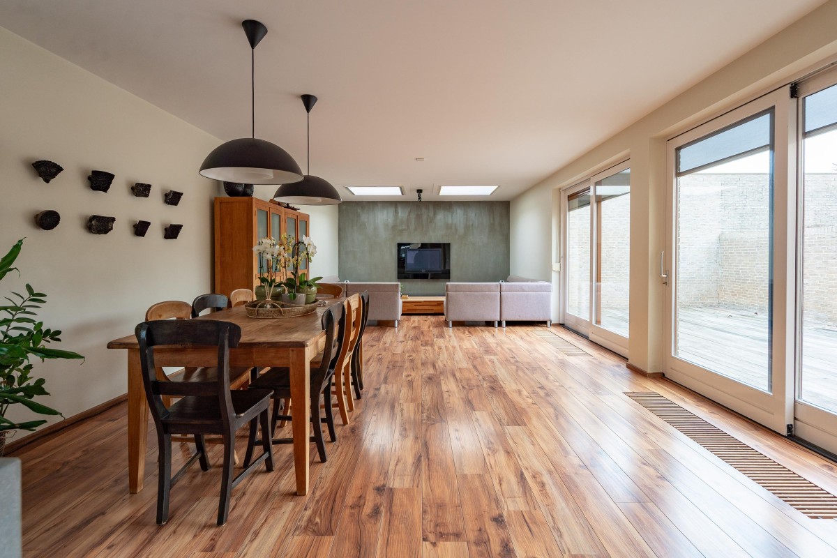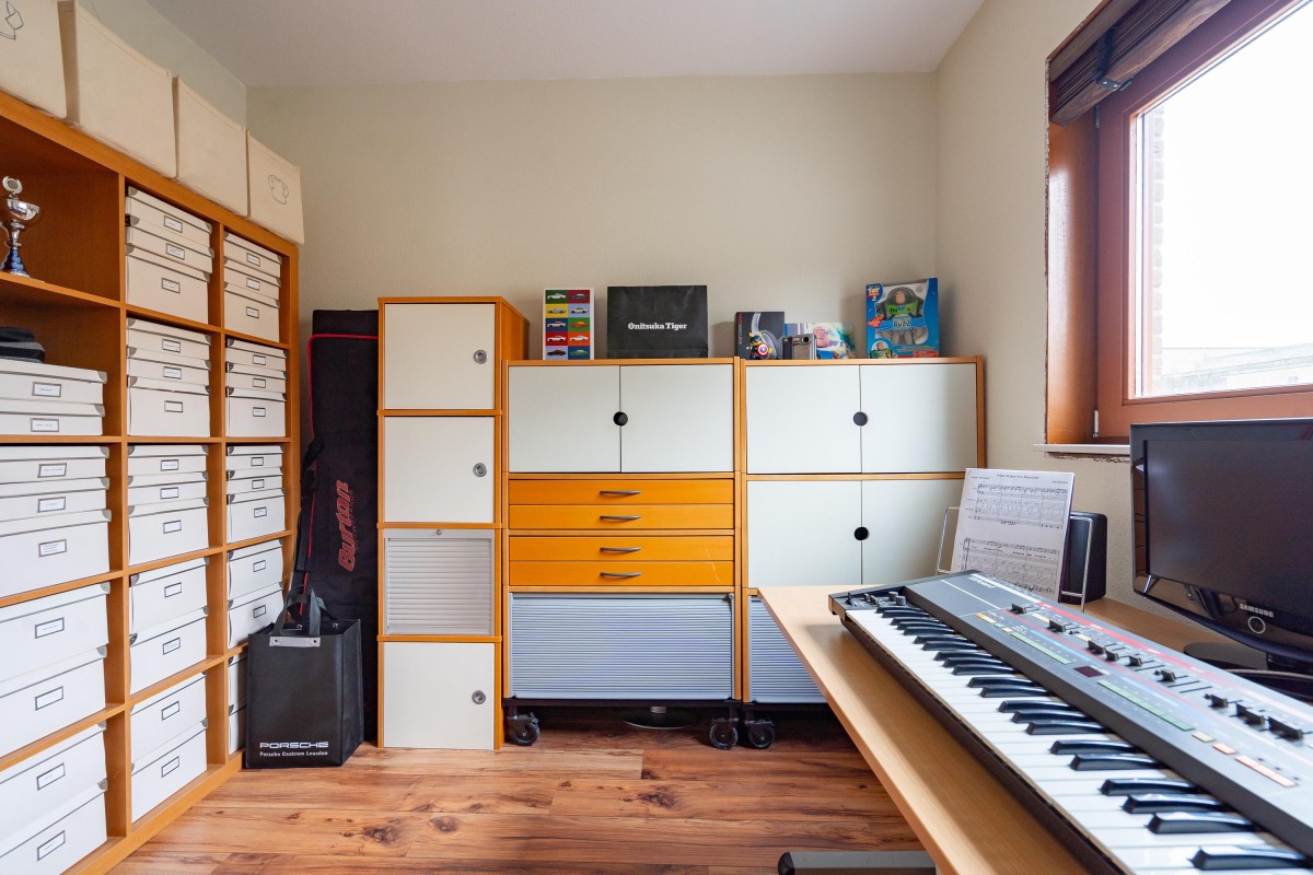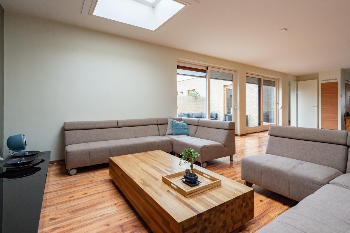 Via the driveway with ample parking space, you reach the indoor storage room and the entrance of the house. The hallway contains the meter cupboard, a toilet with washbasin, and access to the storage room. The corridor leads to the sitting area and the very spacious living room, where large windows provide a pleasant influx of natural light, enhanced by two large skylights above the seating area. Through the sliding doors, you step directly into the sunny, sheltered patio—a wonderful place to relax.