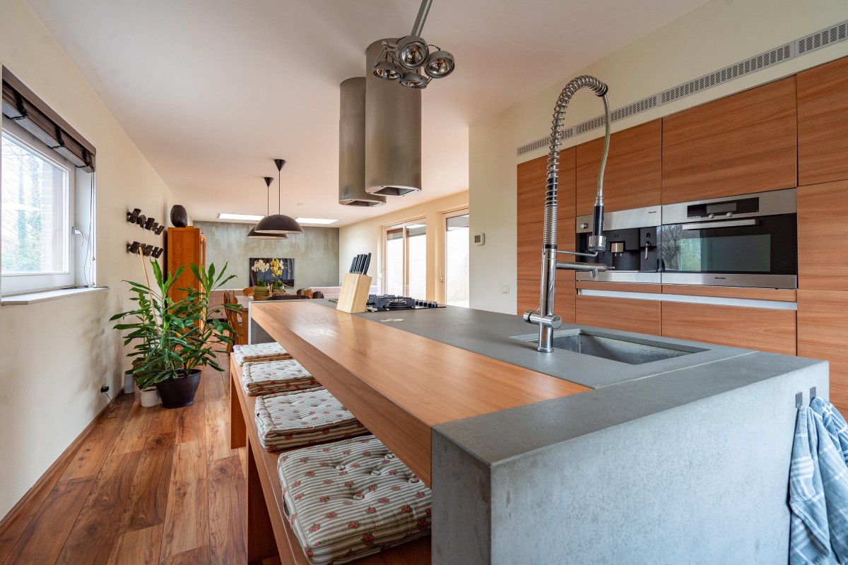 At the front of the house is the open kitchen, fully equipped with a cooking island featuring two separate extractor hoods that vent directly outside, and various built-in appliances such as a gas cooktop, dishwasher, refrigerator, freezer, and combination oven.
