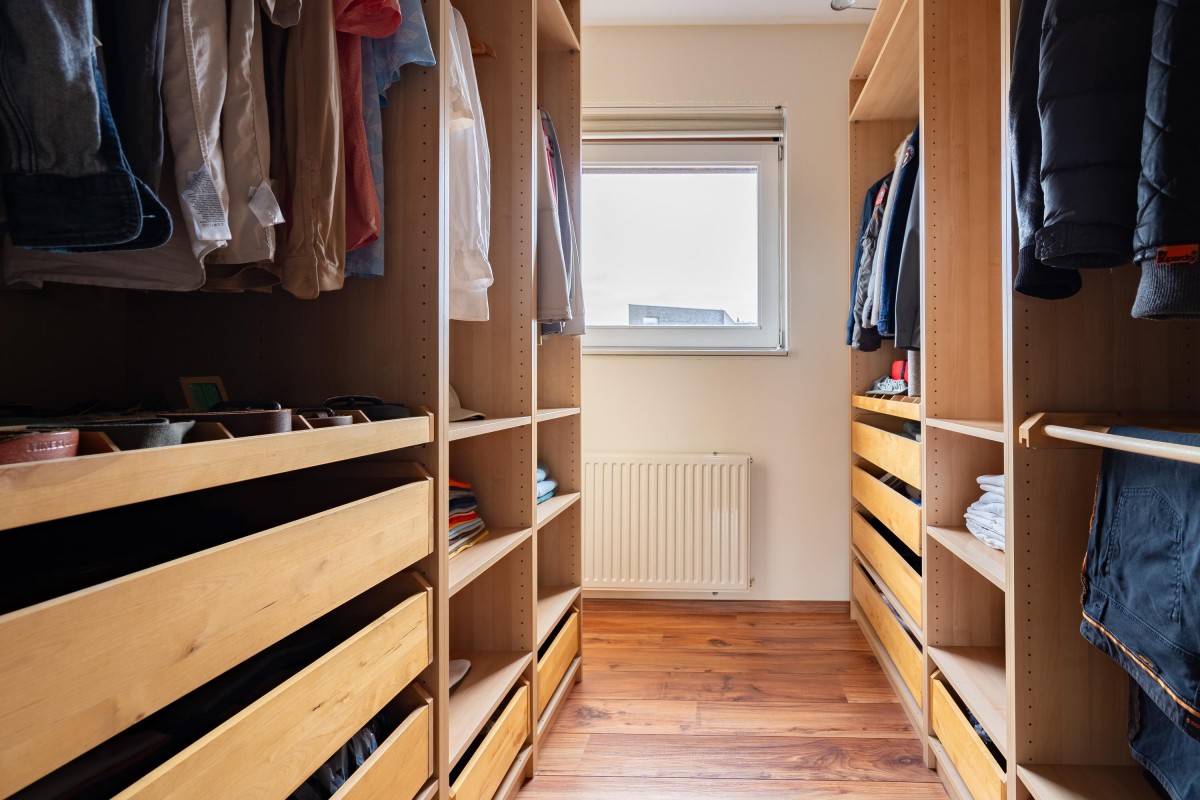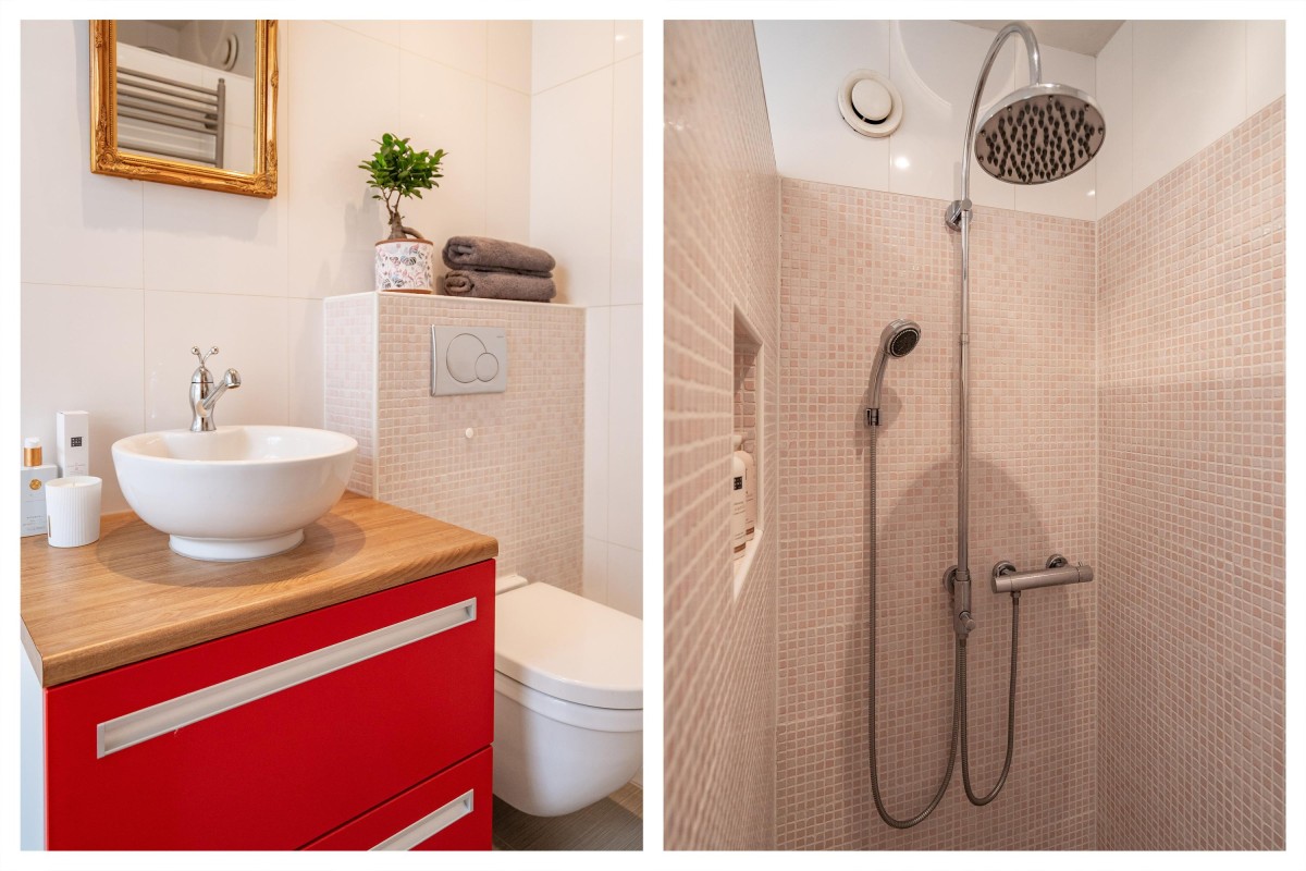 The spacious ground-floor bedroom is also accessible via the hallway. Adjacent is the bright bathroom with walk-in shower, bathtub, and toilet. Furthermore, this level includes the technical room with the central heating system, mechanical ventilation, and washing machine connection.