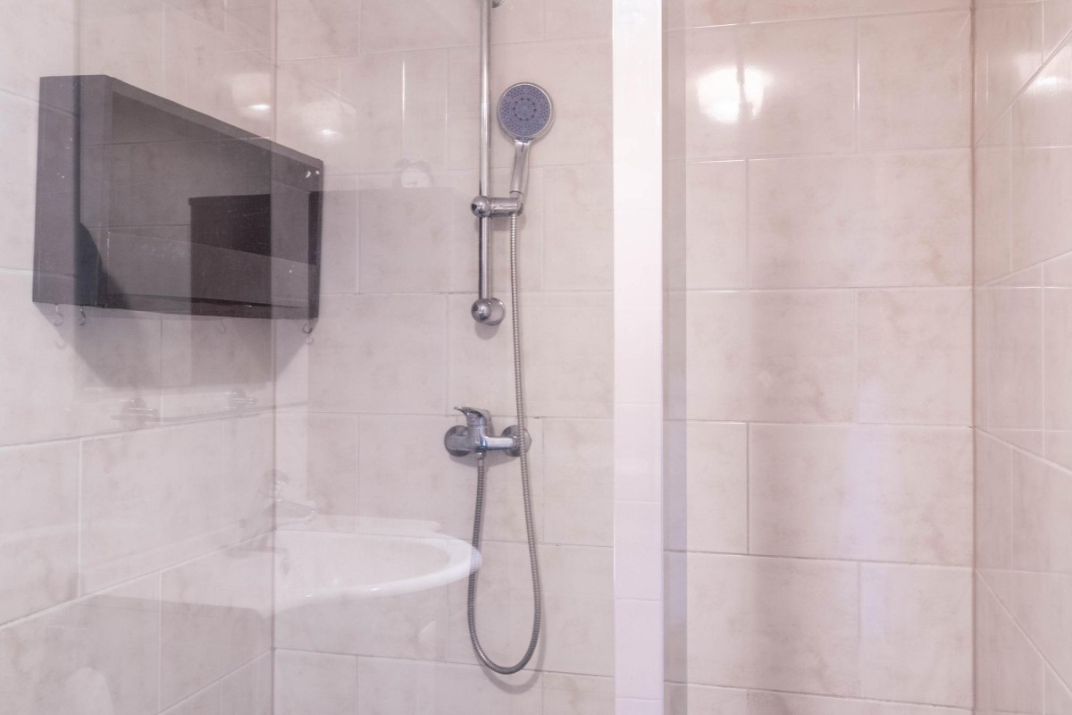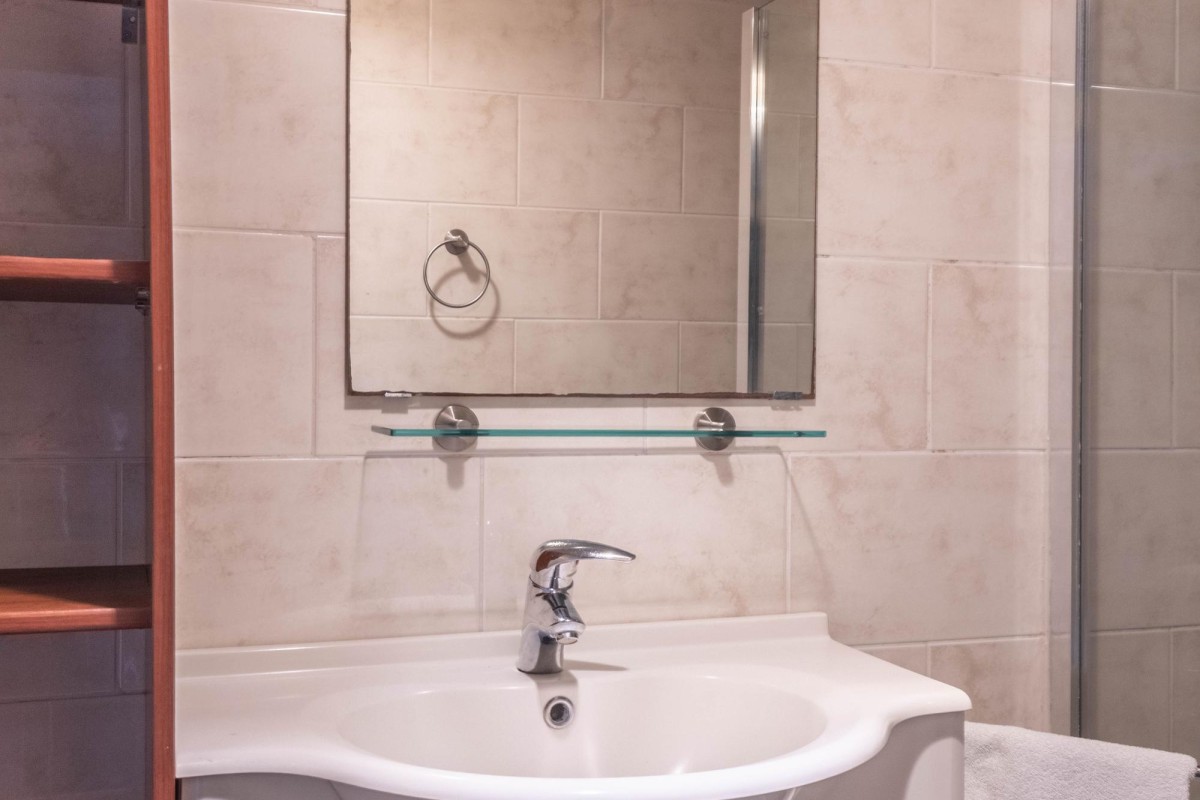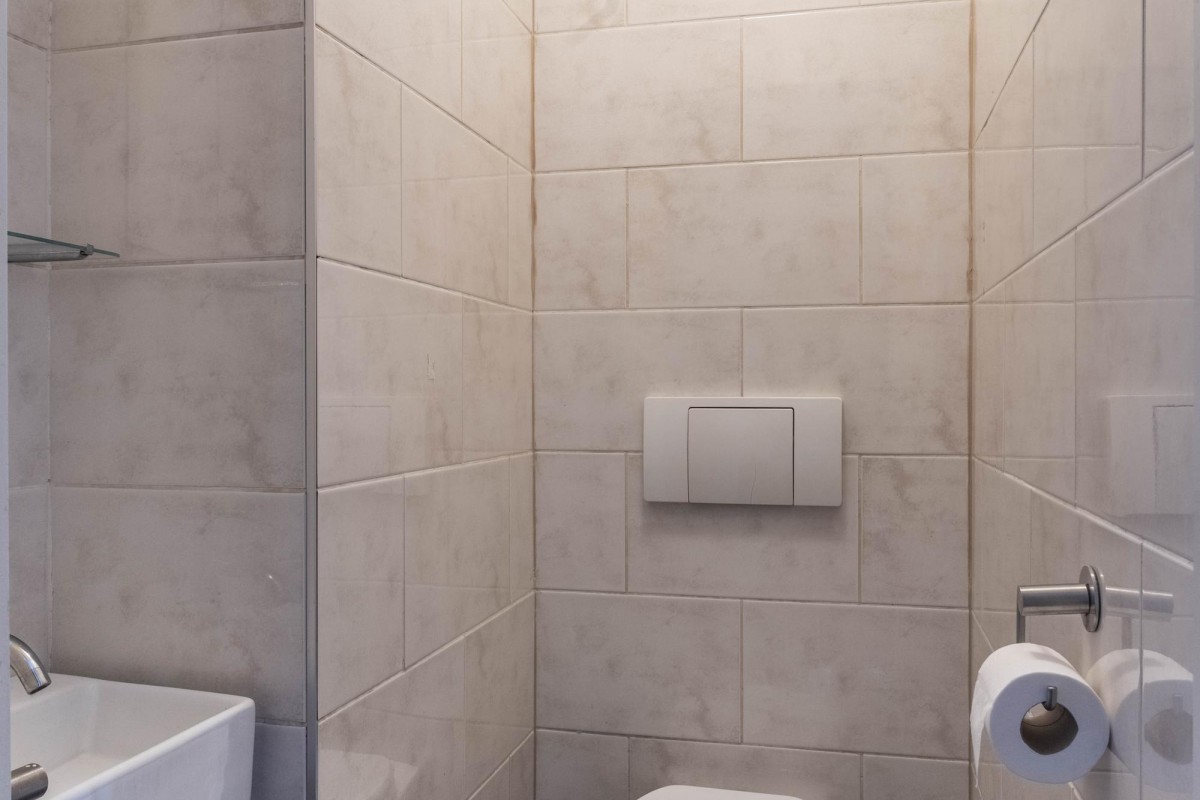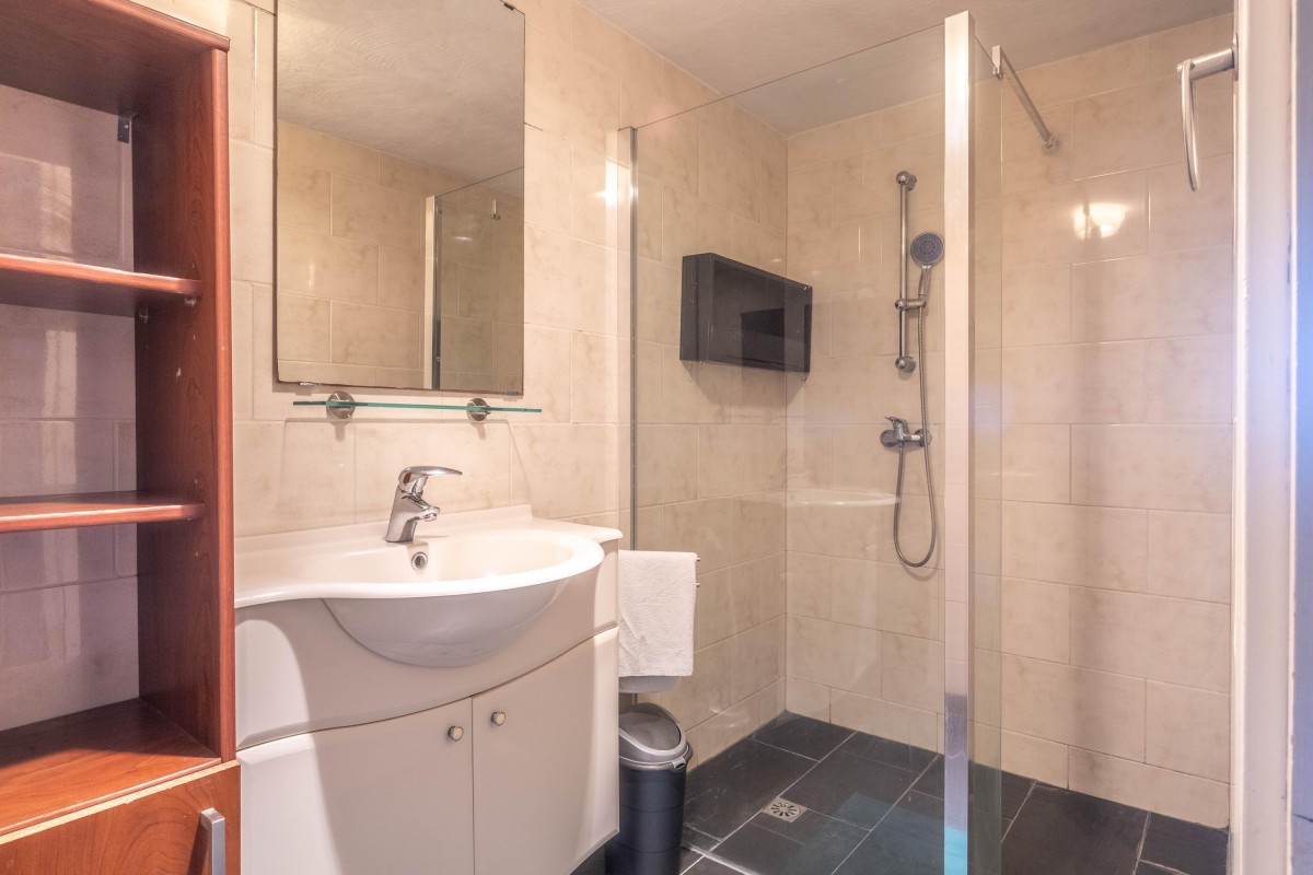 An internal staircase leads to the seventh floor. Through the spacious landing with a built-in storage cupboard, you have access to two large bedrooms and the spacious bathroom. The bathroom is equipped with a walk-in shower and a vanity unit.