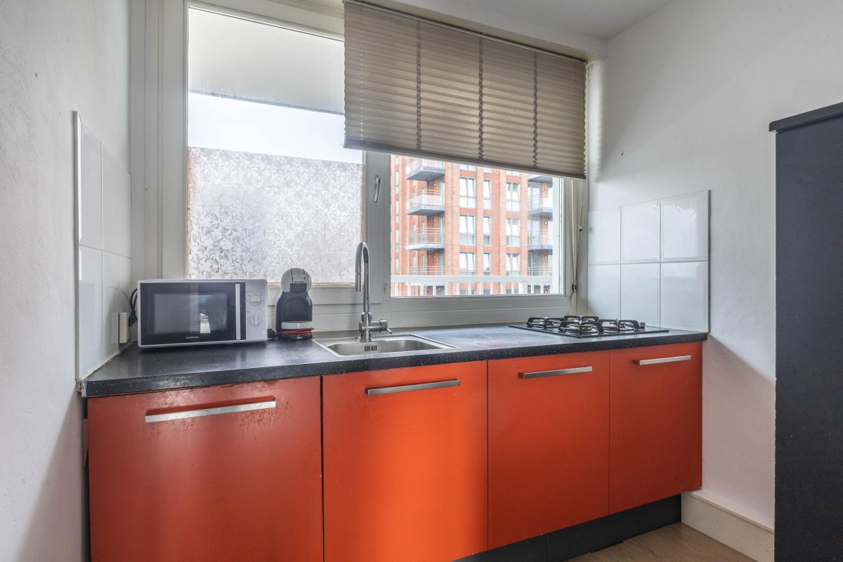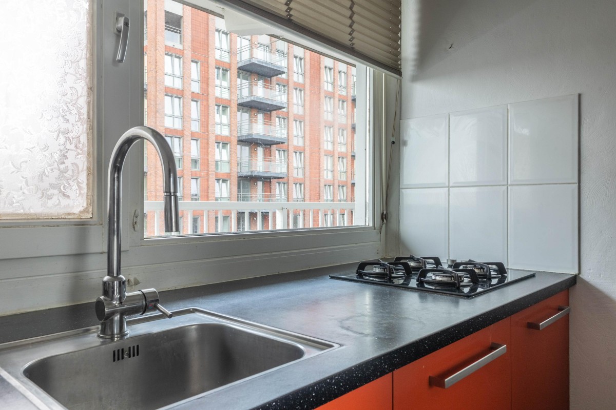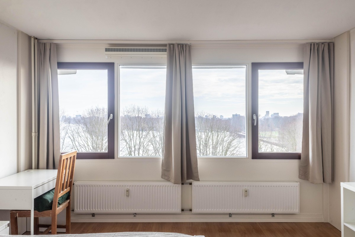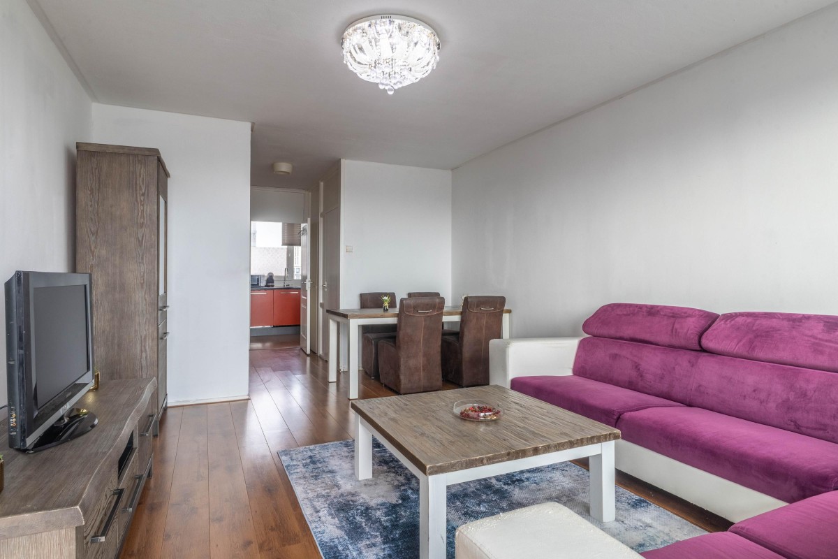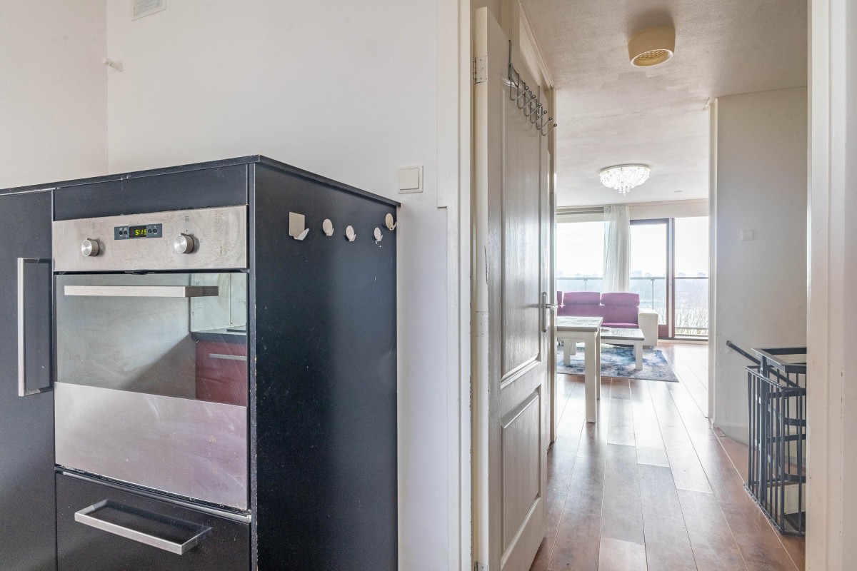 Lees verderThe kitchen is equipped with all necessary built-in appliances, such as a dishwasher, 4-burner gas stove with a designer extractor fan, refrigerator, and built-in oven. The separate toilet features a floating toilet and a washbasin. The living room is located above the tree line and offers an unobstructed view over Sloterplas and the center of Amsterdam. From the living room, you have access to the balcony.