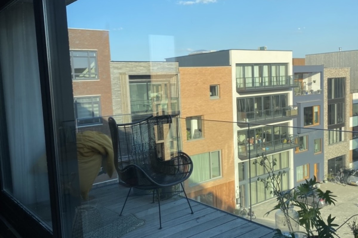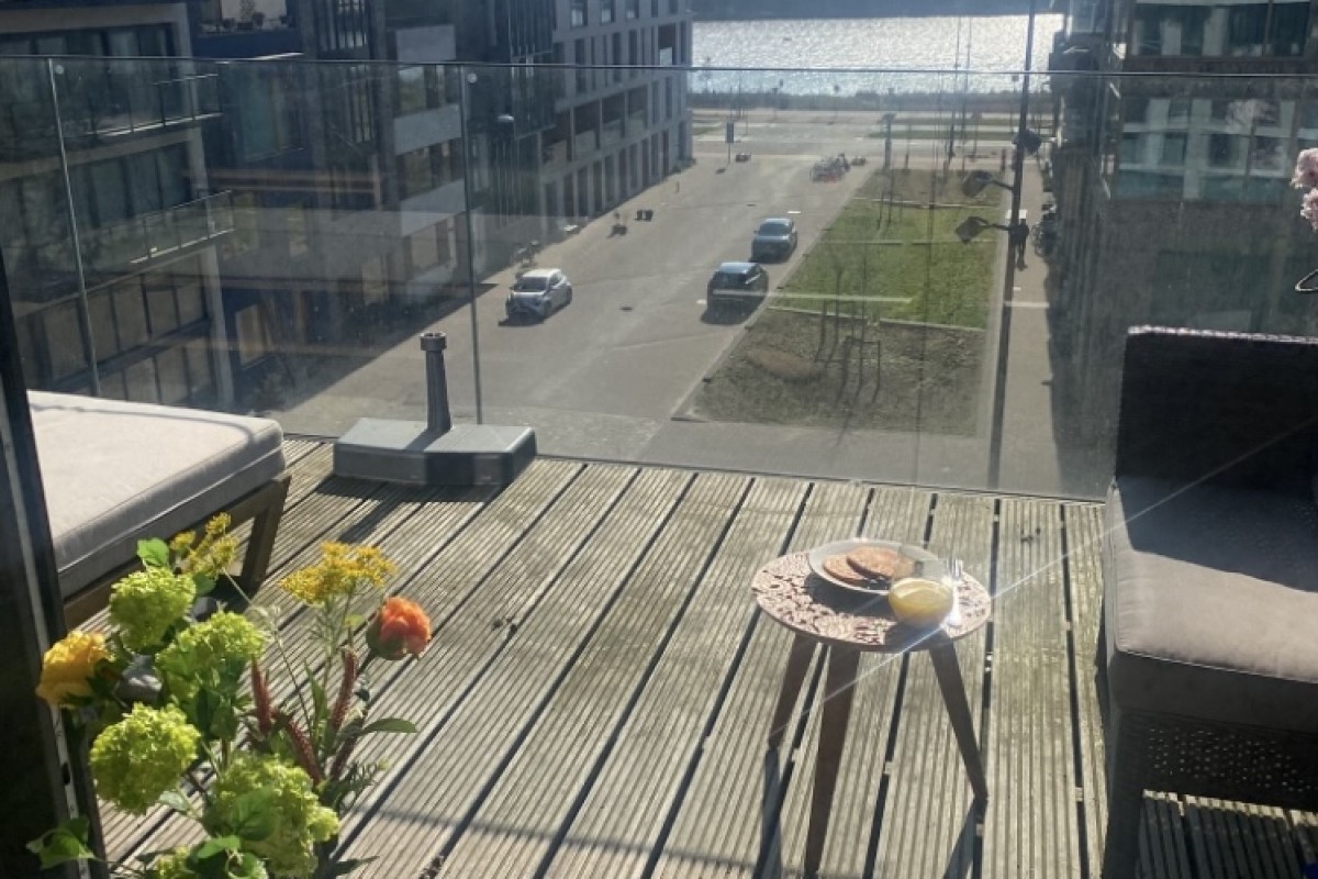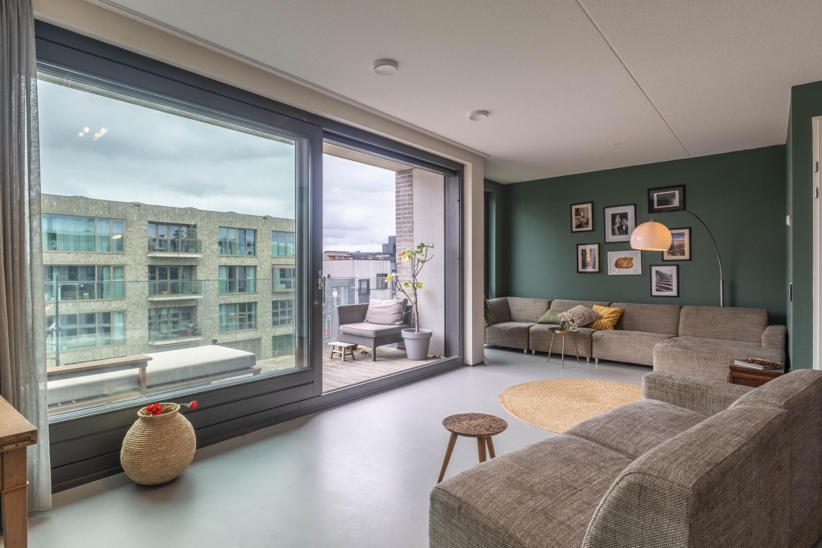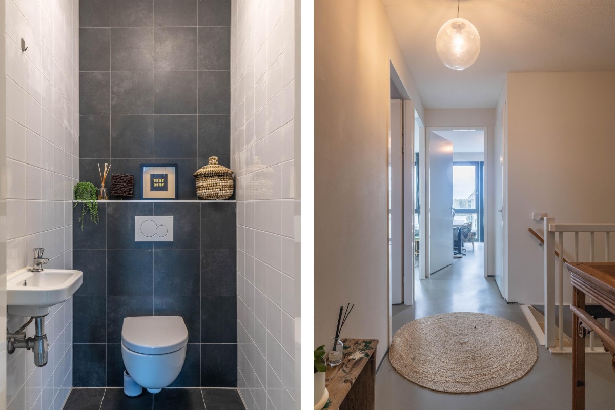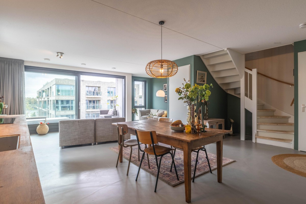 You immediately notice the character of this home when you enter. Living at the top of the building ensures peacefulness. Natural light floods the home all day through the large windows. The open living area feels spacious and comfortable – sleek yet warm. Through the sliding door, you step onto the balcony overlooking the water, a perfect spot to relax, start your day, or unwind in the evening. The kitchen is a place to be proud of. The sleek wooden countertop, calm design, and smart layout make it ideal for daily use as well as for hosting extended dinners. The property has a toilet on both the ground floor and the first floor. Additionally, the home features a beautiful, smooth poured floor, enhancing the effectiveness of the underfloor heating and cooling systems.