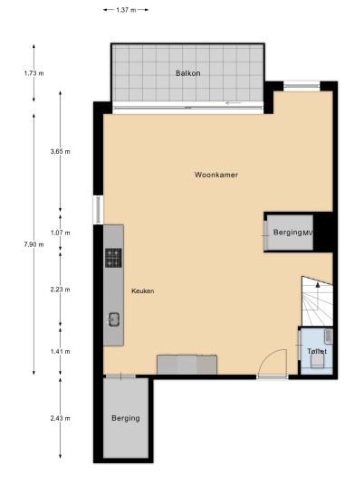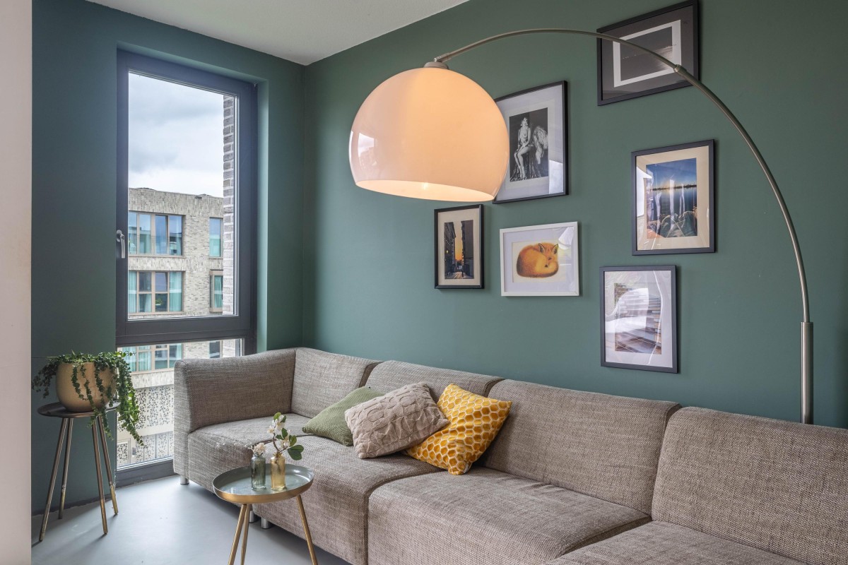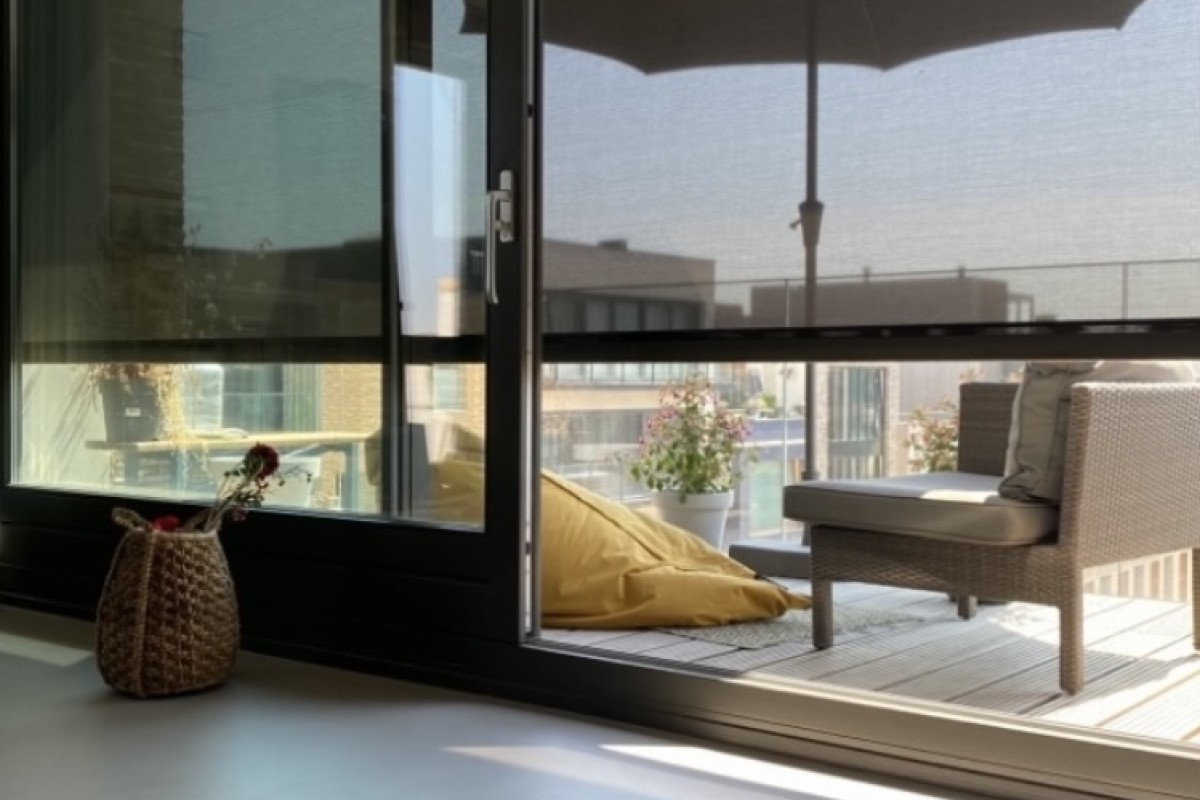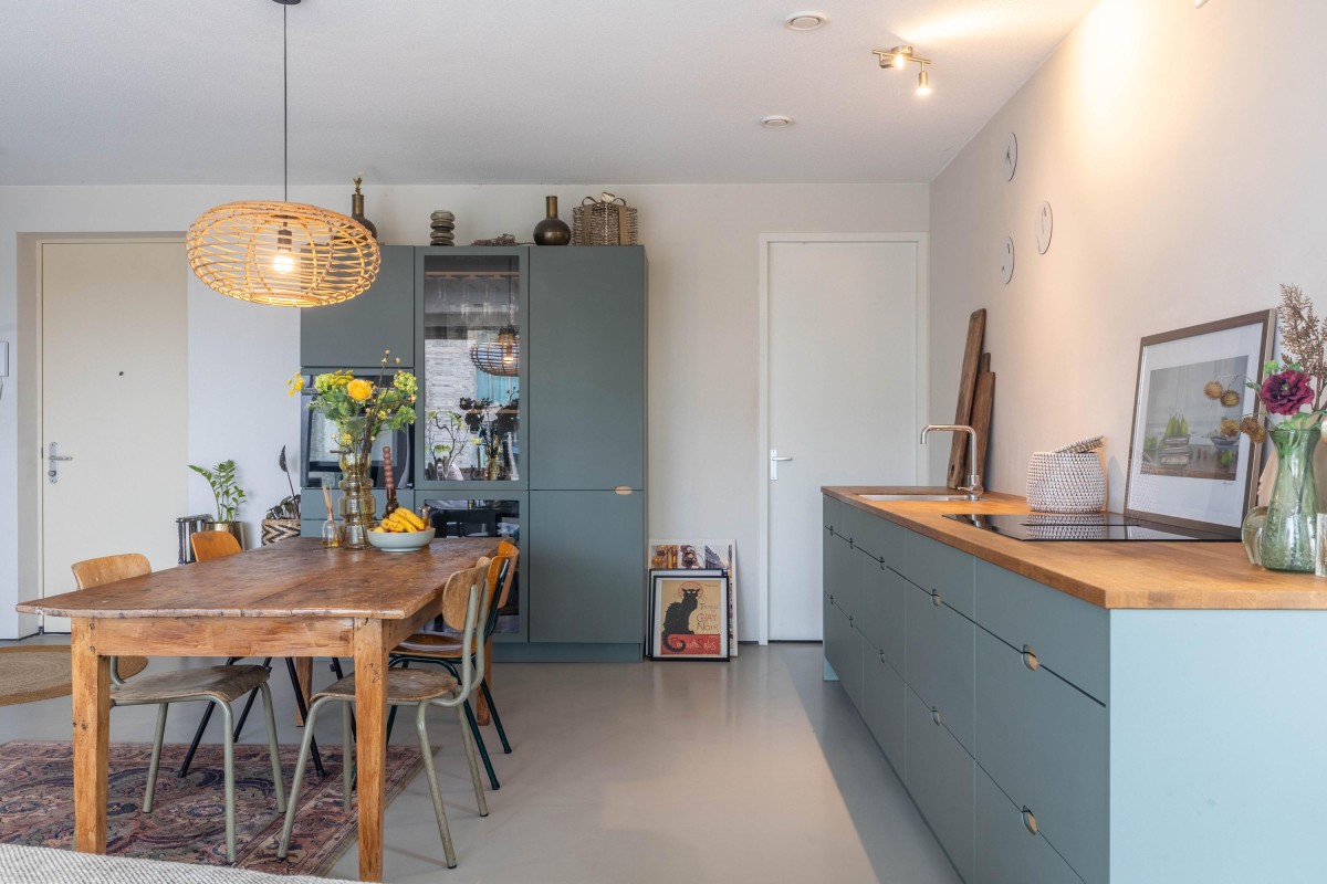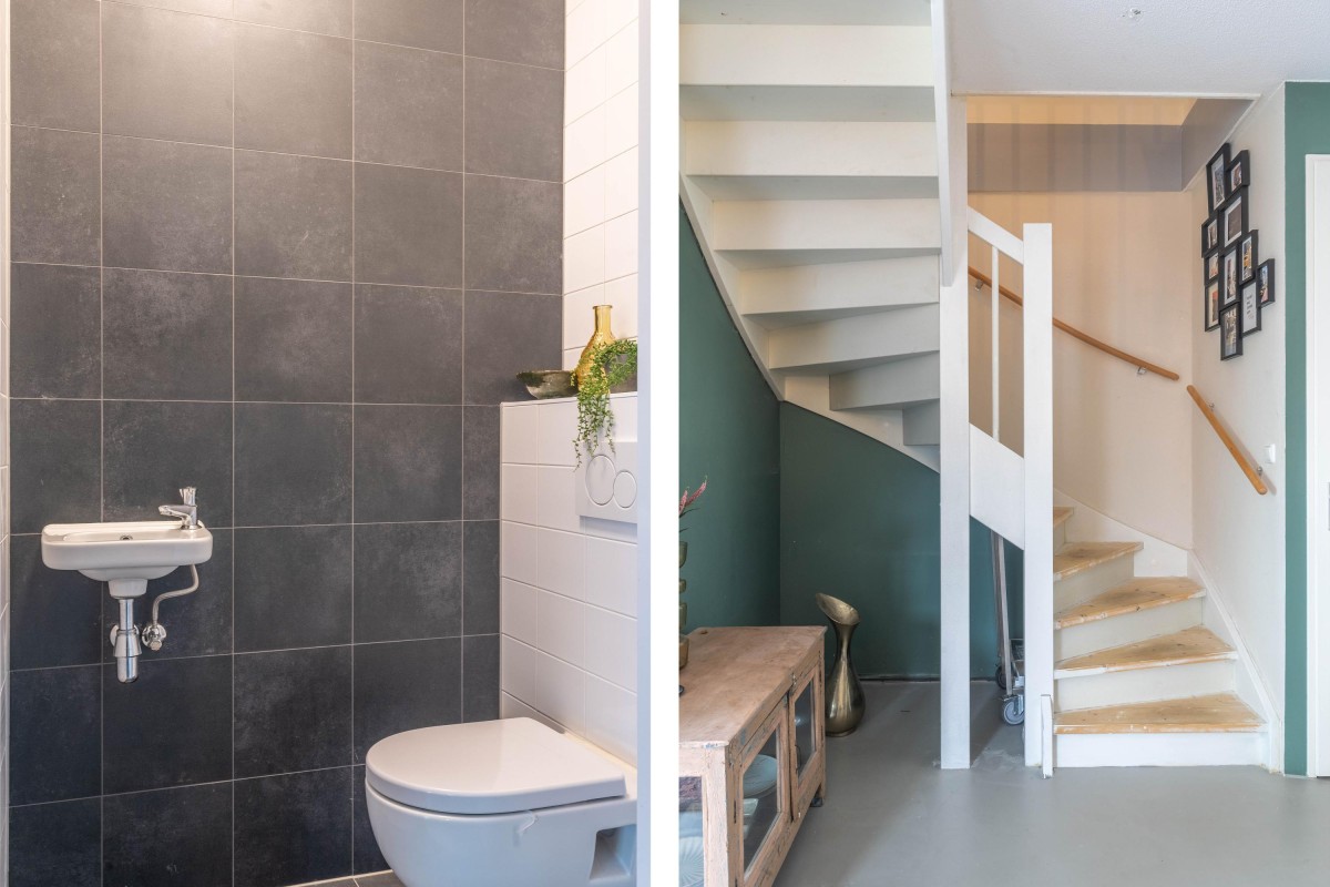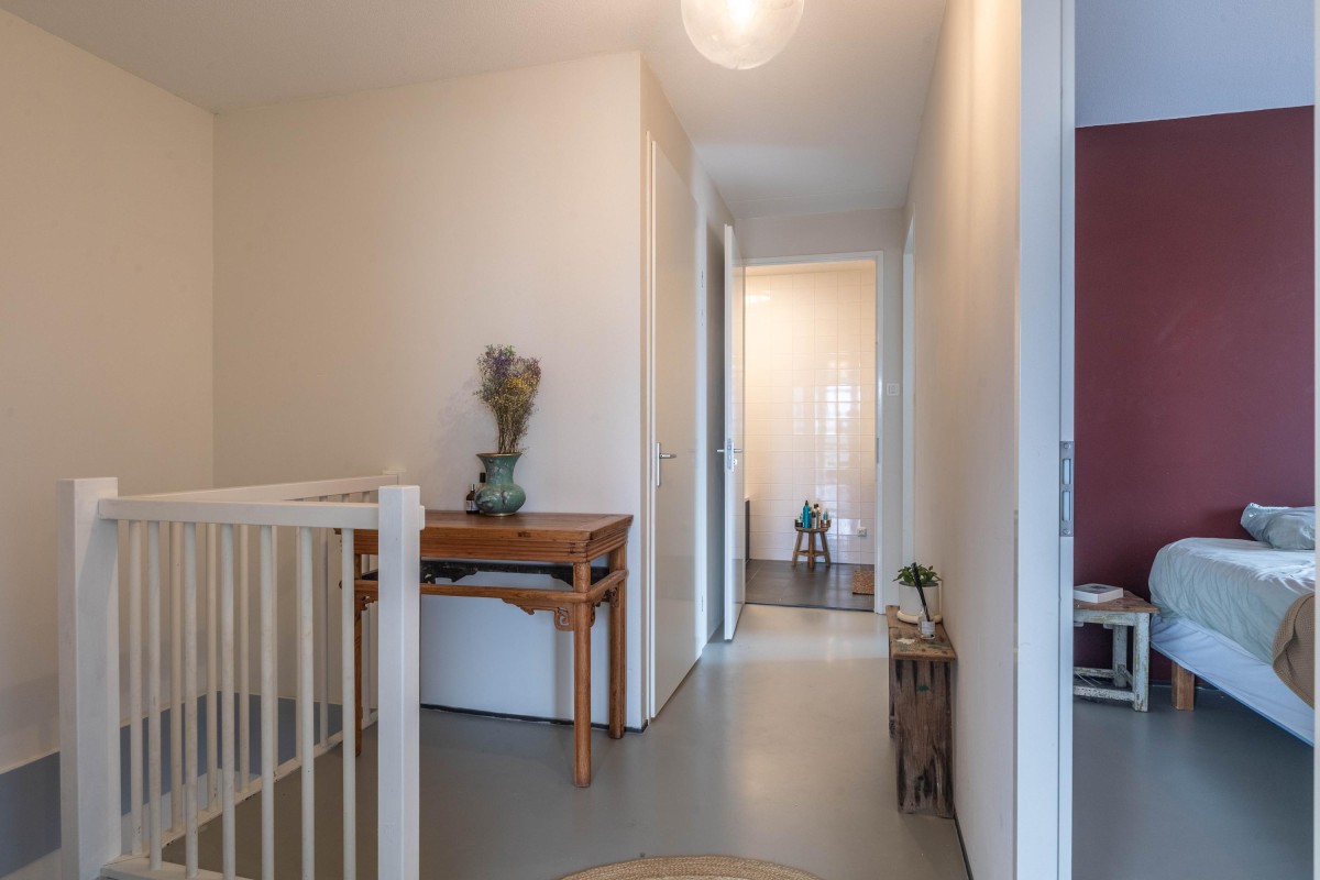 You immediately notice the character of this home when you enter. Living at the top of the building ensures peacefulness. Natural light floods the home all day through the large windows. The open living area feels spacious and comfortable – sleek yet warm. Through the sliding door, you step onto the balcony overlooking the water, a perfect spot to relax, start your day, or unwind in the evening. The kitchen is a place to be proud of. The sleek wooden countertop, calm design, and smart layout make it ideal for daily use as well as for hosting extended dinners. The property has a toilet on both the ground floor and the first floor. Additionally, the home features a beautiful, smooth poured floor, enhancing the effectiveness of the underfloor heating and cooling systems.