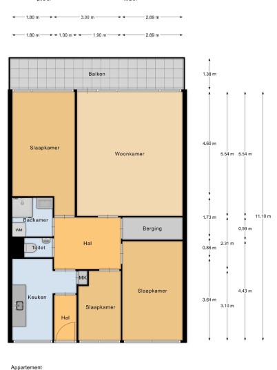 Lees verderAt the rear of the apartment, you’ll find the first bedroom and the living room with large windows and access to the west-facing balcony. The bathroom is equipped with a washbasin, washing machine connection, and shower. The toilet with a small sink is in a separate room. There is also a built-in storage room available for extra storage. At the front of the apartment are the remaining two bedrooms.