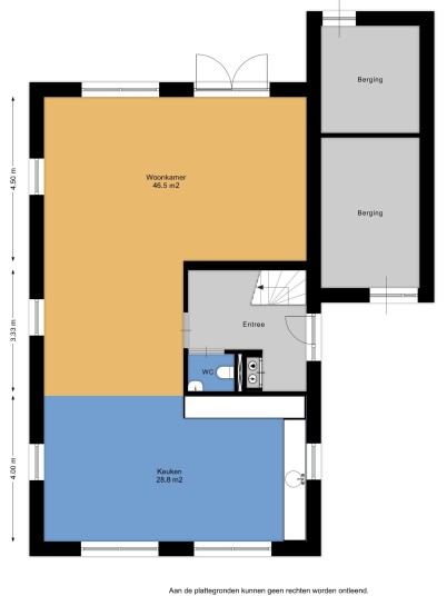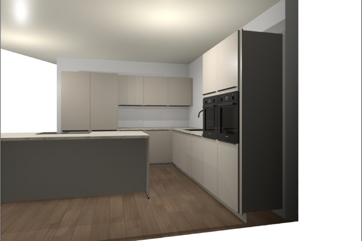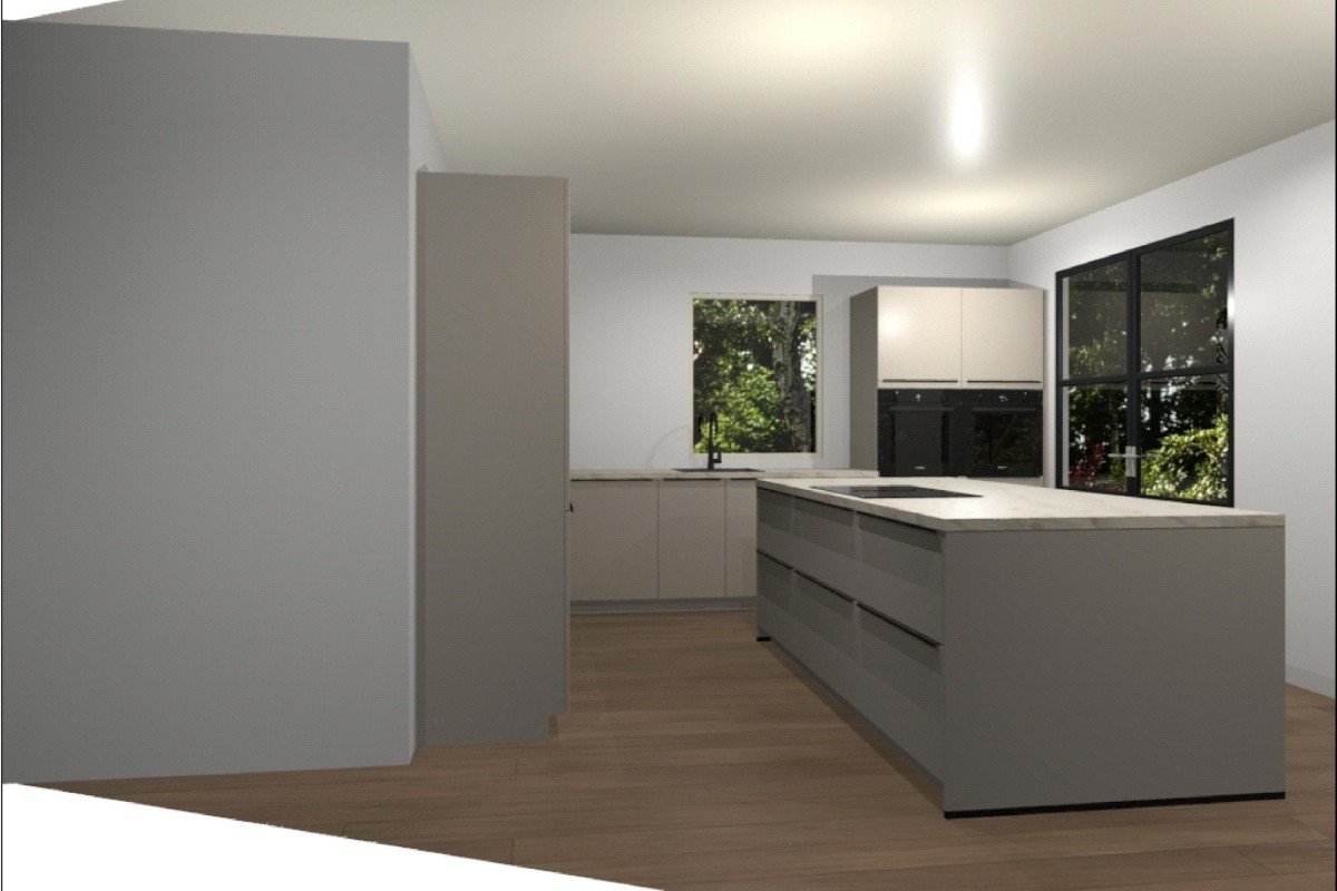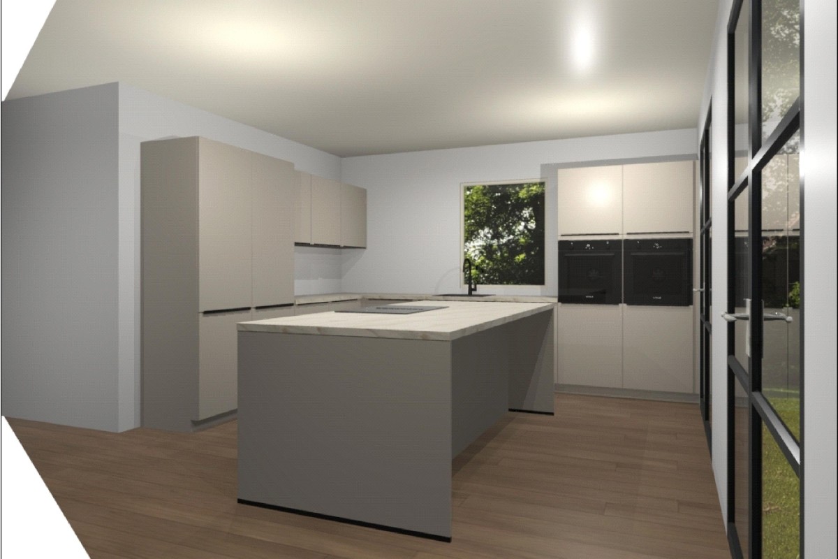 Entrance/hall with meter cupboard, toilet, and stairs leading to the first floor. The spacious living room is equipped with large windows, allowing plenty of natural light. The open kitchen provides ample space for a modern kitchen design.