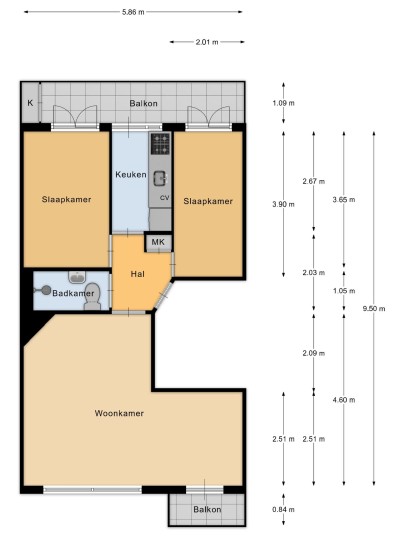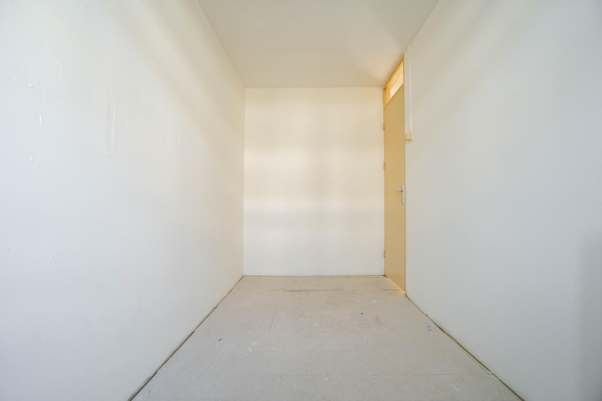 Lees verderFrom the living room, there is access to the balcony, which faces west. From the hallway, you reach the kitchen at the rear of the apartment, which is equipped with a basic kitchen unit and a gas connection. The central heating system is also located in the kitchen. Both the kitchen and the bedrooms have direct access to the apartment-wide balcony, which faces east. There is also a practical storage cupboard on the balcony. The two bedrooms are situated at the rear. The bathroom, which can be accessed from the hallway, includes a shower, washbasin, and toilet.